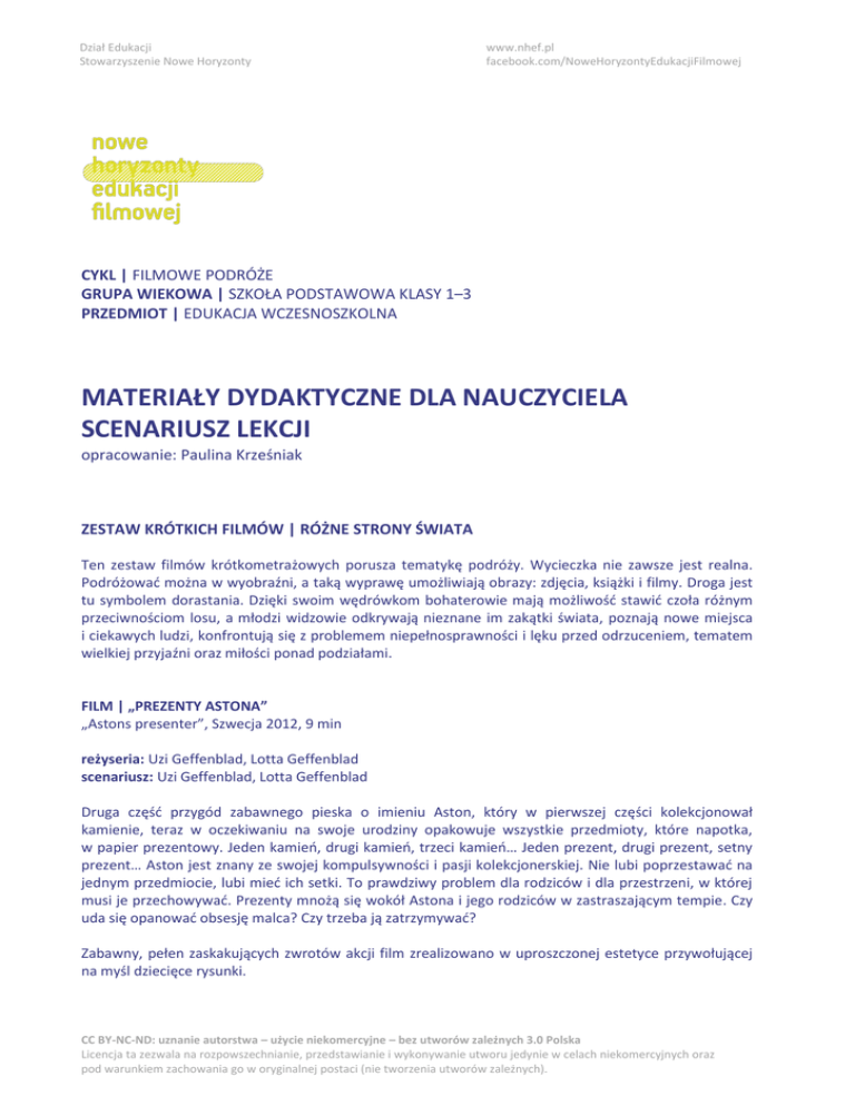 Dział Edukacji Stowarzyszenie Nowe Horyzonty www.nhef.pl facebook.com/NoweHoryzontyEdukacjiFilmowej CYKL | FILMOWE PODRÓŻE GRUPA WIEKOWA | SZKOŁA PODSTAWOWA KLASY 1–3 PRZEDMIOT | EDUKACJA WCZESNOSZKOLNA MATERIAŁY DYDAKTYCZNE DLA NAUCZYCIELA SCENARIUSZ LEKCJI opracowanie: Paulina Krześniak ZESTAW KRÓTKICH FILMÓW | RÓŻNE STRONY ŚWIATA Ten zestaw filmów krótkometrażowych porusza tematykę podróży. Wycieczka nie zawsze jest realna. Podróżować można w wyobraźni, a taką wyprawę umożliwiają obrazy: zdjęcia, książki i filmy. Droga jest tu symbolem dorastania. Dzięki swoim wędrówkom bohaterowie mają możliwość stawić czoła różnym przeciwnościom losu, a młodzi widzowie odkrywają nieznane im zakątki świata, poznają nowe miejsca i ciekawych ludzi, konfrontują się z problemem niepełnosprawności i lęku przed odrzuceniem, tematem wielkiej przyjaźni oraz miłości ponad podziałami. FILM | „PREZENTY ASTONA” „Astons presenter”, Szwecja 2012, 9 min reżyseria: Uzi Geffenblad, Lotta Geffenblad scenariusz: Uzi Geffenblad, Lotta Geffenblad Druga część przygód zabawnego pieska o imieniu Aston, który w pierwszej części kolekcjonował kamienie, teraz w oczekiwaniu na swoje urodziny opakowuje wszystkie przedmioty, które napotka, w papier prezentowy. Jeden kamień, drugi kamień, trzeci kamień… Jeden prezent, drugi prezent, setny prezent… Aston jest znany ze swojej kompulsywności i pasji kolekcjonerskiej. Nie lubi poprzestawać na jednym przedmiocie, lubi mieć ich setki. To prawdziwy problem dla rodziców i dla przestrzeni, w której musi je przechowywać. Prezenty mnożą się wokół Astona i jego rodziców w zastraszającym tempie. Czy uda się opanować obsesję malca? Czy trzeba ją zatrzymywać? Zabawny, pełen zaskakujących zwrotów akcji film zrealizowano w uproszczonej estetyce przywołującej na myśl dziecięce rysunki. CC BY-NC-ND: uznanie autorstwa – użycie niekomercyjne – bez utworów zależnych 3.0 Polska Licencja ta zezwala na rozpowszechnianie, przedstawianie i wykonywanie utworu jedynie w celach niekomercyjnych oraz pod warunkiem zachowania go w oryginalnej postaci (nie tworzenia utworów zależnych). FILM | „NIESPODZIANKA” „The Present”, Niemcy 2015, 5 min reżyseria: Jacob Frey scenariusz: Jacob Frey Obsypany nagrodami film w zaskakujący sposób opowiada o niepełnosprawności. Jake całe dnie spędza, grając w gry na konsoli. Nie chce wychodzić z domu. Kiedy dostaje szczeniaka, w ogóle się nie cieszy, odtrąca go. Psiak bardzo chce się zaprzyjaźnić i bawić, nie poddaje się też w swoich staraniach. Czy jego radość i entuzjazm przekonają Jake’a? Czy chłopiec zrzuci swoją maskę? FILM | „WSTYD I OKULARY” „Shame and glasses”, Włochy 2013, 7 min reżyseria: Alessandro Riconda scenariusz: Alessandro Riconda Mirko nie może rozwiązać zadań na sprawdzianie, ponieważ nie widzi dobrze z bliska. Oczywiście mógłby założyć okulary, jednak bardzo zależy mu na akceptacji i odwzajemnionych uczuciach jednej dziewczynki z klasy. Jest przekonany, że jako okularnik nie będzie miał u niej żadnych szans. Pół godziny walczy ze sobą i szuka sposobu na założenie okularów tak, żeby nikt tego nie zauważył. Jakie jest jego zdziwienie, kiedy obiekt jego uczuć w pewnym momencie sam zakłada na nos… okulary! Ten króciutki fabularny film bez dialogów w najprostszy sposób opowiada o lęku przed odrzuceniem i potrzebie akceptacji. FILM | „ŚNIEG” „Neige”, Francja 2015, 26 min reżyseria: Antoine Lanciaux, Sophie Roze scenariusz: Antoine Lanciaux, Pierre-Luc Granjon Miasto niespodziewanie sparaliżowane jest przez śnieg. Szkoły zostają zamknięte, nie działają telefony, ulice są nieprzejezdne. Pearl rano pojechała na szkolną wycieczkę. Mama nie może się dodzwonić do wychowawcy i denerwuje się, czy wszystko w porządku. Z rodzicami został młodszy Simeon. W śnieżycy mają wypadek i niszczą samochodem sanie eskimoskiej rodziny. Simeon szybko zaprzyjaźnia się z małym Kudlukiem, a jego rodzice w tym czasie pomagają złożyć deski i proponują naprawę u siebie w domu. Rodziny jednoczą się, problemy stają się wspólne, a pomaganie sobie naturalne. Kiedy jedna z eskimosek zaczyna rodzić, mama Simeona jedzie z nią do igloo, w domu zostaje Simeon z tatą i Kudluk z babcią. Zwierzęta przynoszą wiadomość, że coś stało się z Pearl. Kudluk z Simeonem ruszają na jej poszukiwania. „Śnieg” to film pełen magii, który udowadnia, że przyjaźń i serdeczność nie znają barier językowych czy narodowościowych. CC BY-NC-ND: uznanie autorstwa – użycie niekomercyjne – bez utworów zależnych 3.0 Polska Licencja ta zezwala na rozpowszechnianie, przedstawianie i wykonywanie utworu jedynie w celach niekomercyjnych oraz pod warunkiem zachowania go w oryginalnej postaci (nie tworzenia utworów zależnych). 2 PODRÓŻE KSZTAŁCĄ Temat lekcji Podróże kształcą. Czas trwania lekcji 45 min Cele lekcji Podczas lekcji uczeń: → → → → → → → → → rozmawia na temat przyjaźni, współpracy, pomagania sobie nawzajem, niepełnosprawności, nieśmiałości, wstydu, kompleksów, metod porozumiewania się oraz radości ze wspólnego spędzania czasu; poznaje różne techniki i formy filmowe; poznaje mapę Europy; rozwija umiejętność samodzielnego myślenia; rozwija umiejętność tworzenia krótkich wypowiedzi ustnych; uczestniczy w rozmowie: zadaje pytania, udziela odpowiedzi, przedstawia poglądy i pomysły; wzbogaca wyobraźnię; rozwija spostrzegawczość; rozwija umiejętność współpracy. Metody i formy pracy Podczas lekcji nauczyciel wykorzystuje następujące metody i formy pracy z uczniem: → → → → → → ćwiczenie z mapą; skojarzenia; pogadanka; karta pracy; element dramy; praca z klasą, w grupach oraz indywidualna. Środki dydaktyczne Podczas lekcji nauczyciel wykorzystuje następujące środki dydaktyczne: → → 