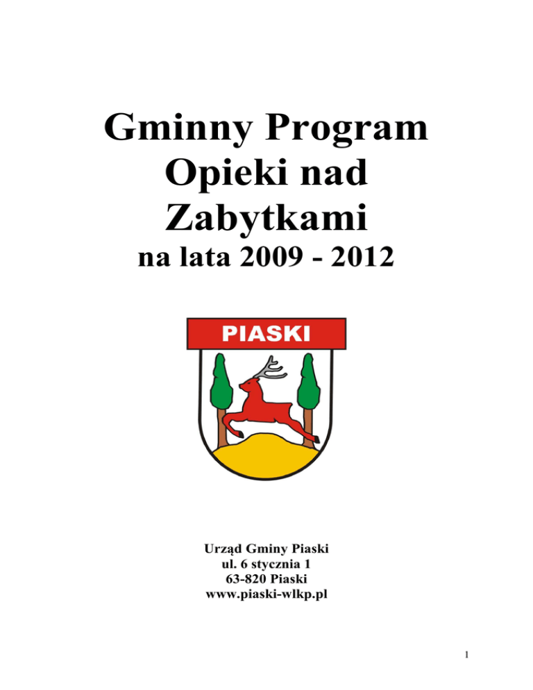 Gminny Program Opieki nad Zabytkami na lata 2009 - 2012 Urząd Gminy Piaski ul. 6 stycznia 1 63-820 Piaski www.piaski-wlkp.pl 1 Spis treści 1. WSTĘP 1.1. Cel opracowania gminnego programu opieki nad zabytkami 1.2. Podstawa prawna opracowania gminnego programu opieki nad zabytkami 2. UWARUNKOWANIA ZEWNĘTRZNE OCHRONY ZASOBÓW DZIEDZICTWA KULTUROWEGO. 2.1. Relacje gminnego programu opieki nad zabytkami z opracowaniami wykonanymi na poziomie województwa. 2.2. Opracowania wykonane na poziomie województwa 2.3. Dokumenty związane z dziedzictwem kulturowym o zasięgu gminnym 3. ZASOBY DZIEDZICTWA I KRAJOBRAZU KULTUROWEGO GMINY 3.1. Obiekty zabytkowe nieruchome o najwyższym znaczeniu dla gminy (wpisane do rejestru zabytków – wykaz) 3.2. Wykaz obiektów zabytkowych nieruchomych (gminna ewidencja zabytków – wykaz) 3.3. Zespoły najcenniejszych zabytków ruchomych na terenie gminy (wpisane do rejestru zabytków) 3.4. Krajobraz kulturowy 3.4.1 Wykaz parków na terenie gminy Piaski włączonych do ewidencji zabytków 3.4.2 Wykaz zabytkowych cmentarzy na terenie gminy Piaski włączonych do ewidencji zabytków 3.4.3. Zobrazowanie rozmieszczenia istotnych składników krajobrazu kulturowego. 3.5. Zabytki archeologiczne 3.5.1. Wykaz stanowisk archeologicznych wpisanych do rejestru zabytków. 3.5.2. Wykaz stanowisk o własnej formie krajobrazowej. 3.5.3. Zestawienie liczbowe zewidencjonowanych stanowisk archeologicznych łącznie z ich funkcją oraz krótką analizą chronologiczną (opis koncentracji stanowisk archeologicznych – uwarunkowania fizjograficzne). 3.6. Ewidencja zabytków 4. UWARUNKOWANIA WEWNĘTRZNE OCHRONY ZASOBÓW DZIEDZICTWA I KRAJOBRAZU KULTUROWEGO 4.1. Stan zachowania i obszary największego zagrożenia zabytków 4.1.1. Stan zachowania zabytków nieruchomych wpisanych do rejestru zabytków 4.1.2. Stan zachowania zabytków ruchomych 4.1.3. Stan zachowania zabytków archeologicznych oraz istotne zagrożenia dla zabytków archeologicznych. 4.1.4. Obszary największego zagrożenia dla zabytków w gminie. 4.2. Uwarunkowania wynikające ze studium uwarunkowań i kierunków zagospodarowania przestrzennego gminy 4.3. Uwarunkowania wynikające z miejscowych planów zagospodarowania przestrzennego na terenie gminy Piaski. 4.4. Uwarunkowania wynikające z uwarunkowań ochrony przyrody i równowagi ekologicznej. 4.5. Uwarunkowania wewnętrzne ochrony zabytków archeologicznych. 5. CELE GMINNEGO PROGRAMU OPIEKI NAD ZABYTKAMI 2 6. KIERUNKI DZIAŁAŃ DLA REALIZACJI GMINNEGO PROGRAMU OPIEKI NAD ZABYTKAMI. 6.1. Gminna ewidencja zabytków 6.1.1. Sporządzenie gminnej ewidencji zabytków nieruchomych 6.1.2. Sporządzenie gminnej ewidencji zabytków archeologicznych 6.1.3. Inwentaryzacja obiektów tzw. małej architektury 6.1.4. Udostępnianie i promocja zabytków nieruchomych 6.1.5. Edukacja w zakresie ochrony dziedzictwa kulturowego 6.1.6. Zahamowanie procesów degradacji zabytków i doprowadzenie do poprawy stanu ich zachowania. 6.2. Rozpoznanie perspektyw tworzenie parków kulturowych na terenie gminy 6.3. Sporządzenie wykazu obszarów urbanistycznych, ruralistycznych, obszarów krajobrazu kulturowego, otoczenia układów, zespołów i obiektów nieruchomych, stanowisk archeologicznych do rejestru zabytków z terenu gminy. 6.4. Załącznik graficzny z oznaczeniem obszarów chronionych oraz stref występowania stanowisk archeologicznych. 6.5. Określenie zasobów zabytków obszarów, nieruchomych, ruchomych i dziedzictwa archeologicznego, które można wykorzystać dla tworzenia tras turystycznych, ścieżek dydaktycznych, organizacji festynów, itp. 6.6. Określenie sposobu realizacji poszczególnych celów gminnego programu opieki zawartych w punkcie 5. 7. PODZIAL NA OBSZARY, PROJEKTY, ZADANIA. 7.1. Aktualizacja i uzupełnienie Gminnej Ewidencji Zabytków 7.2. Inwentaryzacja obiektów małej infrastruktury sakralnej 7.3. Oznakowanie obiektów zabytkowych i określenie zasad ich udostępniania 7.4. Podejmowanie działań w zakresie odnowy zabytków 7.5. Promocja zabytków Gminy Piaski 8. INSTRUMENTARIUM REALIZACJI GMINNEGO PROGRAMU OPIEKI NAD ZABYTKAMI 9. MONITORING GMINNEGO PROGRAMU OPIEKI NAD ZABYTKAMI. 10. NIEKTÓRE ZEWNETRZNE ŹRÓDŁA FINANSOWANIA GMINNEGO PROGRAMU OPIEKI NAD ZABYTKAMI. 3 1. Wstęp Dziedzictwo kulturowe jest jedną z najważniejszych wartości lokalnej społeczności. Tworzy ono tożsamość grupy społecznej i ukazuje jej bogactwo i korzenie, z których się wywodzi. Tworzy więzi między mieszkańcami i uczy szacunku wobec tego, co zostało przez lata wypracowane. Zabytki są nie tylko śladem działalności przeszłych pokoleń, ale też istotnym składnikiem kultury współczesnej, przyczyniając się do kształtowania przyjaznego człowiekowi otoczenia. 1.1. Cel opracowania gminnego programu opieki nad zabytkami. Działania związane z opieką nad zabytkami oraz wykorzystaniem zasobów środowiska kulturowego stanowią jedno z ważniejszych działań samorządu. Wprawdzie wiele zabytków nie jest własnością gminy i nie jest możliwe pokrycie z gminnego budżetu wszystkich potrzeb związanych z renowacją i zabezpieczaniem zabytków, to władzom samorządowym zależy na tym, by w jak najlepszym stanie zachować dziedzictwo kulturowe gminy Piaski. Wszelkie procesy rozwojowe muszą zatem zachodzić z poszanowaniem dóbr kultury i architektury oraz w zgodzie z przyrodą, która jest jednym z najważniejszych atutów naszego regionu. Dlatego też Gminny Program Opieki nad Zabytkami ma spełniać funkcję kontrolną i zabezpieczającą wobec tego, co pozostało z przeszłości w naszym otoczeniu, co powinniśmy chronić i przekazać następnym pokoleniom. Mamy również nadzieję, że Program stanie się w przyszłości pomocą w pozyskiwaniu zewnętrznych środków finansowych przeznaczonych na renowację i wykonanie koniecznych prac związanych z ochroną zabytków na naszym terenie. Nadrzędnym celem gminnego programu opieki nad zabytkami jest poprawa stanu dz