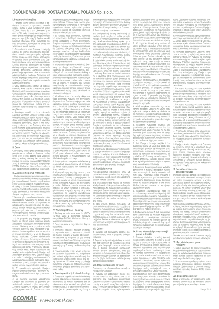 Ogólne warunkI DOstaw eCOMal POlanD sp. z o.o. I. Postanowienia ogólne 1. Poniższe ogólne warunki obowiązują w odniesieniu do wszystkich zaproszeń do zawarcia umowy, dostaw i usług świadczonych przez ECOMAL Poland Sp. z o.o. („Dostawca”) na rzecz spółki, osoby prawnej utworzonej na podstawie prawa publicznego lub innego podmiotu gospodarczego („Kupujący”). Ogólne warunki handlowe stosowane przez Kupującego nie mają zastosowania, nawet jeżeli nie zostały one wyłączone w sposób wyraźny. 2. Ceny wskazane przez Dostawcę obowiązują przez 30 dni od chwili przedstawienia zaproszenia do zawarcia umowy; po upływie powyższego terminu mogą one ulec zmianie. Zaproszenie do zawarcia umowy przedstawione przez Dostawcę nie stanowi oferty w rozumieniu polskiego Kodeksu cywilnego. Zobowiązanie do realizacji dostawy następuje na podstawie potwierdzenia przyjęcia zamówienia. Zamówienie złożone przez Kupującego stanowi ofertę w rozumieniu polskiego Kodeksu cywilnego. Zamówienie jest uznane za przyjęte wyłącznie na podstawie przesłanego potwierdzenia przyjęcia zamówienia lub przesłania towarów. 3. Opisy robót lub usług, broszury lub podobne materiały, które zostały przedstawione przez Dostawcę przed zawarciem umowy, uzgodnione wymiary i wagi nie stanowią gwarancji jakości lub niezmienności przy braku pisemnego porozumienia w tym zakresie, lecz są jedynie opisami produktów. W przypadku udzielania gwarancji jakości lub niezmienności, zostaną one przedłożone przez Dostawcę wraz z odpowiednimi certyikatami. 4. Kosztorysy, rysunki oraz inne dokumenty pozostają własnością Dostawcy i mogą zostać udostępnione osobom trzecim wyłącznie na podstawie uprzedniej zgody Dostawcy. W przypadku niezłożenia zamówienia, rysunki i inne dokumenty przekazane przez Dostawcę, które stanowią integralną część zaproszenia do zawarcia umowy, na żądanie Dostawcy powinny zostać mu niezwłocznie zwrócone. Powyższe ma odpowiednie zastosowanie do dokumentów Kupującego; przy czym, możliwe jest udostępnienie takich dokumentów osobom trzecim, którym Dostawca, za zgodą przekazał realizację dostaw lub usług. II. Ceny Ceny i opłaty podane przez Dostawcę zostaną powiększone o podatek od towarów i usług (VAT). Ceny i opłaty podane przez Dostawcę dotyczą realizacji dostawy, bez montażu lub instalacji, na zasadzie ex-works (INCOTERMS® 2010) z centralnego magazynu europejskiego ECOMAL Kirchzarten, Niemcy. Ceny i opłaty podane przez Dostawcę nie obejmują opakowania. III. Zastrzeżenie prawa własności 1. Dostawca zastrzega prawo własności dostawy (towarów, w odniesieniu do których zastrzegane jest prawo własności) do czasu zaspokojenia w pełnej wysokości wszelkich roszczeń dotyczących zapłaty za dostawę. Zastrzeżenie prawa własności ma również zastosowanie do wymiany lub części zamiennych, o ile w wyniku instalacji nie staną się one głównymi komponentami. 2. W czasie gdy prawo własności towarów zostaje zastrzeżone, Kupującemu nie zezwala się na dokonanie zastawu towarów lub ich przelewu na zabezpieczenie. Kupujący ma prawo do odsprzedaży towarów ramach regularnych transakcji gospodarczych, wyłącznie pod warunkiem, że otrzyma płatność od własnego klienta lub zastrzeże prawo własności towarów. 3. a) W przypadku gdy Kupujący odsprzeda towary, do których prawo własności zostało zastrzeżone, Kupujący jest zobowiązany przelać na rzecz Dostawcy swoje przyszłe roszczenia dotyczące płatności z tytułu odsprzedaży w odniesieniu do własnego klienta wraz ze wszystkimi prawami pochodnymi – w tym do dokonania bilansu płatniczego. Odrębne oświadczenia zostaną złożone przez Kupującego w odniesieniu do określonego roszczenia lub określonych kategorii roszczeń niezwłocznie po sprecyzowaniu roszczenia oraz klienta. W przypadku odsprzedaży towarów wraz z innymi przedmiotami bez wyodrębnienia cen jednostkowych, Kupujący jest zobowiązany przelać na rzecz Dostawcy część roszczenia odpowiadającą cenie towarów, do których prawo własności zostało zastrzeżone, z pierwszeństwem przed pozostałymi roszczeniami o zapłatę, które nie były przedmiotem przelewu. b) W uzasadnionych sytuacjach, Kupujący przekaże Dostawcy informacje i dokumenty wymagane w celu dochodzenia jego praw wobec klienta. c) Do momentu odwołania upoważnienia Kupujący jest uprawniony do pobierania przeniesionych płatności z tytułu odsprzedaży. Z ważnej przyczyny, w sytuacji, gdy Kupujący zastrzega prawo własności, Dostawca ma prawo do odwołania upoważnienia Kupującego do pobierania płatności. Dostawca może zagrozić ujawnieniem przelewu wierzytelności w odpowiednim uzgodnionym okresie, wykorzystać przelane płatności i zażądać od Kupującego ujawnienia własnemu klientowi cesji praw. 4. a) Kupujący może przetwarzać, przerabiać lub łączyć towary, do których prawo własności zostało zastrzeżone, z innymi przedmiotami. Powyższe czynności są wykonywane w imieniu Dostawcy. Kupujący, bez dodatkowej odpłatności dla Dostawcy, zabezpieczy nowy przedmiot, a wykonując powyższe, zastosuje środki ostrożności właściwe dla przedsiębiorcy działającego z należytą starannością. Przetworzone, przerobione lub połączone przedmioty podlegają zastrzeżeniu prawa własności. b) W przypadku opisanym w punkcie a), Dostawcy przysługuje współwłasność nowego przedmiotu do wartości przetworzonych, przerobionych lub połączonych towarów, do których prawo własności zostało zastrzeżone, proporcjonalnie do wartości pozostałych przetworzonych przedmiotów w czasie przetwarzania, przerabiania lub łączenia. W przypadku, gdy Kupujący nabędzie wyłączne prawo własności do nowego przedmiotu, Kupujący przyzna Dostawcy prawo współwłasności według zasad określonych w zdaniu poprzedzającym. c) W odniesieniu do odsprzedaży takiego nowego przedmiotu, Kupujący 