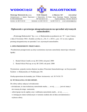 WODOCIĄGI Wodociągi Białostockie Sp. z o.o. BIAŁOSTOCKIE 15-404 Białystok ul. Młynowa 52/1 www.wobi.pl Zarejestrowana w Sądzie Rejonowym w Białymstoku, XII Wydz. Gosp. Krajowego Rejestru Sądowego Nr KRS 0000024985 NIP 542-020-01-22 Kapitał zakładowy: 165.530. 000,00 zł Centrala - tel. 085 74 58 100 Sekretariat - tel. 085 74 58 101 fax 085 74 58 113 e-mail: [email protected] Ogłoszenie o przetargu nieograniczonym na sprzedaż używanych samochodów. „Wodociągi Białostockie” Sp. z o.o. w Białymstoku na podstawie art. 70 1 i nast. Ustawy z dnia 23 kwietnia 1964 r. Kodeks cywilny (t. j. Dz. U. z 2014 r., poz. 121 ze zm.) ogłasza przetarg nieograniczony na sprzedaż 2 szt. używanych samochodów. I. OPIS PRZEDMIOTU PRZETARGU. Przedmiotem postępowania są niżej wymienione używane samochody stanowiące własność Spółki: 1. Skoda Felicia Combi; nr rej. BI 12444; rok prod. 2000 2. Skoda Felicia Pick-up; nr rej. BI 12445; rok prod. 2000 Wymienione pojazdy można obejrzeć na placu Warsztatu Samochodowego na Oczyszczalni Ścieków w Białymstoku ul. Produkcyjna 102. Osobą uprawniona do kontakty jest: Wiktor Arcimowicz tel. 58 74 58 175 II. WYMAGANIA CO DO OFERT. Do oferty należy załączyć oświadczenie: - oświadczam, że stan techniczny samochodu marka...... nr rej.............. jest mi znany i nie wnoszę do niego zastrzeżeń, - zobowiązuje się do zapłaty ceny i odebrania samochodu marki.... nr rej .............. w istniejącym stanie technicznym w terminie siedmiu dni od dnia zawiadomienia o wyborze oferty. Termin związania ofertą: 20 dni licząc wraz z dniem składania ofert. Ofertę należy złożyć w formie pisemnej w zamkniętej kopercie w sekretariacie Spółki, ul. Młynowa 52/1 do dnia 7.08.2015 r. do godz. 12:30 z dopiskiem „samochód używany (...)” i wpisać markę i nr rej. samochodu. Publiczne otwarcie ofert nastąpi w siedzibie Spółki ul. Młynowa 52/1 ( świetlica ) dn. 7.08.2015 o godz 13:00. III. INNE POSTANOWIENIA Organizator: - nie ponosi żadnych kosztów związanych z sprzedażą samochodów, - nie udziela gwarancji na sprzedawane samochody. Organizator zastrzega sobie prawo zamknięcia przetargu bez wyboru którejkolwiek z ofert.