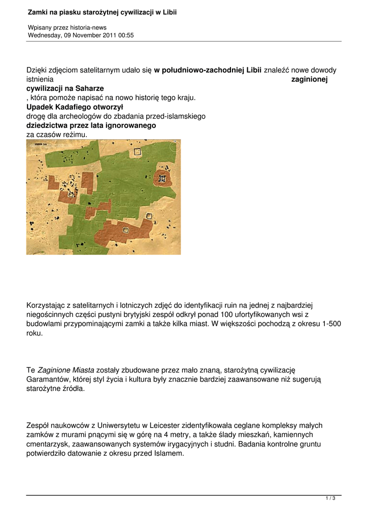 Zamki na piasku starożytnej cywilizacji w Libii Wpisany przez historia-news Wednesday, 09 November 2011 00:55 Dzięki zdjęciom satelitarnym udało się w południowo-zachodniej Libii znaleźć nowe dowody istnienia zaginionej cywilizacji na Saharze , która pomoże napisać na nowo historię tego kraju. Upadek Kadafiego otworzył drogę dla archeologów do zbadania przed-islamskiego dziedzictwa przez lata ignorowanego za czasów reżimu. Korzystając z satelitarnych i lotniczych zdjęć do identyfikacji ruin na jednej z najbardziej niegościnnych części pustyni brytyjski zespół odkrył ponad 100 ufortyfikowanych wsi z budowlami przypominającymi zamki a także kilka miast. W większości pochodzą z okresu 1-500 roku. Te Zaginione Miasta zostały zbudowane przez mało znaną, starożytną cywilizację Garamantów, której styl życia i kultura były znacznie bardziej zaawansowane niż sugerują starożytne źródła. Zespół naukowców z Uniwersytetu w Leicester zidentyfikowała ceglane kompleksy małych zamków z murami pnącymi się w górę na 4 metry, a także ślady mieszkań, kamiennych cmentarzysk, zaawansowanych systemów irygacyjnych i studni. Badania kontrolne gruntu potwierdziło datowanie z okresu przed Islamem. 1/3 Zamki na piasku starożytnej cywilizacji w Libii Wpisany przez historia-news Wednesday, 09 November 2011 00:55 To mniej więcej tak, jakby ktoś przyjechał do Anglii i nagle odkrył średniowieczne zamki. Te osady nie były nigdy zarejestrowane za czasów Kaddafiego. - powiedział David Mattingly, profesor rzymskiej archeologii z Uniwersytety w Leicester. Zdjęcia satelitarne dały nam możliwość pokrycia dużego obszaru. Dowody sugerują, że klimat się przez lata nie zmienił i widzimy, że ten nieprzyjazny krajobraz z zerowymi opadami były niegdyś bardzo gęsto zabudowany i uprawiany. To zupełnie wyjątkowe starożytne krajobrazy zarówno pod względem zasięgu, jak i stanu, w jakim się zachowały - powiedział dr Martin Sterry, również z Uniwersytetu w Leicester. Znalezisko staje w opozycji do wzmianek z czasów rzymskich opowiadających o barbarzyńskich nomadach i mąciwodów na granicy Cesarstwa Rzymskiego. W rzeczywistości byli znacznie bardziej cywilizowani, mieszkając w dużych grodach obronnych głównie jako rolnicy. To było zorganizowane państwo z miastami i wsiami, z pisanym językiem i najnowocześniejszymi technologiami. Garamantowie byli pionierami w tworzeniu oaz i otwarcia transsaharyjskiego handlu. - powiedział profesor Mattingly. Profesor i jego zespół zostali zmuszeni do opuszczenia Libii w lutym, kiedy rozpoczął się bunt przeciwko reżimowi Kadafiego. Mają jednak nadzieję powrócić na miejsce, jak tylko przywrócone zostanie bezpieczeństwo w kraju. W projekt jest mocno zaangażowany libijski departament starożytności, mocno niedofinansowany w okresie minionego reżimu. Fundusze na badania pochodziły z Europejskiej Rady ds. Badań, która przyznała grant w wysokości 2/3 Zamki na piasku starożytnej cywilizacji w Libii Wpisany przez historia-news Wednesday, 09 November 2011 00:55 prawie 2,5 mln euro. To nowy początek dla służb zajmujących się libijską starożytnością i szansa dla Libijczyków na zaangażowanie się w długo tłumioną historię własnego narodu. Garamantowie powinni być podstawą tego, co libijskie dzieci będą się uczyć w szkole o historii i dziedzictwie swego kraju. - uważa profesor Mattingly. Czytaj artykuł źródłowy 3/3