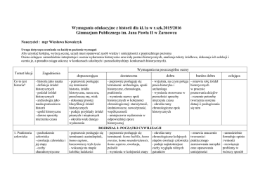 Wymagania edukacyjne z historii dla kl.1a w r.szk.2015/2016 Gimnazjum Publicznego im. Jana Pawła II w Żarnowcu Nauczyciel : mgr Wiesława Kowalczyk Uwaga dotycząca oceniania na każdym poziomie wymagań Aby uzyskać kolejną, wyższą ocenę, uczeń musi opanować zasób wiedzy i umiejętności z poprzedniego poziomu Ocena celująca: samodzielnie interpretuje i ocenia wydarzenia historyczne oraz rolę postaci historycznych, analizuje teksty źródłowe, dokonuje ich selekcji i ocenia je, a ponadto osiąga sukcesy w konkursach szkolnych i pozaszkolnych(np. konkursach historycznych). Wymagania na poszczególne oceny Temat lekcji Co to jest historia? 1. Prahistoria człowieka Zagadnienia - historia jako nauka - definicja źródeł historycznych - podział źródeł historycznych - archeologia jako nauka pomocnicza historii - epoki historyczne - dawne sposoby mierzenia czasu - pochodzenie człowieka - ewolucja człowieka i jej etapy - cechy charakterystyczne dopuszczająca - poprawnie posługuje się terminami: historia, źródło historyczne, nasza era, przed naszą erą, wiek - dokonuje prostej klasyfikacji źródeł historycznych - podaje przykłady źródeł pisanych i niepisanych - określa wiek danego wydarzenia dostateczna - poprawnie posługuje się terminami: archeologia, epoki historyczne, chronologia, prahistoria - wymienia nazwy epok historycznych w kolejności chronologicznej: starożytność, średniowiecze, nowożytność, współczesność - umiejscawia wydarzenia w odpowiedniej epoce historycznej dobra bardzo dobra - wyjaśnia, na czym polega praca historyka i archeologa - wymienia stosowane w przeszłości sposoby mierzenia czasu - określa ramy chronologiczne epok historycznych - omawia rolę źródeł historycznych w procesie poznawania dziejów - rozumie potrzebę tworzenia systemu datacji i posługiwania się nim ROZDZIAŁ I: POCZĄTKI CYWILIZACJI - poprawnie posługuje się - poprawnie posługuje się - określa ramy terminami: australopitek, terminami: homo habilis, homo chronologiczne kolejnych homo sapiens, erectus, homo neandertalensis, etapów ewolucji człowieka koczowniczy tryb życia homo sapiens, ewolucja, - podaje najistotniejsze - wskazuje na mapie paleolit cechy wyglądu różnych kolebkę ludzkości - wymienia w kolejności etapy gatunków - omawia znaczenie tworzenia i praktycznego zastosowania narzędzi oraz opanowania umiejętności celująca - samodzielnie formułuje opinie i wnioski - rozwiązuje problemy w twórczy sposób poszczególnych gatunków człowiekowatych - osiągnięcia człowieka pierwotnego Tajemnice sprzed wieków – Jak zbadano pochodzenie człowieka? 2. Czas wielkich przemian - teorie dotyczące powstania człowieka - Karol Darwin i jego odkrycie - zadania antropologii - wpływ zmian klimatu na życie człowieka - rewolucja neolityczna - początki rolnictwa i hodowli - pierwsze osady - budowle megalityczne - początek metalurgii - przedstawia główne założenia teorii Karola Darwina - wymienia teorie dotyczące powstania człowieka - poprawnie posługuje się terminami: rewolucja neolityczna, osiadły tryb życia, osada, epoka brązu, epoka żelaza - przedstawia zmiany, które zaszły w życiu człowieka w okresie neolitu - podaje nazwy metali ewolucji człowieka - opisuje warunki życia ludzi w czasach prahistorycznych - podaje nazwy najważniejszych wynalazków człowieka z czasów prahistorycznych człowiekowatych i ich umiejętności - wskazuje na mapie kierunki i trasy ekspansji gatunku ludzkiego - poprawnie posługuje się terminami: ewolucjonizm, antropologia - opisuje, czym zajmuje się antropolog - omawia sposoby ustalania wieku znalezisk - omawia teorię ewolucji Karola Darwina - wyjaśnia różnice między teorią kreacjonizmu a ewolucjonizmu - poprawnie posługuje się terminami: neolit, megalit - określa ramy chronologiczne rewolucji neolitycznej - opisuje życie codzienne ludzi przed rewolucją neolityczną - omawia sposób wytopu brązu i żelaza - przedstawia wpływ zmian klimatycznych na tryb życia człowieka pierwotnego - omawia tryb życia i zajęcia ludzi epoki neolitu - nazywa i lokalizuje na mapie pozostałości najstarszej znanej osady ludzkiej krzesania ognia dla rozwoju człowieka - wyjaśnia, na czym polegała zależność człowieka od przyrody - wymienia przyczyny powstania pierwszych dzieł sztuki praludzi - przedstawia znaczenie badań naukowych oraz wykorzystania różnych technologii dla poznania historii człowieka - omawia tryb życia i zajęcia ludzi epoki neolitu - charakteryzuje wygląd osad neolitycznych - opisuje wygląd i funkcje budowli megalitycznych - wykazuje dużą aktywność w czasie zajęć - prezentuje argumenty zwolenników i przeciwników ewolucjonizmu Ponadto: - samodzielnie formułuje opinie i wnioski - rozwiązuje problemy w twórczy sposób - wykazuje dużą aktywność w czasie zajęć - uzasadnia słuszność określenia rewolucja dla zmian, które zaszły w życiu człowieka w okresie neolitu wykorzystywanych przez praludzi do wytopu broni, narzędzi, ozdób 3. W kraju Sumerów 4. Babilonia i Asyria - położenie geograficzne i warunki naturalne Mezopotamii - powstanie pierwszych państw - organizacja państwa Sumerów - osiągnięcia cywilizacji sumeryjskiej - państwo babilońskie - Hammurabi i jego kodeks prawny - Babilon - państwo asyryjskie - wskazuje na mapie miejsce położenia najbardziej znanej budowli megalitycznej - wyjaśnia, jakie zmiany nastąpiły w życiu człowieka dzięki opanowaniu umiejętności wytopu metali - poprawnie posługuje się terminami: cywilizacja, Mezopotamia, system irygacyjny, Sumerowie, miasto-państwo - lokalizuje na mapie Mezopotamię - omawia położenie geograficzne i warunki naturalne panujące w Mezopotamii - wymienia osiągnięcia Sumerów - podaje ramy chronologiczne istnienia cywilizacji sumeryjskiej - poprawnie posługuje się terminami: Żyzny Półksiężyc, król-kapłan, zikkurat - określa rolę rzek w starożytnej Mez