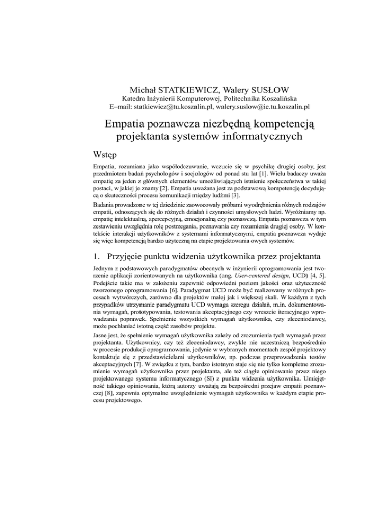 Michał STATKIEWICZ, Walery SUSŁOW Katedra Inżynierii Komputerowej, Politechnika Koszalińska E–mail: [email protected], [email protected] Empatia poznawcza niezbędną kompetencją projektanta systemów informatycznych Wstęp Empatia, rozumiana jako współodczuwanie, wczucie się w psychikę drugiej osoby, jest przedmiotem badań psychologów i socjologów od ponad stu lat [1]. Wielu badaczy uważa empatię za jeden z głównych elementów umożliwiających istnienie społeczeństwa w takiej postaci, w jakiej je znamy [2]. Empatia uważana jest za podstawową kompetencję decydującą o skuteczności procesu komunikacji między ludźmi [3]. Badania prowadzone w tej dziedzinie zaowocowały próbami wyodrębnienia różnych rodzajów empatii, odnoszących się do różnych działań i czynności umysłowych ludzi. Wyróżniamy np. empatię intelektualną, apercepcyjną, emocjonalną czy poznawczą. Empatia poznawcza w tym zestawieniu uwzględnia rolę postrzegania, poznawania czy rozumienia drugiej osoby. W kontekście interakcji użytkowników z systemami informatycznymi, empatia poznawcza wydaje się więc kompetencją bardzo użyteczną na etapie projektowania owych systemów. 1. Przyjęcie punktu widzenia użytkownika przez projektanta Jednym z podstawowych paradygmatów obecnych w inżynierii oprogramowania jest tworzenie aplikacji zorientowanych na użytkownika (ang. User-centered design, UCD) [4, 5]. Podejście takie ma w założeniu zapewnić odpowiedni poziom jakości oraz użyteczność tworzonego oprogramowania [6]. Paradygmat UCD może być realizowany w różnych procesach wytwórczych, zarówno dla projektów małej jak i większej skali. W każdym z tych przypadków utrzymanie paradygmatu UCD wymaga szeregu działań, m.in. dokumentowania wymagań, prototypowania, testowania akceptacyjnego czy wreszcie iteracyjnego wprowadzania poprawek. Spełnienie wszystkich wymagań użytkownika, czy zleceniodawcy, może pochłaniać istotną część zasobów projektu. Jasne jest, że spełnienie wymagań użytkownika zależy od zrozumienia tych wymagań przez projektanta. Użytkownicy, czy też zleceniodawcy, zwykle nie uczestniczą bezpośrednio w procesie produkcji oprogramowania, jedynie w wybranych momentach zespół projektowy kontaktuje się z przedstawicielami użytkowników, np. podczas przeprowadzenia testów akceptacyjnych [7]. W związku z tym, bardzo istotnym staje się nie tylko kompletne zrozumienie wymagań użytkownika przez projektanta, ale też ciągłe opiniowanie przez niego projektowanego systemu informatycznego (SI) z punktu widzenia użytkownika. Umiejętność takiego opiniowania, którą autorzy uważają za bezpośredni przejaw empatii poznawczej [8], zapewnia optymalne uwzględnienie wymagań użytkownika w każdym etapie procesu projektowego. 160 Michał Statkiewicz, Walery Susłow Projektowanie aplikacji zorientowanych na użytkownika (a więc trzymanie się paradygmatu UCD) jest wyzwaniem, szczególnie dla młodych niedoświadczonych projektantów. Wymaga ono uzyskania szczegółowych informacji o docelowej grupie użytkowników, ich preferencjach oraz umiejętnościach. Wymaga jednocześnie znalezienia rozwiązań spełniających wymagania użytkownika wśród tych dostępnych dla projektanta – ale tak, aby preferencje projektanta nie rzutowały na dokonywany wybór. Aby podołać temu wyzwaniu, trzeba osiągnąć stan przy którym mentalny model działania systemu, rozumiany jako zbiór zasad określających zachowanie się systemu w interakcji z użytkownikiem, był przynajmniej częściowo zgodny z mentalnym modelem działania użytkownika (patrz rys. 1), bazującym na jego (użytkownika) przyzwyczajeniach i umiejętnościach [6]. Rys. 1. Powiązanie modelu użytkownika z modelem aplikacji Fig. 1. Connection between an user model and an application model Wiele metodologii projektowych przewiduje odpowiednie procedury, zapewniające umiarkowaną „neutralność” względem preferencji projektanta [9] – jednak podejścia „zwinne” (ang. agile) zwykle dopuszczają dość swobodny proces projektowy. Metodyki zwinne, popularne w małych i średnich zespołach programistycznych, dopuszczają przez to pojawienie się elementów modelu działania projektanta w modelu działania aplikacji. Objawia się to np. stosowaniem w dialogach z użytkownikiem słownictwa branżowego (informatycznego) i niejasnych dla użytkownika metafor lub zbyt mało szczegółowymi opisami funkcji programu. Brak wyczucia przez projektanta różnic pomiędzy własną wiedzą i pojmowaniem funkcjonalności oprogramowania a wiedzą i pojmowaniem funkcjonalności przez użytkownika, przy jednoczesnej swobodzie decyzji projektowych, skutkuje więc w przyszłości pogorszeniem jakości interakcji użytkownika ze stworzoną aplikacją, a więc pogorszeniem jakości użytkowej tej aplikacji. Czy każdy projektant jest w stanie zrozumieć i przyjąć punkt widzenia użytkownika? Logicznie rzecz biorąc, odpowiedź na to pytanie można uzyskać, jeśli ocenimy posiadanie przez projektanta wspomnianej kompetencji psychologicznej, zwanej empatią poznawczą. Jak dowiadujemy się ze źródeł naukowych psychologicznych [8], empatia poznawcza to Empatia poznawcza niezbędną kompetencją projektanta systemów… 161 złożone pojęcie psychologiczne, którego desygnatem jest raczej zespół cech osoby niż jedna konkretna cecha. Ale w celach praktycznych możemy operować wartościami jednej z takich cech, która niewątpliwie reprezentuje empatię poznawczą osoby. Może to być, na przykład, umiejętność precyzyjnej komunikacji w kanale z formalnymi ograniczeniami [10]. 2. Ślady empatii poznawczej w dokumentacji projektowej Aby eksperymentalnie udowodnić tezę o wpływie poziomu empatii poznawczej młodych projektantów na jakość tworzonego przez nich systemu informatycznego zgromadzono i przeanalizowano próbę statystyczną, zawierającą liczbowe wskaźniki jakości użytk