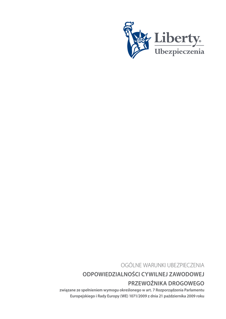 OGÓLNE WARUNKI UBEZPIECZENIA odpowiedzialności cywilnej zawodowej przewoźnika drogowego związane ze spełnieniem wymogu określonego w art. 7 Rozporządzenia Parlamentu Europejskiego i Rady Europy (WE) 1071/2009 z dnia 21 października 2009 roku 2 Karta informacyjna Nr zapisu w OWU 1. Przesłanki wypłaty odszkodowania i innych świadczeń lub wartości wykupu ubezpieczenia: a. Ubezpieczenie odpowiedzialności cywilnej zawodowej przewoźnika drogowego §14-15 §17-18 2. Ograniczenia oraz wyłączenia odpowiedzialności zakładu ubezpieczeń uprawniające do odmowy wypłaty odszkodowania i innych świadczeń lub ich obniżenia: a. Ubezpieczenie odpowiedzialności cywilnej zawodowej przewoźnika drogowego §19 CZĘŚĆ I POSTANOWIENIA OGÓLNE I DEFINICJE 1. 2. 3. 4. Postanowienia ogólne §1 Na podstawie niniejszych Ogólnych Warunków Ubezpieczenia (zwanych dalej „OWU”) Liberty Seguros, Compania de Seguros y Reaseguros S.A., Oddział w Polsce z siedzibą w Warszawie, ul. Chocimska 17 (zwany dalej „Ubezpieczycielem”) zawiera z osobami fizycznymi, osobami prawnymi lub jednostkami organizacyjnymi nie posiadającymi osobowości prawnej, którym odrębna ustawa przyznaje zdolność prawną, będącymi przedsiębiorcami, umowę ubezpieczenia w zakresie ubezpieczenia odpowiedzialności cywilnej zawodowej przewoźnika drogowego związane ze spełnieniem wymogu określonego w art. 7 Rozporządzenia Parlamentu Europejskiego i Rady Europy (WE) 1071/2009 z dnia 21 października 2009 roku. Zakres i przedmiot ubezpieczenia wskazany jest w polisie. Umowa ubezpieczenia może zostać zawarta także na rachunek innej osoby (Ubezpieczonego). W takim przypadku postanowienia niniejszych OWU dotyczące Ubezpieczającego mają również zastosowanie odpowiednio do osoby, na rachunek której zawarto umowę. Do umowy ubezpieczenia mają zastosowanie przepisy prawa polskiego, w szczególności kodeksu cywilnego, prawa przewozowego oraz ustaw regulujących działalność ubezpieczeniową. Definicje §2 Ilekroć w niniejszych OWU, wniosku o zawarcie umowy ubezpieczenia, a także polisie oraz w innych pismach i oświadczeniach składanych w związku z zawarciem lub wykonywaniem tej umowy używa się wymienionych poniżej terminów, należy przez nie rozumieć: 1) akty terroryzmu – wszelkiego rodzaju działania indywidualne lub grupowe skierowane przeciwko ludności lub mieniu w celu wprowadzenia chaosu, zastraszenia ludności, dezorganizacji życia publicznego, transportu publicznego, działalności zakładów usługowych lub wytwórczych – dla osiągnięcia skutków ekonomicznych, politycznych lub społecznych; 2) polisa – dokument ubezpieczenia w rozumieniu art. 809 kodeksu cywilnego, wystawiony przez Ubezpieczyciela, potwierdzający zawarcie umowy ubezpieczenia i jej warunki; ilekroć w niniejszych OWU mowa jest o polisie należy przez to rozumieć również dokument o innej nazwie, stanowiący dokument ubezpieczenia w rozumieniu art. 809 kodeksu cywilnego; 3) Rozporządzenie – Rozporządzenie Parlamentu Europejskiego i Rady Europy (WE) 1071/2009 z dnia 21 października 2009 r., ustanawiającego wspólne zasady dotyczące warunków wykonywania zawodu przewoźnika drogowego i uchylającego Dyrektywę Rady 96/26 WE; 4) suma gwarancyjna - określona w umowie ubezpieczenia kwota stanowiąca górną granicę odpowiedzialności Ubezpieczyciela na jedno i wszystkie zdarzenia ubezpieczeniowe powstałe w okresie ubezpieczenia, zgodna z wymogami wskazanymi w art. 7 ust. 1 Rozporządzenia; 5) szkoda – zobowiązanie płatnicze Ubezpieczonego lub roszczenie finansowe względem Ubezpieczonego objęte jego odpowiedzialnością przewoźnika zawodowego; 6) Ubezpieczający - przedsiębiorca zawierający umowę ubezpieczenia i zobowiązany do opłacenia składki; 7) Ubezpieczony – przedsiębiorca, na rachunek którego została zawarta umowa ubezpieczenia, ubiegający się o wydanie licencji lub zezwolenia albo też dysponujący ważną licencją lub zezwoleniem na wykonywanie transportu drogowego rzeczy lub osób wydany przez właściwy organ zgodnie z wymaganiami Ustawy o transporcie drogowym (Dz. U. z 2001 r. nr 125, poz. 1371, z p. zm.) oraz innymi przepisami prawa; 8) zdarzenie ubezpieczeniowe – zdarzenie losowe, niezależne od woli Ubezpieczonego skutkujące niemożnością spełnienia lub należytego spełnienia przez Ubezpieczonego wymagalnego i zasadnego zobowiązania płatniczego lub roszczenia finansowego, pozostające w bezpośrednim związku z zakresem zawodowej działalności Ubezpieczonego jako przewoźnika drogowego, a w konsekwencji skutkujące utratą zdolności Ubezpieczonego do regulowania jego zobowiązań finansowych. Zawarcie umowy ubezpieczenia – początek odpowiedzialności Ubezpieczyciela §3 1. Umowa ubezpieczenia zawierana jest na okres ubezpieczenia trwający 1 rok. Daty początku i końca okresu ubezpieczenia określa umowa ubezpieczenia. 2. Umowa ubezpieczenia zawierana jest na podstawie informacji podanych przez Ubezpieczającego we wniosku o ubezpieczenie lub przed zawarciem umowy w innych pismach, niezbędnych do dokonania przez Ubezpieczyciela oceny ryzyka ubezpieczeniowego. 3. Umowa ubezpieczenia jest zawarta z chwilą potwierdzenia przez Ubezpieczyciela, że złożony przez Ubezpieczającego wniosek o ubezpieczenie został zaakceptowany lub z inną chwilą uzgodnioną przez strony. W razie wątpliwości umowę ubezpieczenia uważa się za zawartą z chwilą doręczenia Ubezpieczającemu polisy. 4. Odpowiedzialność Ubezpieczyciela rozpoczyna się w dniu ustalonym w umowie ubezpieczenia jako początek okresu ubezpieczenia, jednak nie wcześniej, niż od dnia następnego po zawarciu umowy oraz nie wcześniej, niż od dnia następnego po zapłaceniu składki. 5. Ubezpieczyciel ma prawo uzależnić zawarcie umowy ubezpieczenia od dostarczenia przez Ubezpieczającego dokumentów wymaganych przez Ubezpieczyciela. 6. W przypadku określonym w ust. 5 Ubezpieczyciel przed zawar