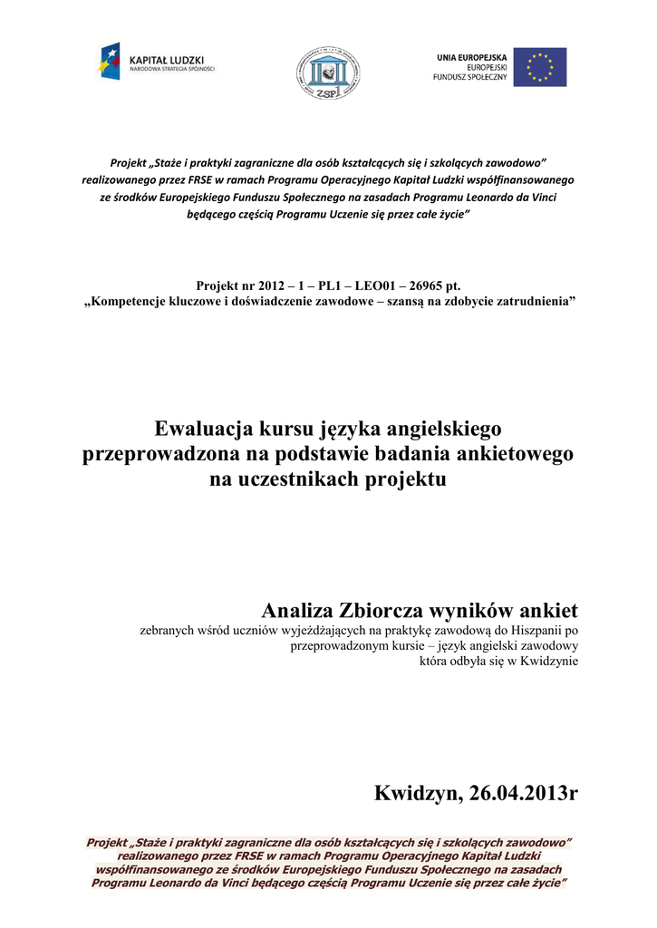 Projekt „Staże i praktyki zagraniczne dla osób kształcących się i szkolących zawodowo” realizowanego przez FRSE w ramach Programu Operacyjnego Kapitał Ludzki współfinansowanego ze środków Europejskiego Funduszu Społecznego na zasadach Programu Leonardo da Vinci będącego częścią Programu Uczenie się przez całe życie” Projekt nr 2012 – 1 – PL1 – LEO01 – 26965 pt. „Kompetencje kluczowe i doświadczenie zawodowe – szansą na zdobycie zatrudnienia” Ewaluacja kursu języka angielskiego przeprowadzona na podstawie badania ankietowego na uczestnikach projektu Analiza Zbiorcza wyników ankiet zebranych wśród uczniów wyjeżdżających na praktykę zawodową do Hiszpanii po przeprowadzonym kursie – język angielski zawodowy która odbyła się w Kwidzynie Kwidzyn, 26.04.2013r Projekt „Staże i praktyki zagraniczne dla osób kształcących się i szkolących zawodowo” realizowanego przez FRSE w ramach Programu Operacyjnego Kapitał Ludzki współfinansowanego ze środków Europejskiego Funduszu Społecznego na zasadach Programu Leonardo da Vinci będącego częścią Programu Uczenie się przez całe życie” 1. Cel Badania Celem badania ankietowego jest ocena jakości kursu przeprowadzonego wśród uczniów którzy odbędą praktykę zawodową w Hiszpanii. Odpowiedzi udzielone przez uczestników wskazują w jakim stopniu uczniowie oceniają swoją wiedzę w momencie rozpoczęcia kursu, swoje uczestnictwo, charakter przeprowadzonych zajęć oraz wiedzę jaką posiadają po zakończeniu. Dodatkowo badanie pozwala uzyskać informacje na temat zainteresowania grupy uczestniczeniem w kursie kształtującym zdolności językowe. Narzędziem badawczym była ankieta. Opracowano ankietę zawierającą 11 pytań zamkniętych. W ankiecie brało udział 20 uczniów z Zespołu Szkół Ponadgimnazjalnych w Kwidzynie. 2. Analiza Danych Każde z pytań (1-11) zostało zanalizowane na podstawie łącznej wartości odpowiedzi na poszczególne pytania udzielonych przez wszystkich badanych. 1. Jak oceniasz swój poziom wiedzy z zakresu komunikowania się w języku obcym zawodowym przed odbyciem praktyk? 70% 60% 50% 40% 30% 20% 10% 0% bardzo wysoko wysoko średnio nisko bardzo nisko Osoby uczestniczące w badaniu oceniły swój poziom wiedzy przed uczestniczeniem w kursie w 35% na wysokim poziomie, a 65% na średnim poziomie. Projekt „Staże i praktyki zagraniczne dla osób kształcących się i szkolących zawodowo” realizowanego przez FRSE w ramach Programu Operacyjnego Kapitał Ludzki współfinansowanego ze środków Europejskiego Funduszu Społecznego na zasadach Programu Leonardo da Vinci będącego częścią Programu Uczenie się przez całe życie” 2. Jak oceniasz sposób prowadzenia zajęć? 60% 50% 40% 30% 20% 10% 0% bardzo dobrze dobrze średnio źle bardzo źle Osoby uczestniczące w badaniu oceniły bardzo dobry sposób prowadzenia zajęć w 55% a 45% jako dobry. 3. Jak oceniasz materiały dydaktyczne prezentowane i udostępniane przez osoby szkolące? 120% 100% 80% 60% 40% 20% 0% przydatne nieprzydatne Osoby uczestniczące w badaniu oceniły materiały dydaktyczne prezentowane i udostępniane przez osoby szkolące jako przydatne w 100%. Projekt „Staże i praktyki zagraniczne dla osób kształcących się i szkolących zawodowo” realizowanego przez FRSE w ramach Programu Operacyjnego Kapitał Ludzki współfinansowanego ze środków Europejskiego Funduszu Społecznego na zasadach Programu Leonardo da Vinci będącego częścią Programu Uczenie się przez całe życie” 4. Czy tematyka i sposób prowadzenia zajęć był ciekawy? 70% 60% 50% 40% 30% 20% 10% 0% zdecydowanie tak raczej tak ani tak, ani nie raczej nie zdecydowanie nie Osoby uczestniczące w badaniu oceniły temat i sposób prowadzenia zajęć jako dobry w 60% a w 40% jako raczej dobry. Czy treści szkolenia przekazywane były w sposób przystępny i zrozumiały? 5. Czy treści szkolenia przekazywane były w sposób przystępny i zrozumiały? 80% 70% 60% 50% 40% 30% 20% 10% 0% zdecydowanie tak raczej tak ani tak, ani nie raczej nie zdecydowanie nie Osoby uczestniczące w badaniu oceniły sposób przekazywania wiedzy podczas kursu jako bardzo dobry w 70% a w 30% jako dobry. Projekt „Staże i praktyki zagraniczne dla osób kształcących się i szkolących zawodowo” realizowanego przez FRSE w ramach Programu Operacyjnego Kapitał Ludzki współfinansowanego ze środków Europejskiego Funduszu Społecznego na zasadach Programu Leonardo da Vinci będącego częścią Programu Uczenie się przez całe życie” 6. Jak oceniasz swoją aktywność podczas zajęć? 50% 45% 40% 35% 30% 25% 20% 15% 10% 5% 0% bardzo wysoko wysoko średnio nisko bardzo nisko Osoby uczestniczące w badaniu oceniły swoją aktywność podczas zajęć na bardzo wysokim poziomie w 20%, na wysokim poziomie w 45%, średnim poziomie 35%. 7. Czy odpowiadało Ci tempo zajęć? 60% 50% 40% 30% 20% 10% 0% zdecydowanie tak raczej tak ani tak, ani nie raczej nie zdecydowanie nie Osoby uczestniczące w badaniu oceniły tempo zajęć jako bardzo dobre w 45%, w 55% oceniło jako dobre. Projekt „Staże i praktyki zagraniczne dla osób kształcących się i szkolących zawodowo” realizowanego przez FRSE w ramach Programu Operacyjnego Kapitał Ludzki współfinansowanego ze środków Europejskiego Funduszu Społecznego na zasadach Programu Leonardo da Vinci będącego częścią Programu Uczenie się przez całe życie” 8. Co sądzisz o czasie trwania całego szkolenia z zakresu języka angielskiego? 90% 80% 70% 60% 50% 40% 30% 20% 10% 0% za krótki odpowiedni za długi Osoby uczestniczące w badaniu oceniły czas trwania szkolenia jako odpowiedni w 85%, w 10% jako za krótki, w 5% jako za długi. 9. Jak oceniasz swój poziom wiedzy po szkoleniu? 80% 70% 60% 50% 40% 30% 20% 10% 0% bardzo wysoko wysoko średnio nisko bardzo nisko Osoby uczestniczące w badaniu oceniły swój poziom wiedzy po szkoleniu na bardzo wysokim po