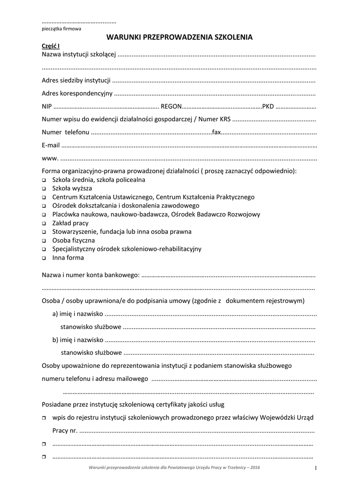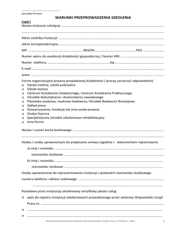 …………………………….........… pieczątka firmowa WARUNKI PRZEPROWADZENIA SZKOLENIA Część I Nazwa instytucji szkolącej ............................................................................................................... .......................................................................................................................................................... Adres siedziby instytucji .................................................................................................................. Adres korespondencyjny ................................................................................................................. NIP ……………….................…………..………….. REGON…………………………...…………….PKD ……………….…… Numer wpisu do ewidencji działalności gospodarczej / Numer KRS ............................................... Numer telefonu ....................................................................fax...................................................... E-mail ……………………….............................................……………………………………………………………………… www. ................................................................................................................................................ Forma organizacyjno-prawna prowadzonej działalności ( proszę zaznaczyć odpowiednio): Szkoła średnia, szkoła policealna Szkoła wyższa Centrum Kształcenia Ustawicznego, Centrum Kształcenia Praktycznego Ośrodek dokształcania i doskonalenia zawodowego Placówka naukowa, naukowo-badawcza, Ośrodek Badawczo Rozwojowy Zakład pracy Stowarzyszenie, fundacja lub inna osoba prawna Osoba fizyczna Specjalistyczny ośrodek szkoleniowo-rehabilitacyjny Inna forma Nazwa i numer konta bankowego: …………………………………............................………………………...……. ………………………………………………………………………………………............................................................... Osoba / osoby uprawniona/e do podpisania umowy (zgodnie z dokumentem rejestrowym) a) imię i nazwisko ....................................................................................................................... stanowisko służbowe ............................................................................................................ b) imię i nazwisko ...................................................................................................................... stanowisko służbowe ........................................................................................................... Osoby upoważnione do reprezentowania instytucji z podaniem stanowiska służbowego numeru telefonu i adresu mailowego .............……………………………………………..…….......................... ……………………………………………………....................................……….......................................... Posiadane przez instytucję szkoleniową certyfikaty jakości usług wpis do rejestru instytucji szkoleniowych prowadzonego przez właściwy Wojewódzki Urząd Pracy nr. .................................................................................................................................... …………………………………………………………………………….............................................…………………… …………………………………………………………………………….............................................…………………… Warunki przeprowadzenia szkolenia dla Powiatowego Urzędu Pracy w Trzebnicy – 2016 1 Część II ( dla każdego rodzaju szkolenia należy wypełniać osobno) Nazwa szkolenia: ................................................................................................................................................ ................................................................................................................................................. Program szkolenia - Załącznik 1 wg wzoru Program szkolenia przygotowany zgodnie z Rozporządzeniem Ministra Pracy i Polityki Społecznej z dnia 14 maja 2014 r. w sprawie szczegółowych warunków realizacji oraz trybu i sposobów prowadzenia usług rynku pracy (Dz.U. z 2014 poz. 667) zawiera w szczególności: 1) nazwę szkolenia; 2) czas trwania i sposób organizacji szkolenia; 3) wymagania wstępne dla uczestników szkolenia; 4) cele szkolenia ujęte w kategoriach efektów uczenia się z uwzględnieniem wiedzy, umiejętności i kompetencji społecznych; 5) plan nauczania określający tematy zajęć edukacyjnych oraz ich wymiar z uwzględnieniem, w miarę potrzeby, części teoretycznej i części praktycznej; 6) opis treści – kluczowe punkty szkolenia w zakresie poszczególnych zajęć edukacyjnych; 7) wykaz literatury oraz niezbędnych środków i materiałów dydaktycznych; 8) przewidziane sprawdziany i egzaminy. Uwaga! Program szkolenia, wzór anonimowej ankiety dla uczestników szkolenia służącej do oceny szkolenia oraz wzór zaświadczenia lub innego dokumentu potwierdzającego ukończenie szkolenia i uzyskanie umiejętności lub kwalifikacji będą stanowić integralną część umowy szkoleniowej. Proponowany termin szkolenia* Najbliższy możliwy termin szkolenia: .........…………..………………........................………………………. wg potrzeb Powiatowego Urzędu Pracy w Trzebnicy inny ............................................................................................................................................ Liczba godzin szkolenia (wg ilości zajęć edukacyjnych) ........................................................................... w tym liczba godzin zajęć praktyc