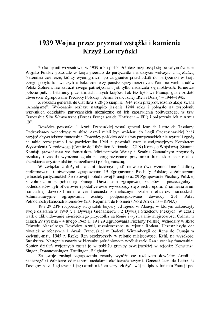 1939 Wojna przez pryzmat wstążki i kamienia Krzyż Lotaryński Po kampanii wrześniowej w 1939 roku polski żołnierz rozproszył się po całym świecie. Wojsko Polskie pozostałe w kraju przeszło do partyzantki i z ukrycia walczyło z najeźdźcą. Natomiast żołnierze, którzy wyemigrowali po za granice przechodzili do partyzantki w kraju swego pobytu lub walczyli u boku żołnierzy państw sprzymierzonych. Pomimo wielu trudów Polski Żołnierz nie zatracił swego patriotyzmu i jak tylko nadarzała się możliwość formował polskie pułki i bataliony przy armiach innych krajów. Tak też było we Francji, gdzie zostało utworzone Zgrupowanie Piechoty Polskiej 1 Armii Francuskiej „Ren i Dunaj” – 1944–1945. Z rozkazu generała de Gaulle’a z 28-go sierpnia 1944 roku przeprowadzono akcję zwaną „Amalgame”. Wykonanie rozkazu nastąpiło jesienią 1944 roku i polegało na zespoleniu wszystkich oddziałów partyzanckich niezależnie od ich zabarwienia politycznego, w tzw. Francuskie Siły Wewnętrzne (Forces Françaises de l'Intérieur – FFI) i połączeniu ich z Armią „B”. Dowódcą powstałej 1 Armii Francuskiej został generał Jean de Lattre de Tassigny. Cudzoziemcy wchodzący w skład Armii mieli być wcieleni do Legii Cudzoziemskiej bądź przyjąć obywatelstwo francuskie. Dowódcy polskich oddziałów partyzanckich nie wyrazili zgody na takie rozwiązanie i w październiku 1944 r. powołali wraz z emigracyjnym Komitetem Wyzwolenia Narodowego (Comité de Libération Nationale – CLN) Komisje Wojskową. Starania Komisji prowadzone we francuskim Ministerstwie Wojny i Sztabie Generalnym przyniosły rezultaty i została wyrażona zgoda na zorganizowanie przy armii francuskiej jednostek o charakterze czysto polskim, z orzełkami i polską musztrą. W związku z dużymi stanami liczebnymi, sformowane dwa wzmocnione bataliony zreformowano i utworzono zgrupowania: 19 Zgrupowanie Piechoty Polskiej z żołnierzami jednostek partyzanckich Środkowej i południowej Francji oraz 29 Zgrupowanie Piechoty Polskiej z żołnierzami z północnej Francji. Dowódcami zgrupowań, sztabów i poszczególnych pododdziałów byli oficerowie i podoficerowie wywodzący się z ruchu oporu. Z ramienia armii francuskiej dowodził nimi oficer francuski z nielicznym sztabem oficerów francuskich. Administracyjnie zgrupowania zostały podporządkowane dowódcy 201 Pułku Połnocnoafrykańskich Pionierów (201 Regiment de Pionniers Nord Africains – RPNA). 19 i 29 ZPP rozpoczęły swój szlak bojowy od rejonu w Alzacji, w którym zakończyły swoje działania w 1940 r. 1 Dywizja Grenadierów i 2 Dywizja Strzelców Pieszych. W czasie walk o zlikwidowanie niemieckiego przyczółka na Renie i wyzwalanie miejscowości Colmar w dniach 29 stycznia – 4 lutego 1945 r., 19 i 29 Zgrupowania Piechoty Polskiej wchodziły w skład Odwodu Naczelnego Dowódcy Armii, rozmieszczone w rejonie Rothau. Uczestniczyły one również w ofensywie 1 Armii Francuskiej w Badenii Wirtembergii od Renu do Dunaju w kwietniu-maju 1945 r. Rzekę Ren przekroczyły w rejonie miejscowości Kehl, na wysokości Strasburga. Następnie natarły w kierunku południowym wzdłuż rzeki Ren i granicy francuskiej. Koniec działań wojennych zastał je w pobliżu granicy szwajcarskiej w rejonie: Konstanza, Singen, Donaueschingen, Tuttlingen, Balgheim. Za swoje zasługi zgrupowania zostały wyróżnione rozkazem dowódcy Armii, a poszczególni żołnierze odznaczeni medalami okolicznościowymi. Generał Jean de Lattre de Tassigny za zasługi swoje i jego armii miał zaszczyt złożyć swój podpis w imieniu Francji pod aktem kapitulacji Niemiec hitlerowskich, a rajcowie miasta Colmar, dziękując za wyzwolenie wyrazili zgodę na ustanowienie jako herbu 1 Armii Francuskiej, barw i herbu miasta Colmar. Ten emblemat noszony był przez żołnierzy tej armii, w tym zgrupowań polskich, na lewym rękawie munduru. Obecnie stanowi on odznakę francuskiego i polskiego Stowarzyszenia „Ren i Dunaj”. Emblemat/naszywka obecnie Odznaka francuskiego i polskiego Stowarzyszenia „Ren i Dunaj” Zgrupowania pozostały na zachodzie wchodząc w skład francuskich wojsk okupacyjnych do listopada 1945 r., kiedy to za zgodą Władz francuskich i okupacyjnych Władz amerykańskich i francuskich, skierowane zostały z wyposażeniem, uzbrojeniem, umundurowaniem i wyżywieniem do Polski. Do kraju wyjechało około 1500 żołnierzy zgrupowań. Pozostali wrócili do rodzin i do pracy w kopalniach i fabrykach we Francji. Po przejściu przez Bawarię i Czechosłowację zgrupowania stanęły na polskiej granicy 11 listopada 1945 r. 18 listopada dotarły do Warszawy, gdzie w pełnym rynsztunku odbyła się ostatnia uroczysta defilada przyjęta przez kierownictwo państwa i Wojska Polskiego oraz francuskich przełożonych zgrupowań i korpusu dyplomatycznego, akredytowanego przy tymczasowej Władzy Rzeczpospolitej. Zakończyła się w ten sposób ostatnia droga 19 i 29 Zgrupowania Piechoty Polskiej z Francji do Polski. Honorowa Odznaka Stowarzyszenia Byłych Żołnierzy 1 Armii Francuskiej „Ren i Dunaj” Opis honorowej Odznaki Stowarzyszenia Byłych Żołnierzy 1 Armii Francuskiej „Ren i Dunaj” „Krzyż Lotaryński”. Awers: Odznakę stanowi krzyż lotaryński (rys. 1.) posiadający dwa ramiona poziome i jedno pionowe. Odznaka wykonana jest z białego srebrzonego i oksydowanego metalu. Na pionowym ramieniu znajdują się dwie odznaki: Odznaka 1 Armii Francuskiej (odznaka górna) oraz Odznaka pamiątkowa 19 i 29 Zgrupowania Piechoty Polskiej (odznaka dolna). Oprócz odznak na ramieniu pionowym widnieją dwa napisy: nad odznakami STOWARZYSZENIE, pod odznakami SEKCJA/POLSKA. Na poziomych ramionach krzyża znajdują się kolejne napisy: na górnym BYŁYCH ŻOŁNIERZY 1 ARMII FRANCUSKIEJ, na dolnym REN i DUNAJ. U góry Odznaki jest ucho do zamocowania kółka wstążki. Wstążka ma szerokość 35 mm. Kolorystyka wstążki nawiązuje do barw narodowych Pol