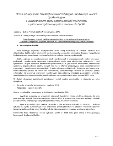Ocena sytuacji Spółki Przedsiębiorstwa Produkcyjno Handlowego WADEX Spółka Akcyjna z uwzględnieniem oceny systemu kontroli wewnętrznej i systemu zarządzania ryzykiem istotnym dla Spółki podstaw : Dobre Praktyki Spółek Notowanych na GPW rozdział III Dobre praktyki stosowane przez członków rad nadzorczych. Zwięzła ocena sytuacji spółki z uwzględnieniem systemu kontroli wewnętrznej i systemu zarządzania ryzykiem istotnym dla spółki i samoocena pracy Rady Nadzorczej 1. Ocena sytuacji spółki Podsumowując czynności podejmowane przez Radę Nadzorczą w zakresie nadzoru nad działalnością Spółki, należy stwierdzić, że obejmowały on wszelkie niezbędne dziedziny i aspekty jej funkcjonowania, pozwalające realizować nałożone na Radę Nadzorczą obowiązki. Spółka zajmuje się przetwórstwem blach nierdzewnych i kwasoodpornych. Należy do grupy czołowych producentów systemów odprowadzania spalin oraz akcesoriów związanych z tymi systemami. Drugim obszarem działalności Spółki WADEX S.A. jest handel akcesoriami, elementami systemów odprowadzania spalin, których nie ma w ofercie produkcyjnej oraz specjalistycznymi maszynami i urządzeniami do produkcji. Trzecim obszarem działalności Emitenta jest kooperacja. Mimo stabilnej sytuacji na rynku stali nierdzewnej, podstawowego surowca do produkcji, presja odbiorców na poprawę warunków handlowych spowodowały znaczące pogorszenie wyników sprzedaży jak i rentowności działalności handlowej, szczególnie w pierwszej połowie 2013 roku. W dwóch obszarach działalności zanotowany został spadek przychodów w stosunku do roku ubiegłego: Sprzedaż systemów kominowych – spadek o 6,5% Kooperacja – spadek o 23,3%, Wzrost przychodów zanotowano w działalności handlowej o 83%. Wynik ze sprzedaży we wszystkich obszarach łącznie był niższy o 1,9% w stosunku do roku poprzedniego a wynik finansowy netto był niższy o 43% w stosunku do roku poprzedniego. Na taki poziom wyniku finansowego wpłynęła sprzedaż w roku 2012 nieruchomości. Zysk ze sprzedaży był z kolei w 2013 roku o 26% wyższy w stosunku do roku 2012. Stabilna sytuacja na rynku surowcowym oraz aktywność przedsiębiorstwa w obszarze wysokomarżowych towarów, zaliczanych do grupy handlowych, to główne przyczyny lepszego wyniku na sprzedaży. Generalnie Rada Nadzorcza ocenia sytuację Spółki w 2013 roku jako dobrą i niezagrażającą kontynuacji działalności Spółki. str. 1 2. Ocena systemu kontroli wewnętrznej W opinii Rady Nadzorczej system kontroli WADEX S.A. w porównaniu do 2012 r. nie uległ istotnej zmianie. Kompleksowy charakter systemu zapewnia terminowe i dokładne ujawnianie faktów dotyczących istotnych elementów działalności Spółki. Pozwala on Zarządowi, jak też i Radzie Nadzorczej na uzyskiwanie pełnej wiedzy o sytuacji finansowej, wynikach operacyjnych, stanie majątku Spółki, a także efektywności zarządzania. Zakres kontroli obejmuje swym zasięgiem przede wszystkim: działalność gospodarczą spółki, podstawową oraz pomocniczą, sprawozdawczość finansową i rozliczenia księgowe, zgodność działania spółki z obowiązującymi przepisami prawa i regulacjami wewnętrznymi, zatrudnienie i płace. W firmie istnieją i są stosowane systemy planowania i kontroli realizowanych przedsięwzięć . Systemy te monitorują działalność w czasie rzeczywistym, pozwalając na ewentualne działania w przypadku wystąpienia niepożądanych zjawisk. Rada Nadzorcza monitorowała również wywiązywanie się Zarządu z obowiązków informacyjnych spoczywających na spółkach notowanych na GPW w Warszawie. Zarząd wywiązywał się z bieżącego informowania akcjonariuszy o istotnych zdarzeniach, które miały wpływ na kondycję finansową spółki. Ponadto stosował się do zasad ładu korporacyjnego zgodnie z oświadczeniem Zarządu opublikowanym wraz z raportem rocznym za rok 2010 r. Prawidłowo zwoływał Walne Zgromadzenia Akcjonariuszy i rzetelnie informował o postanowieniach Walnego Zgromadzenia. Rada Nadzorcza pozytywnie ocenia te systemy. Rada Nadzorcza wykonuje zadania Komitetu Audytu i w tym zakresie na bieżąco monitoruje sprawy związane z kontrolą wewnętrzną oraz ryzykami istotnymi dla Spółki. 3. Zarządzanie ryzykiem W firmie WADEX S.A. nie występuje odrębny, wydzielony organizacyjnie proceduralnie system zarządzania ryzykiem. Identyfikacją i oceną obszarów ryzyka zajmują się właściwe dla danego rodzaju ryzyka służby Spółki. Kontrola wewnętrzna i zarządzanie ryzykami w Spółce uregulowane są w Regulaminie kontroli wewnętrznej. Nadzór, ale też i kluczowe decyzje dotyczące zmniejszenia ekspozycji na ryzyko podejmuje Zarząd Spółki. Ryzyko rynkowe w tym ryzyko zmiany cen WATEX S.A. na bieżąco analizuje trendy cenowe w obszarze podstawowego surowca do produkcji, jakim jest stal nierdzewna. Rok 2013 był okresem bardzo stabilnym pod tym względem. Pierwsza połowa roku charakteryzowała się bardzo nieznacznymi wahaniami cen metali szlachetnych, stanowiących podstawę tzw. dodatków stopowych. W drugiej połowie roku, w związku z ogromna ekspansją firm z dalekiego wschodu na rynek europejski wyraźnie zauważalny był spadek cen transakcyjnych na rynku stali nierdzewnej. W celu zapewnienia stabilności i płynności w realizowanych procesach Spółka prowadzi aktywne negocjacje z czołowymi dystrybutorami stali oraz dywersyfikuje zakupy, uwzględniając aktualne trendy cenowe, zmniejszając ryzyko związane ze wzrostem cen surowców. Takie działania mają istotny wpływ na negocjowaną z dystrybutorami tzw. cenę bazową, stanowiącą ok. 30% ceny str. 2 zakupu surowca. Ma on natomiast niewielki wpływ na pozostałą część ceny zakupu tego surowca (tzw. dodatek stopowy). Ryzyko kredytowe Spółka w procesie finansowania bieżącej działalności Spółki, korzysta z kredytów obrotowych w rachunku bieżącym, dlatego też nie można wykluczyć wyst