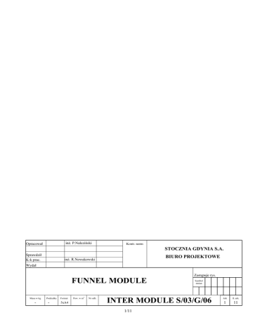 inż. P.Naleziński Opracował Kontr. norm STOCZNIA GDYNIA S.A. Sprawdził K-k prac. BIURO PROJEKTOWE inż. R.Nowakowski Wydał FUNNEL MODULE Masa w kg - Podziałka - Format 5xA4 Pow. w m2 Nr odb. Zastępuje rys. Symbol zmian INTER MODULE S/03/G/06 1/11 Ark Il. ark. 1 11 SPIS TREŚCI 1. Wstęp 3 2. Charakterystyka bloku komina 4 3. Wyposażenie bloku komina 4 4. Założenia projektowe 6 5. Podsumowanie 11 2/11 1. WSTĘP. Wymogi konkurencji w obecnym świecie a tym samym dotyczące rynku stoczniowego zmuszające do skracania cykli produkcyjnych statków zmieniając podejście stoczni produkcyjnych do technologii budowy jednostek pływających. Jedną z poważnych możliwości skrócenia budowy jednostek jest stosowanie w szerokim zakresie wyposażania modułowego. Wykorzystując doświadczenia nabyte w trakcie budowy długich serii jednostek Stocznia zauważa duże możliwości w modularyzacji kolejnych elementów wyposażenia okrętowego. Takim przykładem pozwalającym zredukować koszty montażowoinstalacyjne jest blok komina. Ze względu na duże gabaryty i masę kompletnego wyposażenia komina dla typowego kontenerowca zdecydowano się na zaprojektowanie bloku zawierającego jedynie przewody spalinowe, odpowietrzenia zbiorników, kanały wentylacyjne oraz niezbędne drogi komunikacyjne. Blok komina został zaprojektowany tak aby w pełni wykorzystać możliwość budowy bloku jak niżej: budowa bloku u poddostawców Stoczni wykonanie produktu gotowego do ostatecznego montażu na statku budowa w pozycji leżącej, pod dachem nieograniczonego dostępu do przestrzeni wewnątrz bloku podczas budowy zastosowanie prostych technologii zastosowanie odpowiednich rozwiązań i tolerancji dla łatwego połączenia konstrukcji bloku i konstrukcji statku możliwość transportu do stoczni w pozycji leżącej uchwyty umożliwiające operacje transportowe, obracanie bloku do pozycji pionowej oraz prosty montaż na budowanej jednostce pływającej 3/11 2. CHARAKTERYSTYKA WYPOSAŻENIA BLOKU KOMINA. Przestrzeń komina objęta niniejszym opracowaniem zapewnia możliwość rozmieszczenia przewodów spalinowych silników napędowych oraz pomocniczych, kotłów oraz innych urządzeń np. spalarek. Znajdują tam miejsce instalacje odpowietrzające wymagające wyprowadzenia w miejsce oddalone od przejść na pokładach otwartych oraz czerpnie i odloty systemu wentylacji siłowni. Blok komina wykonany jako gotowy u poddostawcy (wraz z położoną izolacją termiczną oraz wymalowaniem) musi być przygotowany do łatwego montażu i połączenia z konstrukcją kadłubową z uwzględnieniem tolerancji wykonania tych konstrukcji Do tej pory Stocznia wyposażała przestrzeń komina we własnym zakresie na podstawie własnej dokumentacji. nie korzystając z żadnych gotowych modułów. 3. WYPOSAŻENIE BLOKU KOMINA. W skład bloku włączono następujące elementy: Przewody spalinowe silnika głównego Przewody spalinowe zespołów prądotwórczych (cztery zespoły) Przewody spalinowe kotła opalanego Przewody spalinowe spalarki Kanał wentylacyjny – wyciąg z rejonu wirówek paliwa Zespół żaluzji wentylacyjnych wraz z klapami p.poż. Wnęki odpowietrzeń dla zbiorników paliwa i oleju smarowego Konieczne ścieki i odwodnienia Zakłada się, że wszystkie elementy wchodzące w skład bloku będą spasowane ze sobą u producenta, zmontowane w blok i przetransportowane na statek, gdzie zostanie on zamontowany. Wybór wyposażenia bloku po uwzględnieniu powyższych warunków wykonywany jest przez dostawcę bloku wg jego standardów. 4/11 Rys.1. Model 3D kompletnego bloku komina 5/11 4. ZAŁOŻENIA PROJEKTOWE. Konstrukcja nośna bloku Podstawa z elementami mocowania do konstrukcji statku – wykonana jako skrzynka z blachy stalowej grubej Klatka bloku wykonana z kształtowników stalowych walcowanych Ramy pośrednie wykonane z blachy stalowej grubej Uchwyty transportowe Rys.2. Model 3D konstrukcji nośnej bloku komina 6/11 Przewody spalinowe Silnik główny – DN1600 Zespoły prądotwórcze (maksymalnie cztery) – DN500 Kocioł opalany – DN500 Spalarka - DN500 Rurociągi zwinięte z blachy stalowej grubości 4 mm Kolana segmentowe spawane Mocowanie elastyczne zgodne ze standardem Stocznia Gdynia Kompensacja wydłużeń termicznych za pomocą kompensatorów falistych wykonanych ze stali nierdzewnej - Izolacja wykonana z wełny mineralnej pokrytej blachą stalową ocynkowaną Stałe przejścia kominowe na platformie górnej komina 7/11 Rys.3. Model 3D przewodów spalinowych 8/11 Odpowietrzenia Dwie wnęki odpowietrzeń uzbrojone w odpowietrzenia zakończone siatką dla zbiorników paliwa i oleju smarowego Odlot zbiorczy z zaworów bezpieczeństwa instalacji pary Odlot zbiorczy z zaworów bezpieczeństwa instalacji sprężonego powietrza Doprowadzenie zespołu króćców odpowietrzeń do granicy bloku Rys.4. Model 3D odpowietrzeń instalacji paliwa i oleju Odwodnienia Odwodnienie platformy górnej komina Odwodnienie wnęk odpowietrzających Wentylacja Wyciąg z rejonu wirówek paliwa jako kanał spawany z blachy stalowej Zespół zamykanych z zewnątrz żaluzji wentylacyjnych wraz z klapami p.poż. Komunikacja 9/11 - Ciąg drabin Barierki i gretingi dla zapewnienia dojścia do wnęk odpowietrzających oraz wnęki wentylacyjnej Zamykany właz strugoszczelny na platformie górnej komina Rys.5. Model 3D - komunikacja 10/11 5. PODSUMOWANIE. Korzyści wynikające z zastosowania modułu komina to głównie przesunięcie pracochłonnych czynności wyposażeniowych ze Stoczni do firm kooperujących. Wykorzystanie małych firm pozwala na racjonalny rozwój regionu związanego z gospodarką morską i elastyczne wykorzystanie siły roboczej. Istotne jest uproszczenie cyklu produkcyjnego w Stoczni, krótszy czas wyposażania statku. 11/11