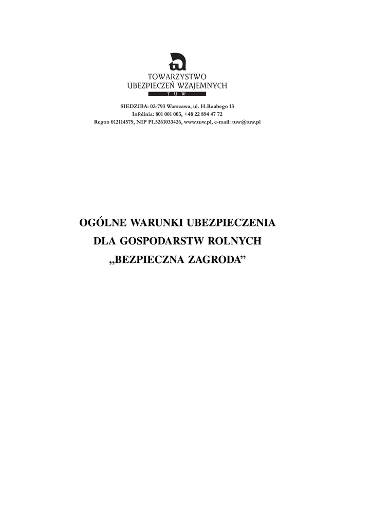 OGÓLNE WARUNKI UBEZPIECZENIA DLA GOSPODARSTW ROLNYCH „BEZPIECZNA ZAGRODA” Rozdział VI SPIS TREŚCI POSTANOWIENIA OGÓLNE . . . . . . . . . . . . . . . . . . . . . . § 1 Przedmiot umowy ubezpieczenia . . . . . . . . . . . . . . . . . . . . . § 2 Definicje . . . . . . . . . . . . . . . . . . . . . . . . . . . . . . . . . . . . . . . . . . . § 4 Wyłączenia odpowiedzialności . . . . . . . . . . . . . . . . . . . . . . . . § 5 Zawarcie umowy ubezpieczenia . . . . . . . . . . . . . . . . . . . . . . § 6 Czas trwania odpowiedzialności Towarzystwa . . . . . . . . . . § 7 Suma ubezpieczenia i suma gwarancyjna . . . . . . . . . . . . . . § 9 Składka ubezpieczeniowa . . . . . . . . . . . . . . . . . . . . . . . . . . . § 10 Obowiązki Towarzystwa . . . . . . . . . . . . . . . . . . . . . . . . . . . . § 12 Obowiązki Ubezpieczającego i Ubezpieczonego . . . . . . § 13 Ustalenie wysokości odszkodowania . . . . . . . . . . . . . . . . . § 15 Wypłata odszkodowania . . . . . . . . . . . . . . . . . . . . . . . . . . . . § 18 Rozpatrywanie odwołań, skarg i zażaleń . . . . . . . . . . . . . § 19 Rozwiązywanie sporów . . . . . . . . . . . . . . . . . . . . . . . . . . . . . § 22 Roszczenia regresowe . . . . . . . . . . . . . . . . . . . . . . . . . . . . . . § 23 POSTANOWIENIA DOTYCZĄCE POSZCZEGÓLNYCH RODZAJÓW UBEZPIECZEŃ Rozdział I Ubezpieczenie budynków, budowli oraz nagrobków cmentarnych Przedmiot ubezpieczenia . . . . . . . . . . . . . . . . . . . . . . . . . . . . Zakres ubezpieczenia . . . . . . . . . . . . . . . . . . . . . . . . . . . . . . . Wyłączenia odpowiedzialności . . . . . . . . . . . . . . . . . . . . . . Suma ubezpieczenia . . . . . . . . . . . . . . . . . . . . . . . . . . . . . . . . Ustalenie rozmiaru szkody . . . . . . . . . . . . . . . . . . . . . . . . . . § 24 § 25 § 26 § 27 § 28 Rozdział II Ubezpieczenie mienia związanego z prowadzeniem gospodarstwa rolnego Przedmiot i zakres ubezpieczenia . . . . . . . . . . . . . . . . . . . . Wyłączenia odpowiedzialności . . . . . . . . . . . . . . . . . . . . . . Suma ubezpieczenia . . . . . . . . . . . . . . . . . . . . . . . . . . . . . . . . Ustalenie rozmiaru szkody . . . . . . . . . . . . . . . . . . . . . . . . . . § 29 § 31 § 32 § 33 Rozdział III Ubezpieczenie ruchomości domowych i stałych elementów wykończenia budynku mieszkalnego Przedmiot i zakres ubezpieczenia . . . . . . . . . . . . . . . . . . . . Wyłączenia odpowiedzialności . . . . . . . . . . . . . . . . . . . . . . Suma ubezpieczenia . . . . . . . . . . . . . . . . . . . . . . . . . . . . . . . . Limity odpowiedzialności . . . . . . . . . . . . . . . . . . . . . . . . . . . Ustalenie rozmiaru szkody . . . . . . . . . . . . . . . . . . . . . . . . . . Wymagane zabezpieczenia . . . . . . . . . . . . . . . . . . . . . . . . . . Obowiązki Ubezpieczającego i Ubezpieczonego . . . . . . § 34 § 36 § 37 § 38 § 39 § 40 § 41 § 42 § 44 § 45 § 46 Rozdział V Ubezpieczenie upraw Przedmiot i zakres ubezpieczenia . . . . . . . . . . . . . . . . . . . . Wyłączenia odpowiedzialności . . . . . . . . . . . . . . . . . . . . . . Czas trwania odpowiedzialności Towarzystwa . . . . . . . . Suma ubezpieczenia . . . . . . . . . . . . . . . . . . . . . . . . . . . . . . . . Obowiązki Ubezpieczającego i Ubezpieczonego . . . . . . Ustalenie rozmiaru szkody . . . . . . . . . . . . . . . . . . . . . . . . . . Ustalenie wysokości odszkodowania . . . . . . . . . . . . . . . . . 2 Przedmiot i zakres ubezpieczenia . . . . . . . . . . . . . . . . . . . . Rodzaje i wysokość świadczeń . . . . . . . . . . . . . . . . . . . . . . Wyłączenia odpowiedzialności . . . . . . . . . . . . . . . . . . . . . . Suma ubezpieczenia . . . . . . . . . . . . . . . . . . . . . . . . . . . . . . . . Czas trwania odpowiedzialności Towarzystwa . . . . . . . . Obowiązki Ubezpieczającego, Ubezpieczonego i Uprawnionego . . . . . . . . . . . . . . . . . . . . . . . . . . . . . . . . . . . . Ustalenie wysokości i wypłata odszkodowania . . . . . . . . § 57 § 59 § 60 § 61 § 62 § 63 § 64 Rozdział VII Ubezpieczenie odpowiedzialności cywilnej w życiu prywatnym Przedmiot i zakres ubezpieczenia . . . . . . . . . . . . . . . . . . . . Wyłączenia odpowiedzialności . . . . . . . . . . . . . . . . . . . . . . Suma gwarancyjna . . . . . . . . . . . . . . . . . . . . . . . . . . . . . . . . . Obowiązki Ubezpieczającego i Ubezpieczonego . . . . . . Ustalenie rozmiaru szkody . . . . . . . . . . . . . . . . . . . . . . . . . . § 66 § 67 § 69 § 70 § 71 Rozdział VIII Ubezpieczenie odpowiedzialności cywilnej kombajnisty z tytułu wykonywania usługi koszenia Przedmiot i zakres ubezpieczenia . . . . . . . . . . . . . . . . . . . . Wyłączenia odpowiedzialności . . . . . . . . . . . . . . . . . . . . . . Suma gwarancyjna . . . . . . . . . . . . . . . . . . . . . . . . . . . . . . . . . Ustalenie rozmiaru szkody . . . . . . . . . . . . . . . . . . . . . . . . . . § 72 § 73 § 74 § 75 Rozdział IX Ubezpieczenie ochrony prawnej Przedmiot i zakres ubezpieczenia . . . . . . . . . . . . . . . . . . . . § 76 Wyłączenia odpowiedzialności . . . . . . . . . . . . . . . . . . . . . . § 79 Wypłata odszkodowania . . . . . . . . . . . . . . . . . . . . . . . . . . . . § 80 POSTANOWIENIA KOŃCOWE . . . . . . . . . . . . . . . . . . § 81 KLAUZULE DODATKOWE POSTANOWIENIA OGÓLNE Rozdział IV Ubezpieczenie szyb i innych przedmiotów szklanych Przedmiot i zakres ubezpieczenia . . . . . . . . . . . . . . . . . . . . Wyłączenia odpowiedzialności . . . . . . . . . . . . . . . . . . . . . . Suma ubezpieczenia . . . . . . . . . . . . . . . . . . . . . . . . . . . . . . . . Ustalenie rozmiaru szkody . . . . . . . . . . . . . . . . . . . . . . . . . . Ubezpieczenie następstw nieszczęśliwych wypadków § 47 § 49 § 50 § 51 § 52 § 54 § 56 §1 1. Niniejsze ogólne warunki ubezpieczenia Bezpieczna Zagroda, zwane dalej OWU Bezpieczna Zagroda, maj
