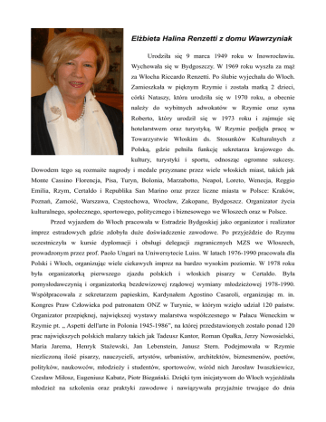 Elżbieta Halina Renzetti z domu Wawrzyniak Urodziła się 9 marca 1949 roku w Inowrocławiu. Wychowała się w Bydgoszczy. W 1969 roku wyszła za mąż za Włocha Riccardo Renzetti. Po ślubie wyjechała do Włoch. Zamieszkała w pięknym Rzymie i została matką 2 dzieci, córki Nataszy, która urodziła się w 1970 roku, a obecnie należy do wybitnych adwokatów w Rzymie oraz syna Roberto, który urodził się w 1973 roku i zajmuje się hotelarstwem oraz turystyką. W Rzymie podjęła pracę w Towarzystwie Włoskim ds. Stosunków Kulturalnych z Polską, gdzie pełniła funkcję sekretarza krajowego ds. kultury, turystyki i sportu, odnosząc ogromne sukcesy. Dowodem tego są rozmaite nagrody i medale przyznane przez wiele włoskich miast, takich jak Monte Cassino Florencja, Pisa, Turyn, Bolonia, Marzabotto, Neapol, Loreto, Wenecja, Reggio Emilia, Rzym, Certaldo i Republika San Marino oraz przez liczne miasta w Polsce: Kraków, Poznań, Zamość, Warszawa, Częstochowa, Wrocław, Zakopane, Bydgoszcz. Organizator życia kulturalnego, społecznego, sportowego, politycznego i biznesowego we Włoszech oraz w Polsce. Przed wyjazdem do Włoch pracowała w Estradzie Bydgoskiej jako organizator i realizator imprez estradowych gdzie zdobyła duże doświadczenie zawodowe. Po przyjeździe do Rzymu uczestniczyła w kursie dyplomacji i obsługi delegacji zagranicznych MZS we Włoszech, prowadzonym przez prof. Paolo Ungari na Uniwersytecie Luiss. W latach 1976-1990 pracowała dla Polski i Włoch, organizując wiele ciekawych imprez na bardzo wysokim poziomie. W 1978 roku była organizatorką pierwszego zjazdu polskich i włoskich pisarzy w Certaldo. Była pomysłodawczynią i organizatorką bezdewizowej rządowej wymiany młodzieżowej 1978-1990. Współpracowała z sekretarzem papieskim, Kardynałem Agostino Casaroli, organizując m. in. Kongres Praw Człowieka pod patronatem ONZ w Turynie, w którym wzięło udział 120 państw. Organizator przepięknej, największej wystawy malarstwa współczesnego w Pałacu Weneckim w Rzymie pt. „ Aspetti dell'arte in Polonia 1945-1986”, na której przedstawionych zostało ponad 120 prac największych polskich malarzy takich jak Tadeusz Kantor, Roman Opałka, Jerzy Nowosielski, Maria Jarema, Henryk Stażewski, Jan Lebenstein, Janusz Stern. Podejmowała w Rzymie niezliczoną ilość pisarzy, nauczycieli, artystów, urbanistów, architektów, biznesmenów, poetów, polityków, naukowców, młodzieży i studentów, sportowców, wśród nich Jarosław Iwaszkiewicz, Czesław Miłosz, Eugeniusz Kabatz, Piotr Biegański. Dzięki tym inicjatywom do Włoch wyjeżdżała młodzież na szkolenia oraz praktyki zawodowe i nawiązywała przyjaźnie trwające do dnia dzisiejszego. Udziela się również w sejmowej grupie międzyparlamentarnej kobiet, nawiązując kontakty miedzy Ligą Kobiet Polskich i Włoskich. W grudniu 1981 roku przybyła do Sejmu wraz z delegacją parlamentarzystek włoskich. Wniosła ogromny wkład w organizację pomocy charytatywnej dla Polski, organizując, wraz z różnymi miastami włoskimi oraz z Watykanem konwój darów z Włoch do różnych szpitali w Polsce. Organizowała również liczne imprezy na rzecz pomocy chorym i biednym dzieciom. 29 lipca 1987 roku została uhonorowana odznaką „Zasłużony dla Kultury Polskiej” przez Ministra Aleksandra Krawczuka w Ambasadzie Polskiej Rzymie. W latach 1990 -2006 pracowała w publicznej Telewizji Rai 1, 2 i 3 przy organizacji produkcji programów rozrywkowych w charakterze producenta, aktorki, statystki i sekretarza produkcji. Występowała w wielu reklamach i filmach włoskich. W 1995 roku pracowała w komitecie organizacyjnym Wojskowych Igrzysk Sportowych CISMO NATO, które odbyły się w Rzymie. Była odpowiedzialna za przygotowanie programu kulturalnego, w którym udział wzięło 115 państw, w tym, po raz pierwszy, Polska. W roku 1997 Włączyła się tez do współpracy Miast Bliźniaczych Bydgoszczy i Reggio Emilia w obchodach 200 rocznicy Mazurka Dąbrowskiego. Wystąpiła jako oficjalny tłumacz Przewodniczącego JAFA, Primo Nebiolo podczas Mistrzostw Świata Juniorów w lekkiej atletyce w Bydgoszczy. W roku 1998 otrzymała Medal Prezydenta Miasta Bydgoszczy za organizację wyjazdu delegacji Miasta Bydgoszcz z Prezydentem Henrykiem Sapalskim na czele w lipcu 1997 roku do Watykanu i Miasta REGGIO EMILIA z oficjalnym zaproszeniem dla Jana Pawła II do Bydgoszczy. Dzięki tym zabiegom spełniło się marzenie wielu Bydgoszczan - papież podczas swojej pielgrzymki do Polski w czerwcu 1999 zawitał w Bydgoszczy. Była również pomysłodawczynią nadania papieżowi tytułu Honorowego Obywatela Bydgoszczy. 11 sierpnia 1997 roku, wraz z grupą przyjaciół, założyła w Bydgoszczy Towarzystwo Polsko-Włoskie. Została mianowana jego pierwszym Prezesem. Towarzystwo corocznie organizuje dla mieszkańców Bydgoszczy wiele ciekawych imprez takich jak Włoskie Lato, Włoska Zima, Polsko-Włoskie Trendy Świąteczne, Włoska Wigilia. W ramach działalności Towarzystwa organizowane są również liczne konferencje, odczyty oraz prelekcje w rożnych dziedzinach, takich jak zdrowie, uroda, kultura i sztuk oraz rozmaite prelekcje i konferencje zagraniczne. Towarzystwo współpracuje, ponadto, z uniwersytetami bydgoskimi i włoskimi, w organizacji wymian kulturalnych. Organizuje też kursy języka włoskiego, pokazy filmów włoskich i mody włoskiej, promując to co najpiękniejsze i najcenniejsze dla obu krajów. Towarzystwo może się również poszczycić organizacją pobytu w Bydgoszczy dwóch Ambasadorów włoskich: Ambasadora Luca Biolato i Ambasador Anny BlefariMelazzi. Dzięki tym inicjatywom Filharmonia Pomorska, Opera Nova oraz Biuro Wystaw Artystycznych nawiązało kontakty z Włochami, w wyniku których zorganizowano liczne koncerty oraz wystawy. W Bydgoszczy odbyła się tez pierwsza polsko-włoska konferencja gospodarcza w dziedzinie ochrony środowiska. Towarzystwo Polsko-Włoskie orga