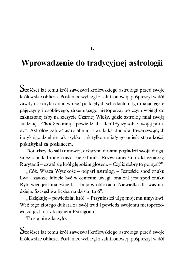 15 1. Wprowadzenie do tradycyjnej astrologii 1. Wprowadzenie do tradycyjnej astrologii S ześćset lat temu król zawezwał królewskiego astrologa przed swoje królewskie oblicze. Posłaniec wybiegł z sali tronowej, pośpieszył w dół zawiłymi korytarzami, wbiegł po krętych schodach, odgarniając gęste pajęczyny i osobliwego, drzemiącego nietoperza, po czym wbiegł do zakurzonej izby na szczycie Czarnej Wieży, gdzie astrolog miał swoją siedzibę. „Chodź ze mną – powiedział. – Król życzy sobie twojej porady”. Astrolog zabrał astrolabium oraz kilka duchów towarzyszących i utykając dzielnie tak szybko, jak tylko umiały go unieść stare kości, pokuśtykał za posłańcem. Dotarłszy do sali tronowej, drżącymi dłońmi pogładził swoją długą, śnieżnobiałą brodę i nisko się skłonił. „Rozważamy ślub z księżniczką Rurytanii – ozwał się król głębokim głosem. – Czyliż dobry to pomysł?”. „Cóż, Wasza Wysokość – odparł astrolog. – Jesteście spod znaku Lwa i zawsze lubicie być w centrum uwagi, ona zaś jest spod znaku Ryb, więc jest marzycielką i buja w obłokach. Niewielka dla was nadzieja. Szczęśliwa liczba na dzisiaj to 6”. „Dziękuję – powiedział król. – Przyniosłeś ulgę mojemu umysłowi. Weź tego złotego dukata za swój trud i powiedz swojemu nietoperzowi, że jest teraz księciem Estragonu”. To się nie zdarzyło. S ześćset lat temu król zawezwał królewskiego astrologa przed swoje królewskie oblicze. Posłaniec wybiegł z sali tronowej, pośpieszył w dół 16 RZECZYWISTA ASTROLOGIA zawiłymi korytarzami, wbiegł po krętych schodach, przedzierając się przez narzędzia do wytwarzania świec i zdobione frędzlami stojaki na rośliny, po czym wbiegł na poddasze na szczycie Czarnej Wieży, gdzie astrolog właśnie przechodził procedurę powtórnych narodzin. „Chodź ze mną – powiedział. – Król życzy sobie twojej porady”. Astrolog zabrał astrolabium oraz wybór leków kwiatowych i dzielnie utykając tak szybko, jak tylko pozwalał na to jego kruchy archetyp, pokuśtykał za posłańcem. Dotarłszy do sali tronowej, drżącymi dłońmi pogładził swoją aurę i nisko się skłonił. „Rozważamy ślub z księżniczką Rurytanii – ozwał się król głębokim głosem. – Czyliż dobry to pomysł?”. „Cóż, Wasza Wysokość – odparł astrolog, rozsiadając się wygodnie na Dziełach Wszystkich Junga. – Widzę z Waszego horoskopu, że mieliście trudne dzieciństwo i jesteście wrażliwsi, niż uświadamiają to sobie inni ludzie. Macie powołanie uzdrowiciela i niespełnione możliwości twórcze. „Dziękuję – powiedział król. – Teraz znacznie lepiej rozumiem całą sytuację. Weź ten złoty banał i dołącz go do swojej kolekcji”. To się nie zdarzyło. Sześćset lat temu król zawezwał królewskiego astrologa. „Zastanawiam się nad ślubem z księżniczką Rurytanii – ozwał się król. – Czy to dobry pomysł?”. „Cóż, Wasza Wysokość – odparł astrolog. – Widzę z Waszego horoskopu, że księżniczka przyciągnie poetów, myślicieli i artystów z całego kontynentu i uczyni Wasz dwór sławnym ośrodkiem nauki. To małżeństwo stworzy długotrwałą unię pomiędzy dwoma królestwami, zaś ojciec księżniczki okaże się cennym sprzymierzeńcem w nadchodzącej wojnie przeciwko barbarzyńcom. Jednak wszystkie Wasze dzieci umrą przed Wami, więc po Waszej śmierci na tronie zasiądzie Wasz zły brat, który będzie uciskał lud”. 1. Wprowadzenie do tradycyjnej astrologii 17 „Dziękuję – powiedział król. – To daje mi do myślenia oraz przekazuje pewne konkretne informacje, na których mogę oprzeć moją decyzję. A teraz wracaj do swoich studiów”. To również się nie zdarzyło; choć jest to ilustracja znacznie bliższa temu, czym była astrologia przez większość swojej historii. Współczesna astrologia to bzdura. Jako praktykujący zawodowy astrolog uważam, że należy to wyjaśnić od razu na początku. To, co uchodzi dziś za astrologię, nie jest niczym innym, jak groteskową parodią nauki niegdyś uprawianej. Nasze pierwsze oswojenie się z tematem prawie niezmiennie pochodzi z gazetowych kolumn z horoskopem, szczególnie gdy mamy nadzieję na jakiś sprzyjający omen, że właśnie to jest ten dzień, kiedy Pan lub Pani Ideał w końcu nas dostrzeże. Znajdujemy tu bezwartościowe porady w rodzaju „unikaj wypadków” czy „bądź ostrożny z ostrymi przedmiotami; precyzyjne przepowiednie, takie jak „imprezy mogą się opóźniać” i „drobiazgi mogą się gubić” (zwróć uwagę na słowo „mogą”); albo przenikliwe analizy charakteru w rodzaju „twoje potrzeby w związku są dość złożone i niełatwe do zaspokojenia”.1 Krytykom naukowym z trudem przychodzi uznanie możliwości , że astrologia, nawet dziś, to coś więcej niż to, co podają takie kolumny. Jednak większość ludzi mniej lub bardziej wyraźnie uświadamia sobie, że jest „coś jeszcze”, że możliwe jest posiadanie horoskopu urodzeniowego, który oferuje obietnicę większego wglądu we własną naturę niż sama wiedza, że się jest spod znaku Lwa czy Byka. Rzeczywiście, jest „coś jeszcze”, lecz niestety owo coś jest niewiele więcej warte od gazetowych kolumn, obejmujących zwykle mieszaninę nie do końca pojmowanego żargonu psychoanalitycznego, na tyle mglistego, że ktokolwiek go usłyszy, może uznać za pasujący akurat do niego. „Jesteś bardzo wrażliwy”, „Miałeś trudne dzieciństwo”, „Nawet 1 Wszelkie cytaty pochodzą z przypadkowych próbek takich tekstów. 18 RZECZYWISTA ASTROLOGIA bliskie związki uważasz za jakoś niesatysfakcjonujące”. Tak, myślimy sobie, to ja, co do joty. Współczesna astrologia świetnie się rozwija na ludzkiej skłonności do odnoszenia wszystkiego, co się usłyszy, do siebie; skoro wszyscy jesteśmy uczynieni z tych samych materiałów w różnyc