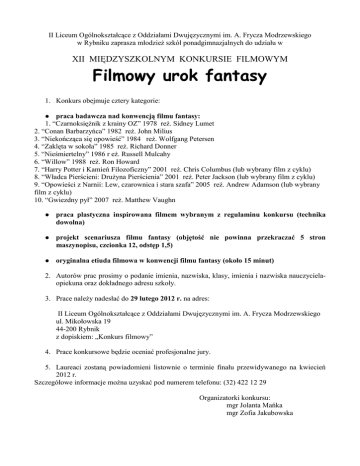 II Liceum Ogólnokształcące z Oddziałami Dwujęzycznymi im. A. Frycza Modrzewskiego w Rybniku zaprasza młodzieŜ szkół ponadgimnazjalnych do udziału w XII MIĘDZYSZKOLNYM KONKURSIE FILMOWYM Filmowy urok fantasy 1. Konkurs obejmuje cztery kategorie: praca badawcza nad konwencją filmu fantasy: 1. “CzarnoksięŜnik z krainy OZ” 1978 reŜ. Sidney Lumet 2. “Conan Barbarzyńca” 1982 reŜ. John Milius 3. “Niekończąca się opowieść” 1984 reŜ. Wolfgang Petersen 4. “Zaklęta w sokoła” 1985 reŜ. Richard Donner 5. “Nieśmiertelny” 1986 r eŜ. Russell Mulcahy 6. “Willow” 1988 reŜ. Ron Howard 7. “Harry Potter i Kamień Filozoficzny” 2001 reŜ. Chris Columbus (lub wybrany film z cyklu) 8. “Władca Pierścieni: DruŜyna Pierścienia” 2001 reŜ. Peter Jackson (lub wybrany film z cyklu) 9. “Opowieści z Narnii: Lew, czarownica i stara szafa” 2005 reŜ. Andrew Adamson (lub wybrany film z cyklu) 10. “Gwiezdny pył” 2007 reŜ. Matthew Vaughn praca plastyczna inspirowana filmem wybranym z regulaminu konkursu (technika dowolna) projekt scenariusza filmu fantasy (objętość nie powinna przekraczać 5 stron maszynopisu, czcionka 12, odstęp 1,5) oryginalna etiuda filmowa w konwencji filmu fantasy (około 15 minut) 2. Autorów prac prosimy o podanie imienia, nazwiska, klasy, imienia i nazwiska nauczycielaopiekuna oraz dokładnego adresu szkoły. 3. Prace naleŜy nadesłać do 29 lutego 2012 r. na adres: II Liceum Ogólnokształcące z Oddziałami Dwujęzycznymi im. A. Frycza Modrzewskiego ul. Mikołowska 19 44-200 Rybnik z dopiskiem: „Konkurs filmowy” 4. Prace konkursowe będzie oceniać profesjonalne jury. 5. Laureaci zostaną powiadomieni listownie o terminie finału przewidywanego na kwiecień 2012 r. Szczegółowe informacje moŜna uzyskać pod numerem telefonu: (32) 422 12 29 Organizatorki konkursu: mgr Jolanta Mańka mgr Zofia Jakubowska