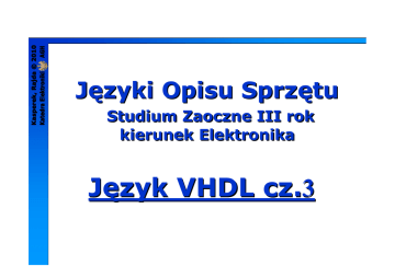 Języki Opisu Sprzętu Studium Zaoczne III rok kierunek Elektronika Język VHDL cz.3 Program wykładu • Wstęp do syntezy • Sprzętowa reprezentacja obiektów w VHDL • Synteza obiektów VHDL • Synteza instrukcji VHDL • Przykłady aplikacji Kontakt z prowadzącymi: C-3 p.502 tel. (617)3980 dr inŜ. Jerzy Kasperek [email protected] dr inŜ. Paweł J.Rajda [email protected] Archiwum wykładu http://fpga.elektro.agh.edu.pl/dydaktyka Wstęp do syntezy Literatura: • „A VHDL Synthesis primer” J.Bhasker, • „VHDL A Logic Synthesis Approach” D.Naylor, S.Jones, •„Reuse Methodology Manual” M.Keating, P.Bricaud, • Xilinx Foundation Express User Guide Synopsys, Inc. Projekt oparty o VHDL w środowisku Aldec AHDL Zewnętrzne narzędzia do przeprowadzenia syntezy i Implementacji Graficzny Shell po wybraniu Opcji: Prefereces/Flows/ Xilinx Flow (TCL based) Sprzętowa reprezentacja obiektów w VHDL Obiekt - sygnał lub zmienna moŜe być reprezentowany jako: • przewód • przerzutnik (element pamięciowy wyzwalany zboczem) • przerzutnik latch (element pamięciowy wyzwalany poziomem) Sprzętowa reprezentacja obiektów w VHDL signal A,B,C,D: bit ... NO_MEMORY: process (A,B,C) variable TMP: bit; begin TMP:= A and B; D <= TMP or C; end process; A B TMP D C Implementacja TMP : przewód signal A,B,C: bit ... IS_IT_LATCH: process (A,B,C) variable TMP: bit; begin C <= TMP and B; TMP := A or C; Implementacja TMP : zatrzask ?! end process; Synteza typów numerycznych: Integer, real • Typy i podtypy które zawierają wartości ujemne w swojej definicji zakresu kodowane są w kodzie uzupełnień do 2 • Typy i podtypy które zawierają tylko wartości dodatnie kodowane są binarnie • Liczb uŜytych bitów zaleŜy od największej dopuszczalnej wartości dla danego obiektu -- a binary encoding having 7bits. type int1 is range 10 to 100 -- a binary encoding having 7bits type int2 is range -1 to 100 -- a 2's complement encoding having -8 bits (including sign). subtype int3 is int2 range 0 to 7 -- a binary encoding having 3bits. type int0 is range 0 to 100 Synteza typów numerycznych: Integer, real type short is integer 0 to 255; subtype shorter is short range 0 to 31; subtype shortest is short range 0 to 15; signal op1,op2,res1 : shortest; . signal res2 : shorter; signal res3 : short begin res1 <= op1 + op2;-- truncate carry res2 <= op1 + op2;-- use carry res3 <= op1 + op2;-- use carry and zero extend Synteza typów wyliczeniowych • Typy wyliczeniowe syntezowane są przez binarne kodowanie. Poszczególnym elementów asygnowane są kolejne wartości przy czym pierwszy od lewej otrzymuje wartość zero. • Liczba asygnowanych elementów (n) będzie najmniejsza z moŜliwych liczba elementów <= 2**n • Typ bit jest syntezowany jako „wire” • Typ character jest syntezowany jako 8 x „wire” Synteza typów wyliczeniowych Deklaracja: Jest syntezowana jako type direction is (left, right, up, down); -- Two wires. type cpu_op is (execute, load, store); -- Two wires; -- the encoding of -- 11 is a "don't care." subtype mem_op is cpu_op range load to store; Two wires; the encodings of 00 and 11 are "don't cares.” User Defined Encoding attribute enum_encoding of enum_t : type is "001 010 100"; -- or ... : type is "one hot"; -- or ... : type is "1-hot"; Typ: std_logic_1164 type std_ulogic is 'X', ‘0', '1', 'Z', 'W', 'L', 'H', '-' ); -- Uninitialized Forcing Unknown Forcing 0 Forcing 1 High Impedance Weak Unknown Weak 0 Weak 1 Don't care ('U', --------- attribute enum_encoding of std_ulogic : type is "M M 0 1 Z M 0 1 -"; '0' 'L' '1' 'H' 'Z' 'U' 'X' 'W' '-' ------ Logic value 0 Logic value 1 Logic value tristate Metalogic value Don’t care value Synteza instrukcji przypisań - operatory logiczne entity logical_ops_1 is port (a, b, c, d: in bit; end logical_ops_1; m: out bit); architecture example of logical_ops_1 is signal e: bit; begin m <= (a and b) or e; -- concurrent signal e <= c xor d; -- assignments end example; entity logical_ops_2 is port (a, b: in bit_vector (0 to 3); m: out bit_vector (0 to 3)); end logical_ops_2 architecture example of logical_ops_2 is begin m <= a and b; end example; Synteza instrukcji przypisań - operatory relacji entity relational_ops_1 is port (a, b: in bit_vector (0 to 3); m: out boolean); end relational_ops_1; architecture example of relational_ops_1 is begin m <= a = b; end example; entity relational_ops_2 is port (a, b: in integer range 0 to 15; m: out boolean); end relational_ops_2; architecture example of relational_ops_2 is begin m <= a >= b; end example; Synteza operatorów arytmetycznych package example_arithmetic is type small_int is range 0 to 7; end example_arithmetic; use work.example_arithmetic.all; entity arithmetic is port (a, b: in small_int; m: out small_int); end arithmetic; architecture example of arithmetic is begin m <= a + b; end example; Synteza instrukcji wyboru VHDL wyraŜenia współbieŜne (concurrent) conditional signal assignment selected signal assignment ( when.. ) (with.. ) VHDL wyraŜenia sekwencyjne (sequential) (if.. ) (case..) Synteza współbieŜnych instrukcji wyboru entity control_stmts is port (a, b, c:in boolean; m: out boolean); end control_stmts; architecture example of control_stmts is begin m <= b when a else c; end example; entity control_stmts is port (sel: bit_vector (0 to 1); a,b,c,d : bit; bit); end control_stmts; architecture example of control_stmts is begin with sel select m <= c when b"00", m <= d when b"01", m <= a when b"10", m <= b when others; end example; m: out Synteza sekwencyjnych instrukcji wyboru entity control_stmts is port (a, b, c: in boolean; end control_stmts; m: out boolean); architecture example of control_stmts is begin process (a, b, c) variable n: boolean; begin if a then n := b; else n := c; end if; m <= n; end process; end example; Synteza sekwencyjnych instrukcji wyboru Synteza sekwencyjnych instrukcji wyboru entity control_stmts is port (sel: bit_vector (0 to 1); m: out b