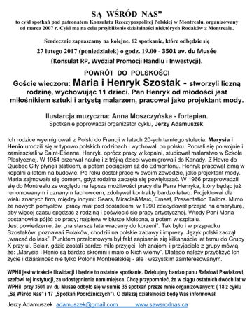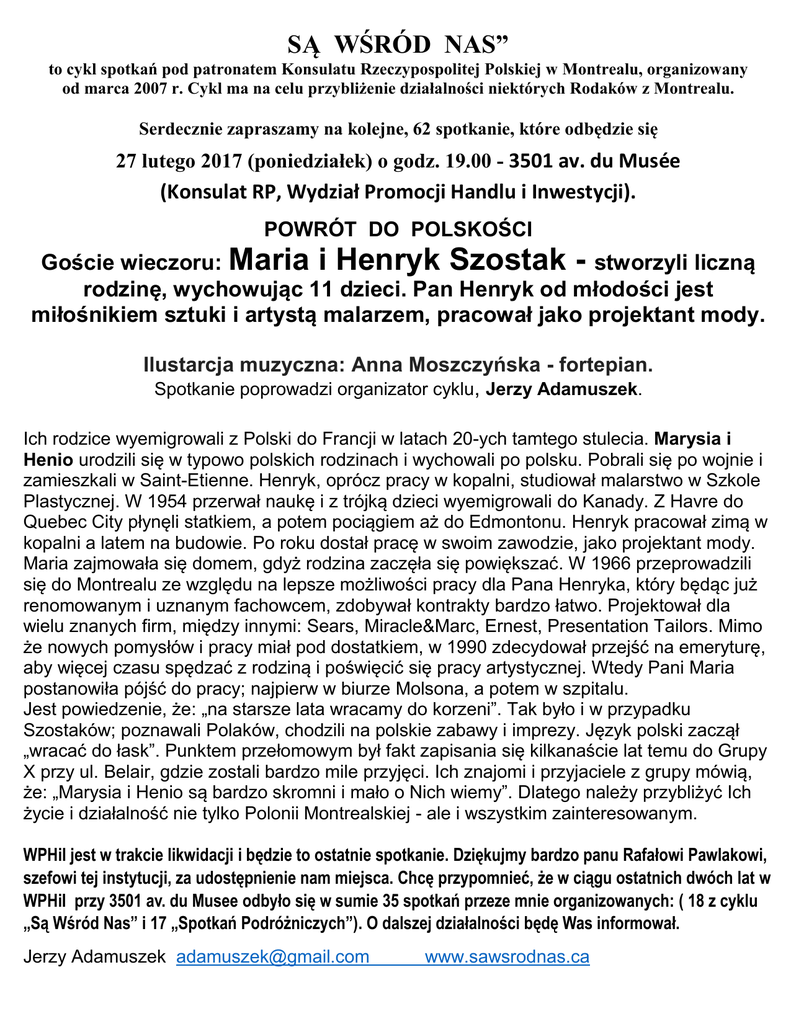 SĄ WŚRÓD NAS” to cykl spotkań pod patronatem Konsulatu Rzeczypospolitej Polskiej w Montrealu, organizowany od marca 2007 r. Cykl ma na celu przybliżenie działalności niektórych Rodaków z Montrealu. Serdecznie zapraszamy na kolejne, 62 spotkanie, które odbędzie się 27 lutego 2017 (poniedziałek) o godz. 19.00 - 3501 av. du Musée (Konsulat RP, Wydział Promocji Handlu i Inwestycji). POWRÓT DO POLSKOŚCI Goście wieczoru: Maria i Henryk Szostak - stworzyli liczną rodzinę, wychowując 11 dzieci. Pan Henryk od młodości jest miłośnikiem sztuki i artystą malarzem, pracował jako projektant mody. Ilustarcja muzyczna: Anna Moszczyńska - fortepian. Spotkanie poprowadzi organizator cyklu, Jerzy Adamuszek. Ich rodzice wyemigrowali z Polski do Francji w latach 20-ych tamtego stulecia. Marysia i Henio urodzili się w typowo polskich rodzinach i wychowali po polsku. Pobrali się po wojnie i zamieszkali w Saint-Etienne. Henryk, oprócz pracy w kopalni, studiował malarstwo w Szkole Plastycznej. W 1954 przerwał naukę i z trójką dzieci wyemigrowali do Kanady. Z Havre do Quebec City płynęli statkiem, a potem pociągiem aż do Edmontonu. Henryk pracował zimą w kopalni a latem na budowie. Po roku dostał pracę w swoim zawodzie, jako projektant mody. Maria zajmowała się domem, gdyż rodzina zaczęła się powiększać. W 1966 przeprowadzili się do Montrealu ze względu na lepsze możliwości pracy dla Pana Henryka, który będąc już renomowanym i uznanym fachowcem, zdobywał kontrakty bardzo łatwo. Projektował dla wielu znanych firm, między innymi: Sears, Miracle&Marc, Ernest, Presentation Tailors. Mimo że nowych pomysłów i pracy miał pod dostatkiem, w 1990 zdecydował przejść na emeryturę, aby więcej czasu spędzać z rodziną i poświęcić się pracy artystycznej. Wtedy Pani Maria postanowiła pójść do pracy; najpierw w biurze Molsona, a potem w szpitalu. Jest powiedzenie, że: „na starsze lata wracamy do korzeni”. Tak było i w przypadku Szostaków; poznawali Polaków, chodzili na polskie zabawy i imprezy. Język polski zaczął „wracać do łask”. Punktem przełomowym był fakt zapisania się kilkanaście lat temu do Grupy X przy ul. Belair, gdzie zostali bardzo mile przyjęci. Ich znajomi i przyjaciele z grupy mówią, że: „Marysia i Henio są bardzo skromni i mało o Nich wiemy”. Dlatego należy przybliżyć Ich życie i działalność nie tylko Polonii Montrealskiej - ale i wszystkim zainteresowanym. WPHiI jest w trakcie likwidacji i będzie to ostatnie spotkanie. Dziękujmy bardzo panu Rafałowi Pawlakowi, szefowi tej instytucji, za udostępnienie nam miejsca. Chcę przypomnieć, że w ciągu ostatnich dwóch lat w WPHiI przy 3501 av. du Musee odbyło się w sumie 35 spotkań przeze mnie organizowanych: ( 18 z cyklu „Są Wśród Nas” i 17 „Spotkań Podróżniczych”). O dalszej działalności będę Was informował. Jerzy Adamuszek [email protected] www.sawsrodnas.ca