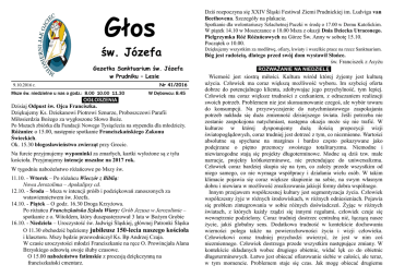 Głos Dziś rozpoczyna się XXIV Śląski Festiwal Ziemi Prudnickiej im. Ludviga van Beethovena. Szczegóły na plakacie. Spotkanie dla wolontariuszy Szlachetnej Paczki w środę o 17.00 w Domu Katolickim. św. Józefa Gazetka Sanktuarium św. Józefa w Prudniku – Lesie 9.10.2016 r. Msze św. niedzielne u nas o godz.: 8.00 10.00 11.30 OGŁOSZENIA Nr 41/2016 W Dębowcu: 8.45 Dzisiaj Odpust św. Ojca Franciszka. Dziękujemy Ks. Dziekanowi Piotrowi Sznurze, Proboszczowi Parafii Miłosierdzia Bożego za wygłoszone Słowo Boże. Po Mszach zbiórka dla Fundacji Nowego Tysiąclecia na stypendia dla młodzieży. Różaniec o 15.00, następnie spotkanie Franciszkańskiego Zakonu Świeckich. Ok. 15.30 błogosławieństwo zwierząt przy Grocie. Na furcie przyjmujemy wypominki za zmarłych, kartki wyłożone są z tyłu kościoła. Przyjmujemy intencje mszalne na 2017 rok. W tygodniu nabożeństwo różańcowe po Mszy św. 11.10. - Wtorek – Po różańcu Wieczór z Biblią: Nowa Jerozolima – Apokalipsy cd. 12.10. - Środa – Msza w intencji próśb i podziękowań zanoszonych za wstawiennictwem św. Józefa. 14.10. - Piątek – O godz. 16.30 Droga Krzyżowa. Po różańcu Franciszkańska Szkoła Wiary: Grób Jezusa w Jerozolimie – spotkanie z o. Witoldem, który duszpasterzował 3 lata w Bożym Grobie 16.10. - Niedziela – Uroczystość św. Jadwigi Śląskiej, głównej Patronki Śląska O 11.30 obchodzić będziemy jubileusz 150-lecia naszego kościoła i klasztoru. Mszy będzie przewodniczył Ks. Bp Andrzej Czaja. W czasie uroczystości młodzi Franciszkanie na ręce O. Prowincjała Alana Brzyskiego odnowią swoje śluby czasowe. O 15.00 nabożeństwo fatimskie z procesją dziękczynną na franciszkański cmentarz. W piątek 14.10 w Moszczance o 18.00 Msza z okazji Dnia Dziecka Utraconego. Pielgrzymka Róż Różańcowych na Górze Św. Anny w sobotę 15.10. Początek o 10.00. Dziękujemy wszystkim za modlitwę, ofiary, kwiaty i wszelkie prace na rzecz Sanktuarium. Bóg jest radością, dlatego przed swój dom wystawił Słońce. św. Franciszek z Asyżu ROZWAŻANIE NA NIEDZIELĘ Wierność jest siostrą miłości. Kultura wśród której żyjemy jest kulturą użycia. Człowiek ma coraz większą możliwość wyboru. Im szybciej oferta dobrze do potencjalnego klienta, zdobywając jego przychylność, tym lepiej. Człowiek ma coraz większe trudności z czekaniem, z odraczaniem realizacji swoich potrzeb. Problemem nie jest skonsumowanie czegoś, ale wybór towaru do konsumpcji. Na przyzwyczajenie do natychmiastowego zaspokajania potrzeb nakłada się duża zmienność dzisiejszego świata. Jeśli potrzeba nie zostanie zaspokojona natychmiast, następna okazja może się nie trafić. W kulturze w której dysponujemy dużą ilością propozycji wizji światopoglądowych, coraz trudniej jest dotrzeć z tym, co niezmienne. Wartości absolutne są spychane na margines i bardzo często pokazywane jako podejrzane o piętno przemocy swoistego totalitaryzmu. Niemodne i niewiarogodne stają się projekty długoterminowe. Modne są dziś tzw. małe narracje, projekty krótkoterminowe, nie pretendujące do uniwersalizmu. Człowiek coraz bardziej skupia się na tym, co zależy przede wszystkim od niego samego, co nie wymaga współpracy i działania wielu osób. W takim klimacie pojawia się coraz większe skupienie na sobie, na swym własnym dobru i niewiara w możliwość zrealizowania jakiejś formy dobra wspólnego. Innym przejawem współczesnej kultury jest segmentyzacja życia. Człowiek współczesny żyje w różnych środowiskach, w różnych odniesieniach. Pojawia się problem zintegrowania w sobie różnych doświadczeń. Żyjąc w różnych światach, z których każdy rządzi się innymi regułami, człowiek czuje się wewnętrznie podzielony. Coraz trudniej dostrzec centralną nić, łączącą nasze życie, jakiś globalny sens. Dodatkowa trudność w kontekście dochowania wierności polega także na powierzchowności życia i wizji człowieka. Człowiekowi coraz trudniej przychodzi uwierzyć, że jest w nim coś niezmiennego. Człowiek dostrzega przede wszystkim następujące zmiany. W kontekście składanych wobec drugiego obietnic, widać lęk co do obietnic długoterminowych. Łatwo jest obiecać ofiarowanie siebie w całości, ale teraz, w tym momencie. Problemem staje się czas. Jak mogę obiecać drugiemu wierność w przyszłości, kiedy nie wiem, kim się stanę? Wytrwać w złożonej obietnicy, bez względu na okoliczności, kogo spotkam, w kim się zakocham, wydaje się dzisiaj olbrzymim problemem. Także w tym klimacie kulturowym doświadczenie kryzysu jest szczególnie trudne i bolesne. Pojawia się poczucie zagrożenia samego swojego bytu; przekonanie, że ten stan nigdy się nie skończy. Ponieważ człowiek nie ma odniesienia do przyszłości, to liczy się tylko to, co teraz. Jeśli zaś to, czego doświadczam teraz – bezsensu i kryzysu, to trudno zaufać, że ten san się zmieni. Klimat ten staje się widoczny w perspektywie stałego związania swojego życia z kimś drugim. Każda taka decyzja niesie w sobie coś niewiadomego, zgodę na nieprzewidywalne. Nie możemy sobie wyobrazić, co będzie oznaczało być mężem czy żoną osoby, która może okazać się chora, może wpaść w chorobę alkoholową, albo stać się zwyczajnie nieznośna. Podobnie nie wiemy, dokąd zaprowadzi nas wierność w życiu zakonnym: może ona oznaczać odsunięcie od szczególnie mi bliskich zadań, wysłanie do trudnego miejsca, doświadczenia braku wsparcia, przyjaźni. Trudno to wszystko przyjąć, jeżeli nie przyjmie się żywej obecności Bożej Opatrzności w moim życiu. Nasze obietnice i śluby mogą być trwałe nie ze względu na nas samych, na naszą silną wolę, ale uświadamiamy sobie coraz bardziej, że stają się one realne i możliwe ze względu na Tego, Który Jest stały, ze względu na Boga. Widzimy to bardzo dobrze w historii Piotra, liczącego na siebie i