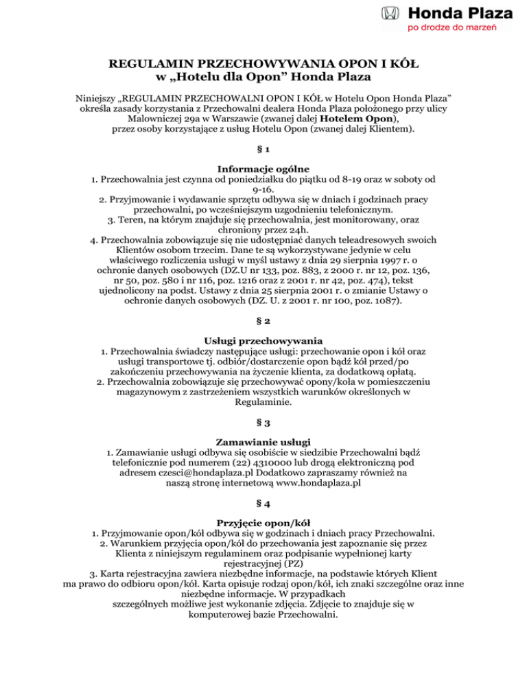 REGULAMIN PRZECHOWYWANIA OPON I KÓŁ w „Hotelu dla Opon” Honda Plaza Niniejszy „REGULAMIN PRZECHOWALNI OPON I KÓŁ w Hotelu Opon Honda Plaza” określa zasady korzystania z Przechowalni dealera Honda Plaza położonego przy ulicy Malowniczej 29a w Warszawie (zwanej dalej Hotelem Opon), przez osoby korzystające z usług Hotelu Opon (zwanej dalej Klientem). §1 Informacje ogólne 1. Przechowalnia jest czynna od poniedziałku do piątku od 8-19 oraz w soboty od 9-16. 2. Przyjmowanie i wydawanie sprzętu odbywa się w dniach i godzinach pracy przechowalni, po wcześniejszym uzgodnieniu telefonicznym. 3. Teren, na którym znajduje się przechowalnia, jest monitorowany, oraz chroniony przez 24h. 4. Przechowalnia zobowiązuje się nie udostępniać danych teleadresowych swoich Klientów osobom trzecim. Dane te są wykorzystywane jedynie w celu właściwego rozliczenia usługi w myśl ustawy z dnia 29 sierpnia 1997 r. o ochronie danych osobowych (DZ.U nr 133, poz. 883, z 2000 r. nr 12, poz. 136, nr 50, poz. 580 i nr 116, poz. 1216 oraz z 2001 r. nr 42, poz. 474), tekst ujednolicony na podst. Ustawy z dnia 25 sierpnia 2001 r. o zmianie Ustawy o ochronie danych osobowych (DZ. U. z 2001 r. nr 100, poz. 1087). §2 Usługi przechowywania 1. Przechowalnia świadczy następujące usługi: przechowanie opon i kół oraz usługi transportowe tj. odbiór/dostarczenie opon bądź kół przed/po zakończeniu przechowywania na życzenie klienta, za dodatkową opłatą. 2. Przechowalnia zobowiązuje się przechowywać opony/koła w pomieszczeniu magazynowym z zastrzeżeniem wszystkich warunków określonych w Regulaminie. §3 Zamawianie usługi 1. Zamawianie usługi odbywa się osobiście w siedzibie Przechowalni bądź telefonicznie pod numerem (22) 4310000 lub drogą elektroniczną pod adresem [email protected] Dodatkowo zapraszamy również na naszą stronę internetową www.hondaplaza.pl §4 Przyjęcie opon/kół 1. Przyjmowanie opon/kół odbywa się w godzinach i dniach pracy Przechowalni. 2. Warunkiem przyjęcia opon/kół do przechowania jest zapoznanie się przez Klienta z niniejszym regulaminem oraz podpisanie wypełnionej karty rejestracyjnej (PZ) 3. Karta rejestracyjna zawiera niezbędne informacje, na podstawie których Klient ma prawo do odbioru opon/kół. Karta opisuje rodzaj opon/kół, ich znaki szczególne oraz inne niezbędne informacje. W przypadkach szczególnych możliwe jest wykonanie zdjęcia. Zdjęcie to znajduje się w komputerowej bazie Przechowalni. 4. Opony/koła MUSZĄ BYĆ CZYSTE (pozbawione wszelkich nieczystości i ciał obcych znajdujących się w bieżnikach), aby dokonać precyzyjnej oceny ich stanu. 5. Uszkodzona opona/koło będą przyjmowane jedynie po dokonaniu wzmianki o uszkodzeniu w formularzu przyjęcia do przechowania. 6. Przechowalnia zastrzega sobie prawo do zmiany miejsca i sposobu przechowywania rzeczy oddanych na przechowanie, bez wcześniejszego poinformowania o tym fakcie klienta, jeżeli jest to niezbędne dla ich ochrony przed utratą i uszkodzeniem. §5 Odbiór opon/kół 1. Odbiór opon/kół odbywa się w godzinach i dniach pracy przechowalni (działu części) po uprzednim uzgodnieniu telefonicznym. Możliwe jest również odebranie opon/kół poza godzinami pracy, po uzgodnieniu telefonicznym (dotyczy wymiany opon w serwisie Honda Plaza). 2. Klient musi przynieść ze sobą kartę rejestracyjną, którą otrzymał przy zdawaniu opon/kół. 3. W chwili odbioru Klient zobowiązany jest sprawdzić stan opon/kół. 4. W wypadku utraty karty przechowania Klient zobowiązany jest do przedstawienia co najmniej dwóch dokumentów tożsamości, wraz z fotografią, pozwalających ustalić jego prawa do odbioru przechowywanego sprzętu. 5. W przypadku stwierdzenia jakichkolwiek niezgodności lub uszkodzeń, jedyną podstawą do złożenia reklamacji będzie karta rejestracyjna spisana w obecności pracownika Przechowalni w dniu zdawania opon/kół. Rozpatrzenie reklamacji następuje w terminie do 14 dni. 6. Opony/koła, które nie zostaną odebrane w przeciągu jednego miesiąca od umówionej daty odbioru, podlegają naliczeniu dodatkowej opłaty za przechowanie. 7. Klient potwierdza odbiór opon/kół pisemnym pokwitowaniem. 8. Jeżeli opony/koła ma prawo odebrać osoba trzecia, jest ona zobowiązana okazać odpowiednie upoważnienie uprawniające ją do odbioru. 9. Jeżeli opony/koła mają być dostarczone do Klienta, Klient jest zobowiązany podać wszelkie niezbędne dane dostarczenia. Opony/koła dostarczane są za dodatkową opłatą. Jeżeli pod podanym adresem nie będzie osoby upoważnionej do odbioru opon/kół, pobrana zostanie opłata w wysokości 50zł, a opony/koła zostaną umieszczone z powrotem do Przechowalni, gdzie podlegać będę odbiorowi osobistemu zgodnie z postanowieniami zawartymi w Regulaminie. §6 Cennik/Płatności 1. Opłatę za deklarowany okres przechowania Przechowalnia pobiera się z góry, w momencie przyjęcia opon/kół i podpisania karty zdania sprzętu. 2. Opłata za przechowanie opon/kół od 1 listopada do 31 marca (sezon zimowy) od 1 kwietnia do 31 października (sezon letni) wynosi: Opony/koła: 120 zł za sezon W związku ze zmiennymi warunkami atmosferycznymi (np. dłuższym okresem utrzymywania się warunków zimowych) przewiduję się 30 dniowy okres przejściowy za który nie będzie pobierana dodatkowa opłata. 3. W przypadku nieodebrania opon/kół w terminie określonym w zleceniu, oraz po upływie 30 dniowego okresu przejściowego, zgodnie z §5 pkt. 6, naliczona zostanie opłata w wysokości 10zł za każde rozpoczęte 14 dni. 4. Transport opon/kół do warsztatu/domu w granicach administracyjnych Warszawy 50zł. Transport w granicach pozostałych miejscowości do uzgodnienia. 5. W przypadku odebrania kół przed zakończeniem sezonu, Przechowalnia nie zwraca pieniędzy. 6. Podane kwoty są kwotami brutto i nie podlegają negocjacji. 7. Opłaty za przechowywanie nie podlegają rabatom przysługuj