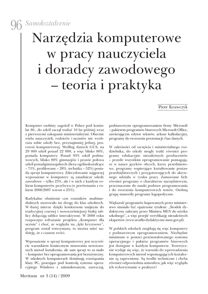 96 Samokształcenie Narzędzia komputerowe w pracy nauczyciela i doradcy zawodowego – teoria i praktyka Piotr Krawczyk Komputer osobisty zagościł w Polsce pod koniec lat 80., do szkół zaczął trafiać 10 lat później wraz z pierwszymi zakupami ministerialnymi. Obecnie wielu nauczycieli, rodziców i uczniów nie wyobraża sobie szkoły bez, przynajmniej jednej, pracowni komputerowej. Według danych GUS, na 29 000 szkół ponad 22 000, a więc blisko 80%, posiada komputery. Ponad 93% szkół podstawowych, blisko 80% gimnazjów i prawie połowa szkół ponadgimnazjalnych (licea ogólnokształcące – 71%, profilowane – 28%, technika – 52%) posiada sprzęt komputerowy. Zdecydowanie najgorzej wyposażone w komputery są zasadnicze szkoły zawodowe – tylko 25%, ale i w nich z każdym rokiem komputerów przybywa (w porównaniu z rokiem 2006/2007 wzrost o 25%). Radykalne obniżenie cen rzutników multimedialnych utorowało im drogę do klas szkolnych. W dużej mierze dzięki konkursom unijnym do tradycyjnej czarnej i nowocześniejszej białej tablicy dołączają tablice interaktywne. W 2008 roku rozpoczęto wdrażanie projektu „Komputer dla ucznia” i choć, ze względu na „lęki kryzysowe”, program został wstrzymany, to można mieć nadzieję, że z czasem wróci. Wyposażenie w sprzęt komputerowy jest oczywiście warunkiem koniecznym stosowania nowoczesnych metod kształcenia, ale sam sprzęt to za mało – komputer bez oprogramowania jest bezużyteczny. W szkolnych komputerach dominują rozwiązania klasy PC, pracujące pod kontrolą systemu operacyjnego Windows z zainstalowanym, zazwyczaj, Meritum nr 3 (14) / 2009 podstawowym oprogramowaniem firmy Microsoft – pakietem programów biurowych Microsoft Office, zawierającym edytor tekstów, arkusz kalkulacyjny, programy do tworzenia prezentacji i baz danych. W zależności od szczęścia i ministerialnego rozdzielnika, do szkoły mogły trafić również programy edukacyjne niezależnych producentów – przede wszystkim oprogramowanie pomagające w nauce języków obcych, kursy przedmiotowe, programy wspierające kształtowanie postaw przedsiębiorczych i przygotowujących do aktywnego udziału w rynku pracy. Zamawiane były również programy o charakterze narzędziowym, przeznaczone do nauki podstaw programowania i do tworzenia komputerowych testów. Osobną grupę stanowiły programy logopedyczne. Większość programów kupowanych przez ministerstwo musiało być opatrzone tytułem: „Środek dydaktyczny zalecany przez Ministra MEN do użytku szkolnego”, a więc przejść weryfikację niezależnych ekspertów (www.srodki-dydaktyczne.men.gov.pl). W polskich szkołach znajdują się więc komputery z podstawowym oprogramowaniem. Niezbędne minimum w postaci przeinstalowanego systemu operacyjnego i pakietu programów biurowych jest dostępne w każdym komputerze. Teoretycznie wydaje się więc, że warunki do wprowadzenia komputerowych metod wspomagających kształcenie są zapewnione. Są środki techniczne i chyba również odpowiednia atmosfera, jak więc wygląda ich wykorzystanie w praktyce? Komputer nie tylko na lekcjach informatyki W większości szkół komputery zlokalizowane są w sali komputerowej (pracowni informatycznej), szkolnych centrach informacji, szkolnych ośrodkach kariery, tzw. kafejkach internetowych, świetlicach szkolnych. Tradycyjnie już sala komputerowa to miejsce nauczyciela informatyki. To zrozumiałe – ten przedmiot nie może obejść się bez komputera, zwłaszcza w początkowych latach nauki. Dla niektórych dzieci lekcja informatyki to cały czas pierwszy kontakt z komputerem. Pierwsze rysunki w Paincie, listy redagowane w Notatniku, poznawanie systemu operacyjnego, narzędzi biurowych, obróbka zdjęć i filmów, tworzenie stron WWW, poznawanie komunikacji cyfrowej (poczta, czat, forum, komunikator, aukcje). Ćwiczenie tych umiejętności wymaga bezpośredniego kontaktu ucznia ze sprzętem. Jednak niezbędność komputera na lekcjach informatyki nie oznacza, że inne przedmioty komputera nie potrzebują! W wielu szkołach takie stanowisko – komputer dostępny wyłącznie na lekcjach informatyki – cały czas wygrywa z wymogami współczesnego świata. Świata, w którym błyskawiczny dostęp do informacji, komputerowe testy, telepraca, outsourcing, edukacja zdalna funkcjonują na równi z rozwiązaniami tradycyjnymi, nierzadko je zastępując. Skoro rewolucja cyfrowa stała się faktem, to dlaczego lekcje szkolne miałyby być enklawą przestarzałych rozwiązań, w której magnetofon kasetowy i odtwarzacz wideo stanowią ostatni krzyk mody? Może więc nie tylko informatyka, ale i historia z symulacjami bitew, interaktywnymi mapami czy trójwymiarową wizualizacją greckiej kolumny wymaga komputera. Język polski z elektronicznym dyktandem, reprodukcjami malarstwa i ekranowymi ćwiczeniami z gramatyki. Nauka języków obcych z udźwiękowionymi słownikami uwzględniającymi różne odmiany i dialekty. Matematyka z dynamicznie rysowanymi wykresami, modelami brył i generatorem zdarzeń losowych w schemacie Bernoulliego. Fizyka z modelowaniem rozpraszania fal świetlnych i odbić, animowanymi zderzeniami cząstek, modelami przemian gazowych, wizualizacjami działania sił, schematami przepływów. Chemia, na której lekcjach można nareszcie wirtualnie przeprowadzić również niebezpieczne doświadczenia, z mnóstwem dymu, ognia i trujących wyziewów. Lekcje przedsiębiorczości z konstruowaniem budżetów, redagowaniem ży- ciorysu i listu motywacyjnego, wirtualną giełdą. Czy wreszcie szkolnictwo zawodowe – od modelu obrabiarki do symulatora lokomotywy dla przyszłych maszynistów, wirtualnego polerowania soczewek i projektowania odzieży. 97 W zasadzie wszystkie przedmioty szkolne potrzebują, jeśli nie ciągłego, to przynajmniej okazjonalnego korzystania z komputerowych pomocy dydaktycznych. Należy zatem dążyć do integracji technologii informacyjnej z poszcz