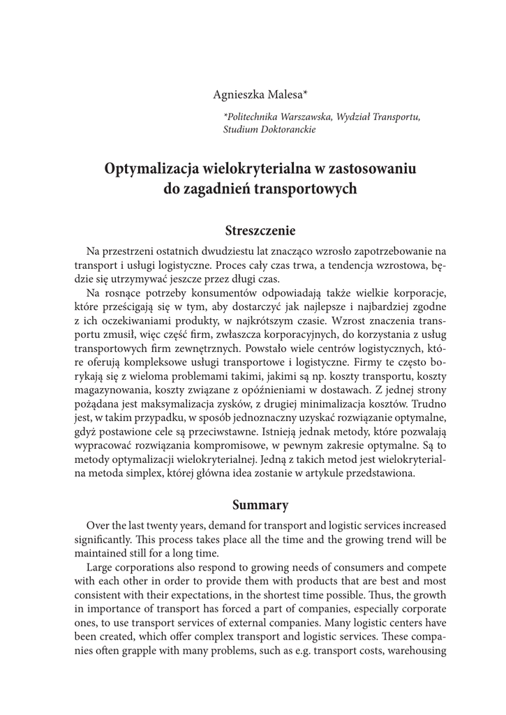Agnieszka Malesa* *Politechnika Warszawska, Wydział Transportu, Studium Doktoranckie Optymalizacja wielokryterialna w zastosowaniu do zagadnień transportowych Streszczenie Na przestrzeni ostatnich dwudziestu lat znacząco wzrosło zapotrzebowanie na transport i usługi logistyczne. Proces cały czas trwa, a tendencja wzrostowa, będzie się utrzymywać jeszcze przez długi czas. Na rosnące potrzeby konsumentów odpowiadają także wielkie korporacje, które prześcigają się w tym, aby dostarczyć jak najlepsze i najbardziej zgodne z ich oczekiwaniami produkty, w najkrótszym czasie. Wzrost znaczenia transportu zmusił, więc część firm, zwłaszcza korporacyjnych, do korzystania z usług transportowych firm zewnętrznych. Powstało wiele centrów logistycznych, które oferują kompleksowe usługi transportowe i logistyczne. Firmy te często borykają się z wieloma problemami takimi, jakimi są np. koszty transportu, koszty magazynowania, koszty związane z opóźnieniami w dostawach. Z jednej strony pożądana jest maksymalizacja zysków, z drugiej minimalizacja kosztów. Trudno jest, w takim przypadku, w sposób jednoznaczny uzyskać rozwiązanie optymalne, gdyż postawione cele są przeciwstawne. Istnieją jednak metody, które pozwalają wypracować rozwiązania kompromisowe, w pewnym zakresie optymalne. Są to metody optymalizacji wielokryterialnej. Jedną z takich metod jest wielokryterialna metoda simplex, której główna idea zostanie w artykule przedstawiona. Summary Over the last twenty years, demand for transport and logistic services increased significantly. This process takes place all the time and the growing trend will be maintained still for a long time. Large corporations also respond to growing needs of consumers and compete with each other in order to provide them with products that are best and most consistent with their expectations, in the shortest time possible. Thus, the growth in importance of transport has forced a part of companies, especially corporate ones, to use transport services of external companies. Many logistic centers have been created, which offer complex transport and logistic services. These companies often grapple with many problems, such as e.g. transport costs, warehousing Agnieszka Malesa 42 costs, costs related to delays in deliveries. On the one hand, it is desired to maximize profits, while, on the other hand – to minimize costs. In such a case, it is difficult to obtain, in an unambiguous manner, the optimal solution, as the assumed goals are contrary. However, there are methods that enable us to develop compromise solutions, optimal to some extent. These are methods of multi-criteria optimization. One of such methods is a multi-criteria simplex method, the main idea of which will be discussed in this article. Wstęp Złożoność procesów transportowych niesie za sobą konieczność poszukiwania nowych rozwiązań, pozwalających na skuteczną ich optymalizację. W obecnych czasach proces ten, występuje nie tylko w transporcie, ale często także w naszym życiu codziennym. Optymalizujemy zapasy żywności, budżet rodzinny, czas pracy, drogę do/ze szkoły. Czym zatem są rozwiązania optymalne i czy dla każdego w danej sytuacji i środowisku istnieje tylko jedno rozwiązanie, które jest tym najbardziej pożądanym? Otóż nie, dla każdego podejmującego decyzje, rozwiązaniem optymalnym problemu może być coś zupełnie innego. Wszystko zależy od preferencji i stanu wiedzy, jaką w danej chwili posiada osoba decydująca, a także od środowiska i warunków, w jakich przyszło jej podejmować decyzje. Najkrócej mówiąc: ”Optymalizacja – jest to metoda wyznaczania najlepszego (optymalnego) rozwiązania (poszukiwanie ekstremum funkcji) z punktu widzenia określonego kryterium (wskaźnika) jakości (np. kosztu, drogi, wydajności)”1. Istnieje wiele metod wyznaczania rozwiązań optymalnych, a ich liczba ciągle rośnie, bo i potrzeby optymalizacji w dzisiejszych czasach są coraz większe. Nic więc dziwnego, że i w transporcie odgrywa ona bardzo istotną rolę. Transport jest tą częścią biznesu, w której bardzo liczy się czas. Często dostawcy mają określone okienka dostaw, w których mogą dostarczyć produkt do odbiorcy, a w dodatku mają na to np. 24h, dodatkowo optymalizują koszty transportu np. poprzez maksymalne wykorzystanie przestrzeni ładunkowej oraz łączenie przesyłek do kilku odbiorców i wysyłanie jak najmniejszej liczby samochodów (koszt paliwa), co nie zawsze idzie w parze z optymalizacją czasu dostawy. Złożoność problemu oraz liczba kryteriów, które mogą być optymalizowane w transporcie jest bardzo duża, a wpływ kosztów transportu na funkcjonowanie przedsiębiorstwa znaczący. Dlatego tak ważne jest odpowiednie zarządzanie procesami transportowymi. Optymalizację możemy podzielić na dwie grupy: jedno- i wielokryterialną, w zależności od liczby przyjętych funkcji celu. O ile algorytmy do optymalizacji jednokryterialnej są dość powszechnie używane i skuteczne np. algorytm simplex, algorytm transportowy, o tyle w przypadku optymalizacji wielokryterialnej nie opracowano jeszcze skutecznego algorytmu, który w sposób jednoznaczny wyznaczałby rozwiązania optymalne. Ze względu na złożoność procesów trans- Optymalizacja wielokryterialna w zastosowaniu do zagadnień... 43 portowych właśnie taki algorytm jest najbardziej pożądany, gdyż zazwyczaj istnieje potrzeba optymalizacji więcej aniżeli jednego kryterium. Przykładem zadania wielokryterialnego może być optymalizacja pracy środków transportowych przy optymalnym (minimalnym) koszcie i czasie dostawy. Choć nie istnieje jednoznaczne rozwiązanie problemów wielokryterialnych, to istnieje szereg metod, dzięki którym możemy otrzymać rozwiązania kompromisowe i najlepsze np. w danym środowisku czy też ze względu na przyjęte kryteria. Celem tego artykułu jest przedstawienie idei, jednej z metod