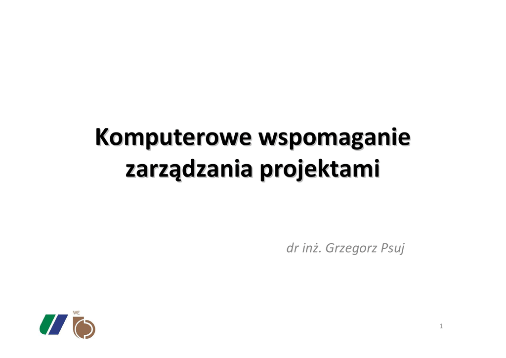 Komputerowe wspomaganie zarządzania projektami dr inż. Grzegorz Psuj 1 Wprowadzenie • Wymiar godzinowy: – Wykład: 30 – Ćwiczenia projektowe: 30 • Punkty ECTS: 4 • Jednostka: – Katedra Elektrotechniki Teoretycznej i Informatyki • Konsultacje: – poniedziałki 13-14, wtorki 9-10 Wprowadzenie • Cel przedmiotu: - zdobycie umiejętności tworzenia projektów i zarządzania przedsięwzięciami przy wykorzystaniu techniki komputerowej • Wymagania wstępne: - informatyka 1, 2, 3 Wprowadzenie WYKŁAD I.Program Definicja projektu, Wstępny plan, opis i harmonogram projektu, doprecyzowanie planu projektu, śledzenie realizacji projektu, analiza informacji o projekcie: budżet, analiza PERT, diagramy Gantta, ścieżki krytyczne, wartość wypracowana, 6. Rozwiązywanie problemów w projekcie: czas i harmonogram, zasoby i koszty, optymalizacja zadań projektowych: pula zasobów, projekt główny i podprojekty, tworzenie zależności między projektami, łączenie i scalanie projektów, wykorzystanie narzędzi wspomagających zarządzanie projektami. Wprowadzenie WYKŁAD II. Sposób prowadzenia zajęć - Wykład z wykorzystaniem technik audiowizualnych - Wykład z wykorzystaniem demonstracji - Pokaz urządzeń III. Sposób oceny - Zaliczenie na podstawie aktywności Wprowadzenie ĆWICZENIA PROJEKTOWE I.Program - Wykorzystanie programu MS Project do zarządzania projektami na przykładzie małego teoretycznego projektu zaproponowanego przez prowadzącego zajęcia II. Sposób prowadzenia zajęć - Zajęcia projektowe; samodzielna realizacja projektu III. Sposób oceny - Zaliczenie na podstawie sprawozdania z projektu Wprowadzenie LITERATURA 1.Wilczewski S. „MS Project 2000. Ćwiczenia praktyczne” Helion 2002 2.Duffy M. G. „Zarządzanie projektami” OnePress 3.Pawlak M. „Zarządzanie projektami” PWN Warszawa 2007 4.Wilczewski S. „MS Project 2003. Zarządzanie projektami” Helion 2006 5.Wilczewski S. „MS Project 2007. MS Project Server 2007. Efektywne zarządzanie projektami” Helion 2008 Wprowadzenie LITERATURA Wilczewski S. „MS Project 2000. Ćwiczenia praktyczne” Helion 2002 -tworzenie harmonogramów projektów -definiowanie zasobów, które posłużą do wykonania zaplanowanych działań -praktyczne ćwiczeń pokazujące krok po kroku tworzenie harmonogramu dużego projektu w Microsoft Project Wprowadzenie LITERATURA Duffy M. G. „Zarządzanie projektami” Helion 2007 - definiowanie celów projektu -omówienie etapów tworzenia harmonogramu -przedstawienie przygotowania budżetu do realizacji projektu -zarządzanie zespołem ludzi -skuteczne wykorzystywanie narzędzi do zarządzania projektem Wprowadzenie LITERATURA Pawlak M. „Zarządzanie projektami” PWN Warszawa 2007 -minimum programowe zagadnień związanych z zarządzaniem projektami -przedstawienie interdyscyplinarnego charakteru zarządzania projektami Wprowadzenie LITERATURA Wilczewski S. „MS Project 2003. Zarządzanie projektami” Helion 2006 -interfejs użytkownika, narzędzia i polecenia menu -sposoby definiowania projektu, harmonogramowania oraz zarządzania zasobami i zadaniami -wprowadzanie danych dotyczących faktycznej realizacji projektu, generowanie wykresów i raportów -wymiana danych MS Project z innymi aplikacjami Wprowadzenie LITERATURA Wilczewski S. „MS Project 2007. MS Project Server 2007. Efektywne zarządzanie projektami” Helion 2008 -definiowanie zakresu projektu, planowanie zasobów i przydzielanie ich do zadań, optymalizowanie projektu i śledziennie procesu jego realizacji -tworzenie raportów tekstowych i graficznych oraz nadzorowanie zmian w wielu projektach i analizowanie ich portfela
