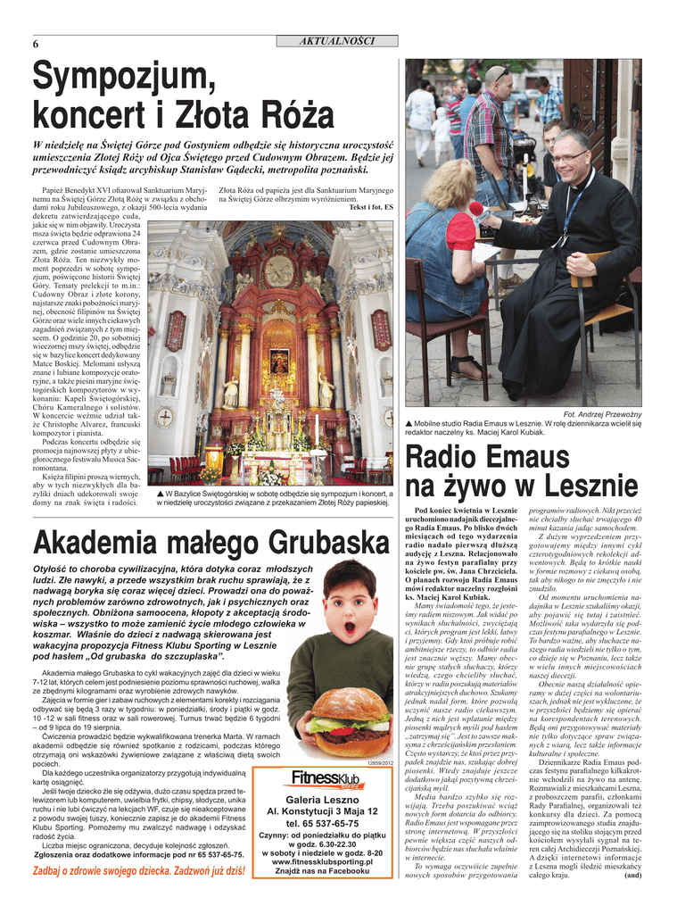 6 AKTUALNOŚCI Sympozjum, koncert i Złota Róża W niedzielę na Świętej Górze pod Gostyniem odbędzie się historyczna uroczystość umieszczenia Złotej Róży od Ojca Świętego przed Cudownym Obrazem. Będzie jej przewodniczyć ksiądz arcybiskup Stanisław Gądecki, metropolita poznański. Papież Benedykt XVI ofiarował Sanktuarium MaryjZłota Róża od papieża jest dla Sanktuarium Maryjnego nemu na Świętej Górze Złotą Różę w związku z obchona Świętej Górze olbrzymim wyróżnieniem. Tekst i fot. ES dami roku Jubileuszowego, z okazji 500-lecia wydania dekretu zatwierdzającego cuda, jakie się w nim objawiły. Uroczysta msza święta będzie odprawiona 24 czerwca przed Cudownym Obrazem, gdzie zostanie umieszczona Złota Róża. Ten niezwykły moment poprzedzi w sobotę sympozjum, poświęcone historii Świętej Góry. Tematy prelekcji to m.in.: Cudowny Obraz i złote korony, najstarsze znaki pobożności maryjnej, obecność filipinów na Świętej Górze oraz wiele innych ciekawych zagadnień związanych z tym miejscem. O godzinie 20, po sobotniej wieczornej mszy świętej, odbędzie się w bazylice koncert dedykowany Matce Boskiej. Melomani usłyszą znane i lubiane kompozycje oratoryjne, a także pieśni maryjne świętogórskich kompozytorów w wykonaniu: Kapeli Świętogórskiej, Chóru Kameralnego i solistów. W koncercie weźmie udział także Christophe Alvarez, francuski kompozytor i pianista. Podczas koncertu odbędzie się promocja najnowszej płyty z ubiegłorocznego festiwalu Musica Sacromontana. Księża filipini proszą wiernych, aby w tych niezwykłych dla baV W Bazylice Świętogórskiej w sobotę odbędzie się sympozjum i koncert, a zyliki dniach udekorowali swoje w niedzielę uroczystości związane z przekazaniem Złotej Róży papieskiej. domy na znak święta i radości. Akademia małego Grubaska Otyłość to choroba cywilizacyjna, która dotyka coraz młodszych ludzi. Złe nawyki, a przede wszystkim brak ruchu sprawiają, że z nadwagą boryka się coraz więcej dzieci. Prowadzi ona do poważnych problemów zarówno zdrowotnych, jak i psychicznych oraz społecznych. Obniżona samoocena, kłopoty z akceptacją środowiska – wszystko to może zamienić życie młodego człowieka w koszmar. Właśnie do dzieci z nadwagą skierowana jest wakacyjna propozycja Fitness Klubu Sporting w Lesznie pod hasłem „Od grubaska do szczuplaska”. Akademia małego Grubaska to cykl wakacyjnych zajęć dla dzieci w wieku 7-12 lat, których celem jest podniesienie poziomu sprawności ruchowej, walka ze zbędnymi kilogramami oraz wyrobienie zdrowych nawyków. Zajęcia w formie gier i zabaw ruchowych z elementami korekty i rozciągania odbywać się będą 3 razy w tygodniu: w poniedziałki, środy i piątki w godz. 10 -12 w sali fitness oraz w sali rowerowej. Turnus trwać będzie 6 tygodni – od 9 lipca do 19 sierpnia. Ćwiczenia prowadzić będzie wykwalifikowana trenerka Marta. W ramach akademii odbędzie się również spotkanie z rodzicami, podczas którego otrzymają oni wskazówki żywieniowe związane z właściwą dietą swoich 12859/2012 pociech. Dla każdego uczestnika organizatorzy przygotują indywidualną kartę osiągnięć. Jeśli twoje dziecko źle się odżywia, dużo czasu spędza przed telewizorem lub komputerem, uwielbia frytki, chipsy, słodycze, unika Galeria Leszno ruchu i nie lubi ćwiczyć na lekcjach WF, czuje się nieakceptowane Al. Konstytucji 3 Maja 12 z powodu swojej tuszy, koniecznie zapisz je do akademii Fitness tel. 65 537-65-75 Klubu Sporting. Pomożemy mu zwalczyć nadwagę i odzyskać Czynny: od poniedziałku do piątku radość życia. w godz. 6.30-22.30 Liczba miejsc ograniczona, decyduje kolejność zgłoszeń. w soboty i niedziele w godz. 8-20 Zgłoszenia oraz dodatkowe informacje pod nr 65 537-65-75. www.fitnessklubsporting.pl Znajdź nas na Facebooku Zadbaj o zdrowie swojego dziecka. Zadzwoń już dziś! Fot. Andrzej Przewoźny V Mobilne studio Radia Emaus w Lesznie. W rolę dziennikarza wcielił się redaktor naczelny ks. Maciej Karol Kubiak. Radio Emaus na żywo w Lesznie Pod koniec kwietnia w Lesznie uruchomiono nadajnik diecezjalnego Radia Emaus. Po blisko dwóch miesiącach od tego wydarzenia radio nadało pierwszą dłuższą audycję z Leszna. Relacjonowało na żywo festyn parafialny przy kościele pw. św. Jana Chrzciciela. O planach rozwoju Radia Emaus mówi redaktor naczelny rozgłośni ks. Maciej Karol Kubiak. Mamy świadomość tego, że jesteśmy radiem niszowym. Jak widać po wynikach słuchalności, zwyciężają ci, których program jest lekki, łatwy i przyjemny. Gdy ktoś próbuje robić ambitniejsze rzeczy, to odbiór radia jest znacznie węższy. Mamy obecnie grupę stałych słuchaczy, którzy wiedzą, czego chcieliby słuchać, którzy w radiu poszukują materiałów atrakcyjniejszych duchowo. Szukamy jednak nadal form, które pozwolą uczynić nasze radio ciekawszym. Jedną z nich jest wplatanie między piosenki mądrych myśli pod hasłem „zatrzymaj się”. Jest to zawsze maksyma z chrześcijańskim przesłaniem. Często wystarczy, że ktoś przez przypadek znajdzie nas, szukając dobrej piosenki. Wtedy znajduje jeszcze dodatkowo jakąś pozytywną chrześcijańską myśl. Media bardzo szybko się rozwijają. Trzeba poszukiwać wciąż nowych form dotarcia do odbiorcy. Radio Emaus jest wspomagane przez stronę internetową. W przyszłości pewnie większa część naszych odbiorców będzie nas słuchała właśnie w internecie. To wymaga oczywiście zupełnie nowych sposobów przygotowania programów radiowych. Nikt przecież nie chciałby słuchać trwającego 40 minut kazania jadąc samochodem. Z dużym wyprzedzeniem przygotowujemy między innymi cykl czterotygodniowych rekolekcji adwentowych. Będą to krótkie nauki w formie rozmowy z ciekawą osobą, tak aby nikogo to nie zmęczyło i nie znudziło. Od momentu uruchomienia nadajnika w Lesznie szukaliśmy okazji, aby pojawić się tu