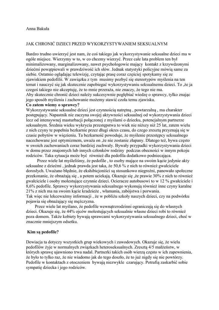 Anna Bakuła JAK CHRONIĆ DZIECI PRZED WYKORZYSTYWANIEM SEKSUALNYM Bardzo trudno uwierzyć jest nam, że coś takiego jak wykorzystywanie seksualne dzieci ma w ogóle miejsce. Wierzymy w to, w co chcemy wierzyć. Przez całe lata problem ten był minimalizowany, marginalizowany, nawet psychologowie mający kontakt z krzywdzonymi dziećmi powątpiewali w prawdziwość ich słów. Jednak statystyki policyjne mówią same za siebie. Ostatnio oglądając telewizję, czytając prasę coraz częściej spotykamy się ze zjawiskiem pedofilii. W zawiązku z tym musimy pozbyć się stereotypów myślenia na ten temat i nauczyć się jak skutecznie zapobiegać wykorzystywaniu seksualnemu dzieci. To ,że ja czegoś takiego nie akceptuję, że to mnie przeraża, nie znaczy, że tego nie ma. Aby skutecznie chronić dzieci należy sukcesywnie pogłębiać wiedzę o sprawcy, tylko znając jego sposób myślenia i zachowanie możemy stawić czoła temu zjawisku. Co zatem wiemy o sprawcy? Wykorzystywanie seksualne dzieci jest czynnością natrętną , powtarzalną , ma charakter postępujący. Napastnik nie zaczyna swojej aktywności seksualnej od wykorzystywania dzieci lecz od intensywnej masturbacji połączonej z myślami o dziecku, potencjalnym partnerze seksualnym. Średnia wieku wykrycia przestępstwa to wiek nie niższy niż 25 lat, zatem wielu z nich czyny te popełnia bezkarnie przez długi okres czasu, do czego zresztą przyznają się w czasie pobytów w więzieniu. Ta bezkarność powoduje, że myślenie przestępcy seksualnego nacechowane jest optymizmem, uważa on ,że nie zostanie złapany. Dlatego też, bywa często w swoich zachowaniach coraz bardziej zuchwały. Bywały przypadki wykorzystywania dzieci w domu przez znajomych lub innych członków rodziny podczas obecności w innym pokoju rodziców. Taka sytuacja może być również dla pedofila dodatkowo podniecająca. Przez wiele lat myśleliśmy, że pedofile , to osoby mające na swoim kącie jedynie akty seksualne z dziećmi , jednak prawda jest taka, że 50,6 % z nich to również gwałciciele dorosłych. Uważano błędnie, że ekshibicjoniści są stosunkowo niegroźni, panowało społeczne przekonanie, że obnażają się , a potem uciekają. Okazuje się ,że prawie 30% z nich to również gwałciciele i osoby molestujące czynnie dzieci. Ocieracze autobusowi to w 12 % gwałciciele i 8,6% pedofile. Sprawcy wykorzystywania seksualnego wykonują również inne czyny karalne 21% z nich ma na swoim kącie kradzieże , włamania, zabójstwa i porwania. Tak więc nie lekceważmy informacji , że w pobliżu szkoły naszych dzieci, czy na podwórku pojawia się obnażający się mężczyzna. Przez wiele lat myślano, że pedofile wewnątrzrodzinni ograniczają się do własnych dzieci. Okazuje się, że 44% ojców molestujących seksualnie własne dzieci robi to również poza domem. Także kobiety bywają sprawcami wykorzystywania seksualnego dzieci, choć w znacznie mniejszym odsetku. Kim są pedofile? Dewiacja ta dotyczy wszystkich grup wiekowych i zawodowych. Okazuje się, że wielu pedofilów żyje w normalnych związkach heteroseksualnych. Zresztą 4/5 małżeństw, w których sprawę ujawniono trwa nadal. Partnerki takich osób wierzą często w ich zapewnienia, że było to tylko raz, że nie wiadomo jak do tego doszło, że to już nigdy się nie powtórzy. Pedofile w kontaktach z otoczeniem bywają niezwykle czarujący. Potrafią zaskarbić sobie sympatię dziecka i jego rodziców. Wykorzystywanie seksualne dzieci nie jest przypadkowym aktem, opiera się ono o cały cykl zazębiających się emocji, myśli i zachowań. Cykl ten nazywamy cyklem dewiacyjnym. Można przedstawić go w następujący sposób: CYKL DEWIACYJNY 1.Nieprzyjemne emocje, złość, gniew, znudzenie – dają one początek cyklowi dewiacyjnemu, przy ich odczuwaniu, w pewnym momencie pojawia się potrzeba zmniejszenia napięcia , połączona z myślami o wykorzystaniu seksualnym dziecka. 2.Pozornie nieważne decyzje lub rozmyślny zamiar – pedofil ułatwia sobie dostęp do dzieci szukając miejsc, gdzie one przebywają np. zatrudnia się na placu zabaw, jako wolontariusz w Domu Dziecka, ratownik na basenie albo stara się zaprzyjaźnić z rodzicami dzieci. 3.Czynniki wysokiego ryzyka – są wszędzie tam , gdzie pedofil ma bezpośredni dostęp do dziecka, organizuje wycieczkę z dziećmi, organizuje jakieś zabawy, zaprasza je do siebie do domu, zobowiązuje się przed rodzicami, że popilnuje dziecko, gdy oni pójdą do kina. Stara się tak wszystko zorganizować, aby dzieci zostały z nim same. Zaprzyjaźniony z samotną matką namawia ja na wieczór z przyjaciółką. Rodzice oczywiście niczego nie podejrzewają, często nawet złoszczą się na dzieci, gdy te niechętnie zostają z owym ,,miłym ‘’ wujkiem. Pedofil jest osobą dbająca o swój wizerunek, nikt się nie spodziewa, że ten miły, lubiący dzieci pan może być jednocześnie ich oprawcą. Rodzice nie chcą uwierzyć temu co opowiada dziecko, uważają, że dziecko fantazjuje, bo przecież taki wspaniały nauczyciel nie może być pedofilem ! 4.Wybór celu – często bywa tak, że dziecko jest przez pedofila starannie dobrane. Szukają oni dzieci samotnych, trochę stojących na uboczu, zaniedbanych przez rodziców, biednych, z rodzin wielodzietnych lub dysfunkcyjnych, z chorobą alkoholowa lub psychiczną rodziców. Często są to dzieci matek karzących, odległych, nadmiarowo wymagających i szorstkich. Choć oczywiście nie zawsze jest to regułą. Bywa tak, że dziecko zdecydowanie jest fizycznie atrakcyjne dla pedofila. Należy tu zaznaczyć, że część z pedofilów to osoby zdecydowanie zorientowane seksualnie na dzieci. Ci, bardzo ,,omotują ‘’ dziecko, dając mu prezenty, stając się jego powiernikiem i przyjacielem, zbliżając się bardzo emocjonalnie do dziecka i sprawiając, że dziecko spostrzega ich jako wiernych przyjaciół. Część zaś z nich zabiega o ten k