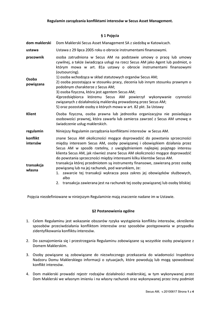 Regulamin zarządzania konfliktami interesów w Secus Asset Management. § 1 Pojęcia dom maklerski Dom Maklerski Secus Asset Management SA z siedzibą w Katowicach. ustawa Ustawa z 29 lipca 2005 roku o obrocie instrumentami finansowymi. pracownik osoba zatrudniona w Secus AM na podstawie umowy o pracę lub umowy cywilnej, a także świadcząca usługi na rzecz Secus AM jako Agent lub podmiot, o którym mowa w art. 81a ustawy o obrocie instrumentami finansowymi (outsourcing). 1) osoba wchodząca w skład statutowych organów Secus AM; 2) osoba pozostająca w stosunku pracy, zlecenia lub innym stosunku prawnym o podobnym charakterze z Secus AM; 3) osoba fizyczna, która jest agentem Secus AM; 4)przedsiębiorca któremu Secus AM powierzył wykonywanie czynności związanych z działalnością maklerską prowadzoną przez Secus AM; 5) oraz pozostałe osoby o których mowa w art. 82 pkt. 3a Ustawy Osoba powiązana Klient Osoba fizyczna, osoba prawna lub jednostka organizacyjna nie posiadająca osobowości prawnej, która zawarła lub zamierza zawrzeć z Secus AM umowę o świadczenie usług maklerskich. regulamin Niniejszy Regulamin zarządzania konfliktami interesów w Secus AM. konflikt intersów znane Secus AM okoliczności mogące doprowadzić do powstania sprzeczności między interesem Secus AM, osoby powiązanej i obowiązkiem działania przez Secus AM w sposób rzetelny, z uwzględnieniem najlepiej pojętego interesu klienta Secus AM, jak również znane Secus AM okoliczności mogące doprowadzić do powstania sprzeczności między interesami kilku klientów Secus AM. transakcja której przedmiotem są instrumenty finansowe, zawieraną przez osobę powiązaną lub na jej rachunek, pod warunkiem, że: 1. zawarcie tej transakcji wykracza poza zakres jej obowiązków służbowych, albo 2. transakcja zawierana jest na rachunek tej osoby powiązanej lub osoby bliskiej transakcja własna Pojęcia niezdefiniowane w niniejszym Regulaminie mają znaczenie nadane im w Ustawie. §2 Postanowienia ogólne 1. Celem Regulaminu jest wskazanie obszarów ryzyka wystąpienia konfliktu interesów, określenie sposobów przeciwdziałania konfliktom interesów oraz sposobów postępowania w przypadku zidentyfikowania konfliktu interesów. 2. Do zaznajomienia się i przestrzegania Regulaminu zobowiązane są wszystkie osoby powiązane z Domem Maklerskim. 3. Osoby powiązane są zobowiązane do niezwłocznego przekazania do wiadomości Inspektora Nadzoru Domu Maklerskiego informacji o sytuacjach, które powodują lub mogą spowodować konflikt interesów. 4. Dom maklerski prowadzi rejestr rodzajów działalności maklerskiej, w tym wykonywanej przez Dom Maklerski we własnym imieniu i na własny rachunek oraz wykonywanej przez inny podmiot Secus AM, v.20100617 Strona 1 z 4 na rachunek Domu Maklerskiego, w związku z którymi powstał lub może powstać konflikt interesów powiązany z ryzykiem naruszenia interesów klienta. § 3 Obszary ryzyka wystąpienia konfliktu interesów 1. Konflikt interesów może powstać pomiędzy: a) Domem Maklerskim, a klientem Domu Maklerskiego, b) Osobą powiązaną z Domem Maklerskim, a Klientem Domu Maklerskiego, c) Klientami Domu Maklerskiego, 2. Konflikt interesów, rozumiany jako sytuacja w której świadczenie usług na rzecz klienta Domu Maklerskiego przynosi korzyści Domowi Maklerskiemu, osobom powiązanym, innym klientom przy jednoczesnym negatywnym wpływie na interesy innego klienta lub klientów, może w szczególności dotyczyć sytuacji w której: a) Dom Maklerski lub osoba powiązana może osiągnąć korzyść finansową lub uniknąć straty finansowej kosztem Klienta, b) Dom Maklerski lub osoba powiązana może osiągnąć korzyść finansową lub uniknąć straty finansowej przedkładając interes jednego z Klientów (lub grupy Klientów) nad interes innego Klienta (lub grupy Klientów), c) Dom Maklerski lub osoba powiązana ma interes w określonym efekcie usługi świadczonej dla Klienta i interes ten nie jest tożsamy z interesem Klienta, d) Dom Maklerski lub osoba powiązana prowadzi działalność konkurencyjną w stosunku do działalności Klienta, e) Dom Maklerski lub osoba powiązana otrzymuje lub może otrzymać od osoby innej niż Klient zachętę (finansową, rzeczową, w formie usługi) ponad standardowe wynagrodzenie od Klienta za wykonanie tej usługi, 3. Do sytuacji, w których może wystąpić konflikt interesów należą w szczególności okoliczności, gdy: a) Dom Maklerski świadczy usługi doradcze podmiotom prowadzącym działalność konkurencyjną, b) Dom Maklerski, jego akcjonariusze, członkowie władz lub pracownicy: i. są zainteresowani zawarciem przez Klienta transakcji niekorzystnej dla Klienta w celu osiągnięcia własnego celu inwestycyjnego, ii. są stroną transakcji z Klientem Domu Maklerskiego iii. posiadają negatywne informacje posiadanych aktywów, które wchodzą w skład portfeli zarządzanych przez Dom Maklerski i w pierwszej kolejności dokonują transakcji własnymi aktywami, iv. otrzymują prezenty, uczestniczą w spotkaniach sponsorowanych przez podmioty, których intencją jest wpłynięcie na postępowanie domu maklerskiego w sposób sprzeczny z interesem Klienta Domu Maklerskiego. c) Dom Maklerski w pierwszej kolejności realizuje despocję Klienta będącego członkiem władz, pracownikiem lub osobą bliską tych osób, w ten sposób, że dyspozycje innych Klientów są realizowane z opóźnieniem mającym wpływ na sytuację finansową lub inny interes tych Klientów. d) Dom Maklerski współpracuje z Klientem, którego interesy są potencjalnie sprzeczne z transakcjami wykonywanymi przez pracowników Domu Maklerskiego. § 4 Przeciwdziałanie konfliktom interesów. 1. Dom Maklerski unika sytuacji w której konflikt interesów mógłby powstać. Secus AM, v.20100617 Strona 2 z 4 2. Dom Maklerski podejmuje świadome działania w celu zapobiegania powstania konfliktu interesów oraz wprowadza rozwiązania maj