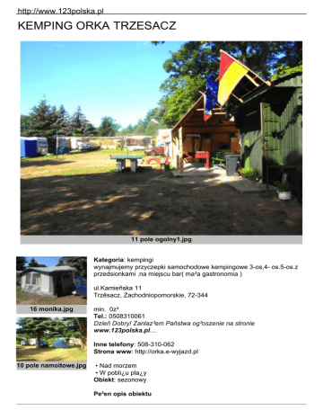 http://www.123polska.pl KEMPING ORKA TRZESACZ 11 pole ogolny1.jpg Kategoria: kempingi wynajmujemy przyczepki samochodowe kempingowe 3-os,4- os.5-os.z przedsionkami .na miejscu bar( ma³a gastronomia ) ul.Kamieñska 11 Trzêsacz, Zachodniopomorskie, 72-344 16 monika.jpg min. 0z³ Tel.: 0508310061 Dzieñ Dobry! Zanlaz³em Pañstwa og³oszenie na stronie www.123polska.pl.... Inne telefony: 508-310-062 Strona www: http://orka.e-wyjazd.pl 10 pole namoitowe.jpg • Nad morzem • W pobli¿u pla¿y Obiekt: sezonowy Pe³en opis obiektu http://www.123polska.pl 08 pla¿a.jpg 100 miejsc noclegowych . POLE KEMPINGOWE CZYNNE OD 24 CZERWCA DO 4 wrza¶nia .NASZ E-MAIL" [email protected] :PRZY REZERWACJI POBIERAMY ZADATEK 20 % WARTO¦CI .Na konto mbank 09 1140 2004 0000 3502 3958 2196 DOBA rozpoczyna siê o godz. 13.00 pierwszego dnia , koñczy siê o godz. 11.00 ostatniego dniaPole kempingowe „ ORKA „ znajduje siê ok.150 m od nowego zej¶cia na pla¿e .Sklepy spo¿ywcze i restauracje znajduj± siê w odleg³o¶ci ok. 100 m . Teren jest ogrodzony , o¶wietlony . Wynajmujemy wygodne przyczepki kempingowe 3 – 4 – 5 – cio osobowe wyposa¿one wPr±d , przedsionek , krzes³a i stó³ ogrodowy, 2 komplety po¶cieli wraz z poszewkami .W wiêkszo¶ci przyczepek s± lodówki . ( do przyczepek nie jest doprowadzona woda która znajduje ok. 10 m od przyczepek ) Oferowane pokoje: Ca³kowieta ilo¶c miejsc noclegowych: ok. 100 Cena za osobê (w SEZONIE): Cennik: inne CENNIK NA SEZON LETNI 2010 NA DOBÊ:op³ata miejscowa osoby doros³e 1.60 z³op³ata miejscowa dzieci i m³odzie¿ 0.80 z³Wynajêcie przyczep kempingowych ( w cenie pobyt osób )3 - osobowa - 66 z³4 - osobowa - 88 z³5 - osobowa - 100 z³pobyt psa w wynajmowanej przez nas przyczepce- 5 z³Wyposa¿enie przyczep kempingowych :(pr±d, przedsionek , krzes³a i stó³ ogrodowy,2 kpl .po¶cieli + poszewkipobyt osoby doros³ej pod namiotem lub karawaningu- 8 z³pobyt dzieci do lat 12 pod namiotem lub karawaningu5 z³USTAWIENIE NAMIOTU 1 - 2 osobowego7 z³USTAWIENIE NAMIOTU 3 - 5 osobowego 9 z³Ustawienie przyczepy kempingowej 3 os / 4 - 5 os - 20 z³ /30 z³pod³±czenie pr±du do karawaningu lub namiotu5 z³ustawienie przedsionka lub namiotu ogrodowego5 z³ustawienie samochodu przy kempingu lub namiocie3 z³ustawienie samochodu na parkingugratisprysznic 10 minut-2.50 z³prysznic dla osób spoza o¶rodka 10 minut5 z³pralka 1 wsad ( pralka automatyczna )7 z³Wypo¿yczenie przed³u¿acza ( na pobyt )5 z³Wypo¿yczalnia sprzêtu sportowego: (badminton, ping-ponga, pi³ki do koszykówki, siatkówki itp.) Gry pi³arzyki .Dart s quady,rowerki czteroko³owe . itpCennik na miejscu Wy¿ywienie: • Bar lub punkt gastronomiczny w obiekcie Na terenie obiektu: • pralnia • salka TV • gry zrêczno¶ciowe • plac zabaw • boisko do pi³ki siatkowej • tenis sto³owy • mo¿liwo¶æ przechowania rowerów • wypo¿yczalnia sprzetu sportowego http://www.123polska.pl • parking Inne: WYPO¯YCZALNIA ROWERÓW TRZYKO£OWYCH oraz quad dziecinny Pozosta³e: • wystawiamy faktury VAT • akceptujemy zwierzêta W NIEKTÓRYCH pokojach apartamentach domkach: • lodówka Inne: toalety ogólnodostêpne, prysznic p³atny 2.50 z³za 10 min Opis otoczenia TRZÊSACZ po³o¿ony jest miêdzy Rewalem a Pobierowem w zachodnio - pomorskim . Pole kempingowe „ ORKA „ znajduje siê ok.150 m od owego zej¶cia na pla¿e.Sklepy spo¿ywcze i restauracje znajduj± siê w odleg³o¶ci ok. 100 m . Teren jest ogrodzony , o¶wietlony . Atrakcje turystyczne: Oprócz wypoczynku na czystej pla¿y, k±pieli w wodach Ba³tyku proponujemy skorzystanie z okolicznych atrakcji, do których nale¿± m. in.:- Ruiny Ko¶cio³a, 150 m.- Lotnisko dla paralotniarzy, 100 mStadnina koni, 100 m- Kolejka w±skotorowa „ RETRO”, 120 m- Liczne imprezy rozrywkowe w Rewalu, 700m.- Latarnia morska w Niechorzu Dojazd: Trzêacz po³o¿ony jest miêdzy Rewalem a Pobierowem w woj. Zachodniopomorskim. Dojazd poci±giem do Ko³obrzegu i dalej Autobusem w stonê Miêdzyzdrojówdo rewala W pobli¿u: do sklepu: 0.1 km do supermarketu / marketu: 23 km do morza: 015 km do pla¿y strze¿onej: 0,16 km restauracje / kawiarnie / bary: na miejscu km dyskoteka / dancing / klub nocny: 0,5 km s³u¿by medyczne: 0,8 km poczta: 1 km bank / bankomat: 1 km budka telefoniczna: 0,2 km dworzec / przystanek PKS: 2 km dworzec PKP: 55 km