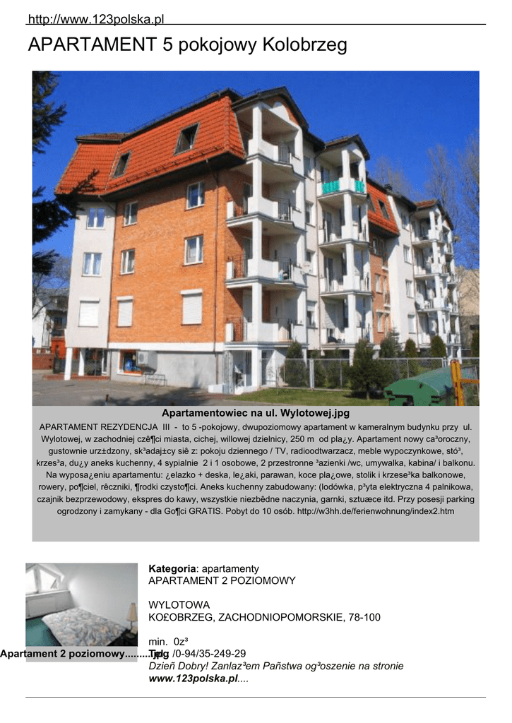http://www.123polska.pl APARTAMENT 5 pokojowy Kolobrzeg Apartamentowiec na ul. Wylotowej.jpg APARTAMENT REZYDENCJA III - to 5 -pokojowy, dwupoziomowy apartament w kameralnym budynku przy ul. Wylotowej, w zachodniej czê¶ci miasta, cichej, willowej dzielnicy, 250 m od pla¿y. Apartament nowy ca³oroczny, gustownie urz±dzony, sk³adaj±cy siê z: pokoju dziennego / TV, radioodtwarzacz, meble wypoczynkowe, stó³, krzes³a, du¿y aneks kuchenny, 4 sypialnie 2 i 1 osobowe, 2 przestronne ³azienki /wc, umywalka, kabina/ i balkonu. Na wyposa¿eniu apartamentu: ¿elazko + deska, le¿aki, parawan, koce pla¿owe, stolik i krzese³ka balkonowe, rowery, po¶ciel, rêczniki, ¶rodki czysto¶ci. Aneks kuchenny zabudowany: (lodówka, p³yta elektryczna 4 palnikowa, czajnik bezprzewodowy, ekspres do kawy, wszystkie niezbêdne naczynia, garnki, sztuæce itd. Przy posesji parking ogrodzony i zamykany - dla Go¶ci GRATIS. Pobyt do 10 osób. http://w3hh.de/ferienwohnung/index2.htm Kategoria: apartamenty APARTAMENT 2 POZIOMOWY WYLOTOWA KO£OBRZEG, ZACHODNIOPOMORSKIE, 78-100 min. 0z³ Apartament 2 poziomowy..........jpg Tel.: /0-94/35-249-29 Dzieñ Dobry! Zanlaz³em Pañstwa og³oszenie na stronie www.123polska.pl.... http://www.123polska.pl Inne telefony: 0-604-185-132 ; 0-608-423-081 Strona www: http:// • Nad morzem • W pobli¿u pla¿y Obiekt: ca³oroczny Pe³en opis obiektu Apartament 2 poziomowy .........jpg APARTAMENT REZYDENCJA III - to 5 -pokojowy, dwupoziomowy apartament w kameralnym budynku przy ul. Wylotowej, w zachodniej czê¶ci miasta, cichej, willowej dzielnicy, 250 m od pla¿y. Apartament nowy ca³oroczny, gustownie urz±dzony, sk³adaj±cy siê z: pokoju dziennego / TV, radioodtwarzacz, meble wypoczynkowe, stó³, krzes³a, du¿y aneks kuchenny, 4 sypialnie 2 i 1 osobowe, 2 przestronne ³azienki /wc, umywalka, kabina/ i balkonu. Na wyposa¿eniu apartamentu: ¿elazko Apartament 2 poziomowy ...jpg + deska, le¿aki, parawan, koce pla¿owe, stolik i krzese³ka balkonowe, rowery, po¶ciel, rêczniki, ¶rodki czysto¶ci. Aneks kuchenny zabudowany: (lodówka, p³yta elektryczna 4 palnikowa, czajnik bezprzewodowy, ekspres do kawy, wszystkie niezbêdne naczynia, garnki, sztuæce itd. Przy posesji parking ogrodzony i zamykany - dla Go¶ci GRATIS. Pobyt do 10 osób. http://w3hh.de/ferienwohnung/index2.htm Tel./fax. /0-94/35-249-29Tel. 0-604-185-132 ; 0-608-423-081e-mail: [email protected] artament 2 poziomowy...........jpg Oferowane pokoje: partament 2 poziomowy.......jpg Apartament 2 poziomowy..jpg