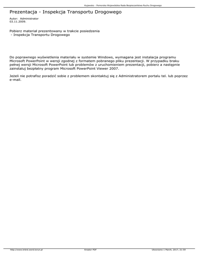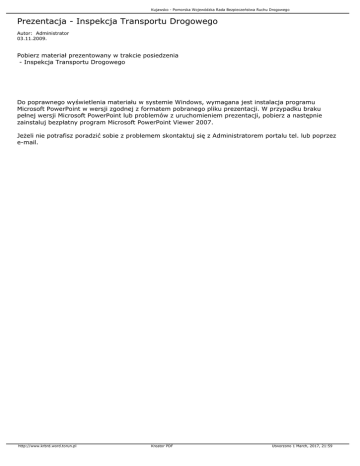 Kujawsko - Pomorska Wojewódzka Rada Bezpieczeństwa Ruchu Drogowego Prezentacja - Inspekcja Transportu Drogowego Autor: Administrator 03.11.2009. Pobierz materiał prezentowany w trakcie posiedzenia - Inspekcja Transportu Drogowego Do poprawnego wyświetlenia materiału w systemie Windows, wymagana jest instalacja programu Microsoft PowerPoint w wersji zgodnej z formatem pobranego pliku prezentacji. W przypadku braku pełnej wersji Microsoft PowerPoint lub problemów z uruchomieniem prezentacji, pobierz a następnie zainstaluj bezpłatny program Microsoft PowerPoint Viewer 2007. Jeżeli nie potrafisz poradzić sobie z problemem skontaktuj się z Administratorem portalu tel. lub poprzez e-mail. http://www.krbrd.word.torun.pl Kreator PDF Utworzono 1 March, 2017, 21:59