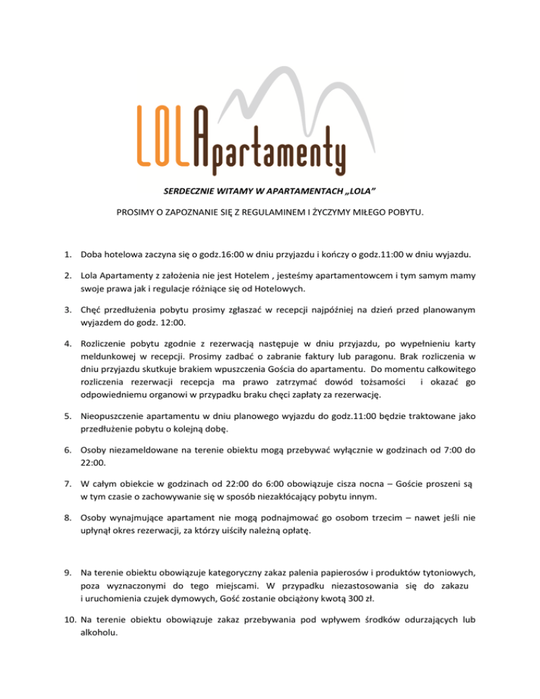 SERDECZNIE WITAMY W APARTAMENTACH „LOLA” PROSIMY O ZAPOZNANIE SIĘ Z REGULAMINEM I ŻYCZYMY MIŁEGO POBYTU. 1. Doba hotelowa zaczyna się o godz.16:00 w dniu przyjazdu i kończy o godz.11:00 w dniu wyjazdu. 2. Lola Apartamenty z założenia nie jest Hotelem , jesteśmy apartamentowcem i tym samym mamy swoje prawa jak i regulacje różniące się od Hotelowych. 3. Chęć przedłużenia pobytu prosimy zgłaszać w recepcji najpóźniej na dzień przed planowanym wyjazdem do godz. 12:00. 4. Rozliczenie pobytu zgodnie z rezerwacją następuje w dniu przyjazdu, po wypełnieniu karty meldunkowej w recepcji. Prosimy zadbać o zabranie faktury lub paragonu. Brak rozliczenia w dniu przyjazdu skutkuje brakiem wpuszczenia Gościa do apartamentu. Do momentu całkowitego rozliczenia rezerwacji recepcja ma prawo zatrzymać dowód tożsamości i okazać go odpowiedniemu organowi w przypadku braku chęci zapłaty za rezerwację. 5. Nieopuszczenie apartamentu w dniu planowego wyjazdu do godz.11:00 będzie traktowane jako przedłużenie pobytu o kolejną dobę. 6. Osoby niezameldowane na terenie obiektu mogą przebywać wyłącznie w godzinach od 7:00 do 22:00. 7. W całym obiekcie w godzinach od 22:00 do 6:00 obowiązuje cisza nocna – Goście proszeni są w tym czasie o zachowywanie się w sposób niezakłócający pobytu innym. 8. Osoby wynajmujące apartament nie mogą podnajmować go osobom trzecim – nawet jeśli nie upłynął okres rezerwacji, za którzy uiściły należną opłatę. 9. Na terenie obiektu obowiązuje kategoryczny zakaz palenia papierosów i produktów tytoniowych, poza wyznaczonymi do tego miejscami. W przypadku niezastosowania się do zakazu i uruchomienia czujek dymowych, Gość zostanie obciążony kwotą 300 zł. 10. Na terenie obiektu obowiązuje zakaz przebywania pod wpływem środków odurzających lub alkoholu. 11. Na czas wynajmu apartamentu Gościom zostaje wydawana karta-klucz do wejścia i poruszania się po obiekcie. Za zgubienie lub uszkodzenie karty pobierana jest opłata w wysokości 20 zł/szt. 12. Korzystanie w czasie pobytu z garażu podziemnego jest dodatkowo płatne : lato : 30 zł/dobę; opłata za parking zewnętrzny wynosi 20 zł/dobę, zima parking zewnętrzny 25 zł/ doba, garaż podziemny 35 zł/ doba. 13. Dodatkowo pobieramy opłatę miejscową w wysokości 2,20 zł/dobę zameldowaniu powyżej dwóch dni) za osobę (przy 14. Obsługa obiektu nie ponosi odpowiedzialności za uszkodzenia lub utratę pojazdów należących do Gości. 15. Goście Apartamentów Lola wynajmują apartamenty i tylko za to jesteśmy w stanie odpowiadać i gwarantować pobyt w ramach wynajmu apartamentów. Wszelkie wydarzenia które nie dzieją się wewnątrz obiektu nie są przez nas gwarantowane i nie mamy na nie wpływu. Wszelkie nagłe zmiany pogody, wypadki i inne zdarzenia losowe – nie dotyczą one wynajmu i w żaden sposób nie można wynajmu z nimi wiązać i rościć z tego tytułu praw do zwrotów kosztów itp. 16. Chęć skorzystania z sauny należy każdorazowo zgłosić w recepcji. Koszt jednorazowego skorzystania z sauny wynosi 25 zł, bez względu na ilość osób. 17. Na terenie obiektu obowiązuje zakaz przebywania zwierząt (np. psów, kotów i innych). 18. O wszelkich zauważonych usterkach lub brakach w wyposażeniu, Gość zobowiązany jest powiadomić recepcję w dniu przyjazdu. 19. W naszym obiekcie wyposażenie jest „takie jakie jest”, nie ma możliwości żądania zmiany wyposażenia na inne gdyż nie mamy innego na stanie, aneksy kuchenne zostały tak skonstruowane aby zapewnić przygotowanie posiłków; Całe wyposażenie spełnia normy dla apartamentów i nie ma możliwości ich zmiany poprzez dołożenie innego wyposażenia. 20. Papier toaletowy jak i ręczniki papierowe do kuchni są na każdy wjazd Gości uzupełniane, w przypadku braku lub skończenia się prosimy o zwrócenie się do Recepcji. 21. Goście po pobycie zobowiązują się do pozostawienia apartamentu w należytym porządku, wyrzucenia śmieci do kubłów znajdujących się przy wjeździe do garażu. Goście zobowiązują się do pozmywania naczyń po sobie i na prośbę obsługi oddanie apartamentu w stanie jakim go zastali. (brak wyrzucenia śmieci, pozmywania naczyń może skutkować doliczeniem opłaty w kwocie 50 zł do pobytu, faktura może być wysłana na adres Gościa z wezwaniem do zapłaty) 22. Gość korzystający z apartamentów ponosi odpowiedzialność materialną za brak, uszkodzenie lub zniszczenie przedmiotów, wyposażenia i urządzeń będących na wyposażeniu, powstałych z jego winy lub z winy osób go odwiedzających. 23. Przed opuszczeniem apartamentu prosimy o sprawdzenie i zamknięcie drzwi i okien. 24. Przed opuszczeniem apartamentu pracownik obsługi ma prawo do sprawdzenia stanu technicznego apartamentu - wszelkie usterki zauważone w tym czasie, a niezgłoszone recepcji, w dniu wyjazdu obciążą rachunek Gościa zdającego apartament, dodatkowo zniszczona pościel i ręczniki zauważone nawet po opuszczeniu apartamentu przez Gości obciążają bezpośrednio Gości hotelowych i będzie to zgłaszane na Policję jako zniszczenie mienia. 25. W dniu przyjazdu Gości istnieje możliwość pobrania kaucji zwrotnej w wysokości 100 zł , celem zabezpieczenia ewentualnych zniszczeń czy nieprzestrzegania postanowień tego regulaminu. Kaucja jest zwracana momencie odebrania apartamentu przez pracownika recepcji jeśli nie stwierdzi żadnych zniszczeń –(patrz cennik uszkodzeń) 26. W czasie pobytu możliwe jest zamówienie dodatkowego sprzątania, wymiany ręczników (odpłatność wg. cennika dostępnego w recepcji). 27. Zamówienie rezerwacji zgodnie z mailem lub dokonaniem rezerwacji online -wiąże się z wpłatą zadatku lub całości za pobyt. Nie ma możliwości wycofania zadatku lub całości wpłaty w przypadku nagłych zmian w planach Gości. Apartamenty mogą przychylić się w uzasadnionych sytuacjach do zmiany rezerwacji lub jej przesu