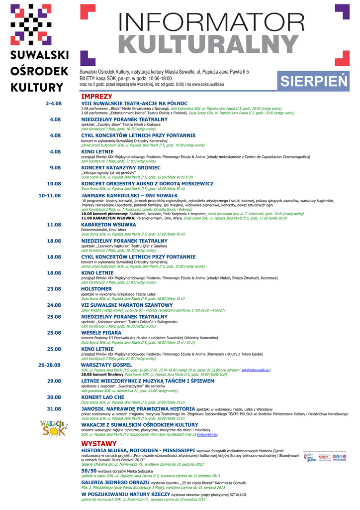INFORMATOR KULTURALNY Suwalski Ośrodek Kultury, instytucja kultury Miasta Suwałki, ul. Papieża Jana Pawła II 5 BILETY: kasa SOK, pn.-pt. w godz. 10:00-18:00 oraz na 3 godz. przed imprezą (nie wcześniej, niż od godz. 8:00) i na www.soksuwalki.eu SIERPIEŃ IMPREZY 2-4.08 VIII SUWALSKIE TEATR-AKCJE NA PÓŁNOC 2.08 performens ,,Black’’ Mette Edvardsena z Norwegii, Sala Kameralna SOK, ul. Papieża Jana Pawła II 5, godz. 20.00 (wstęp wolny) 3.08 performens ,,Entertainment Island’’ Teatru Oblivia z Finlandii, Duża Scena SOK, ul. Papieża Jana Pawła II 5, godz. 19.00 (wstęp wolny) 4.08 NIEDZIELNY PORANEK TEATRALNY spektakl ,,Country show’’ Teatru Nikoli z Krakowa park Konstytucji 3 Maja, godz. 10.30 (wstęp wolny) 4.08 CYKL KONCERTÓW LETNICH PRZY FONTANNIE koncert w wykonaniu Suwalskiej Orkiestry Kameralnej plener przed budynkiem SOK, ul. Papieża Jana Pawła II 5, godz. 19.00 (wstęp wolny) 4.08 KINO LETNIE przegląd filmów XIX Międzynarodowego Festiwalu Filmowego Etiuda & Anima (etiudy meksykańskie z Centro de Capacitacion Cinematografica) park Konstytucji 3 Maja, godz. 21.00 (wstęp wolny) 9.08 KONCERT KATARZYNY GRONIEC ,,Wiszące ogrody już się przeżyły’’ Duża Scena SOK, ul. Papieża Jana Pawła II 5, godz. 19.00 (bilety 40 zł/30 zł) 10.08 KONCERT ORKIESTRY AUKSO Z DOROTĄ MIŚKIEWICZ Duża Scena SOK, ul. Papieża Jana Pawła II 5, godz. 18.00 (bilety 30 zł) 10-11.08 JARMARK KAMEDULSKI – DNI SUWAŁK W programie: barwny korowód, jarmark produktów regionalnych, rękodzieła artystycznego i sztuki ludowej, pokazy ginących zawodów, warsztaty kuglarskie, imprezy rekreacyjne i sportowe, poranek familijny, gry miejskie, widowiska plenerowe, koncerty, pokaz sztucznych ogni park Konstytucji 3 Maja, ul. T. Kościuszki, obiekty Ośrodka Sportu i Rekreacji 10.08 koncert plenerowy: Skaldowie, Avocado, Piotr Karpienia z zespołem, scena plenerowa przy ul. T. Kościuszki, godz. 18.00 (wstęp wolny) 11.08 KABARETON WSUWKA: Paranienormalni, Dno, Afera, Duża Scena SOk, ul. Papieża Jana Pawła II 5, godz. 17.00 (bilety 90 zł) 11.08 KABARETON WSUWKA Paranienormalni, Dno, Afera Duża Scena SOK, ul. Papieża Jana Pawła II 5, godz. 17.00 (bilety 90 zł) 18.08 NIEDZIELNY PORANEK TEATRALNY spektakl ,,Czerwony kapturek’’ Teatru Qfer z Gdańska park Konstytucji 3 Maja, godz. 10.30 (wstęp wolny) 18.08 CYKL KONCERTÓW LETNICH PRZY FONTANNIE koncert w wykonaniu Suwalskiej Orkiestry Kameralnej plener przed budynkiem SOK, ul. Papieża Jana Pawła II 5, godz. 19.00 (wstęp wolny) 18.08 KINO LETNIE przegląd filmów XIX Międzynarodowego Festiwalu Filmowego Etiuda & Anima (etiudy: Muka!, Święto Zmarłych, Rozmowa) park Konstytucji 3 Maja, godz. 21.00 (wstęp wolny) 23.08 HOLSTOMER spektakl w wykonaniu Brzeskiego Teatru Lalek Duża Scena SOK, ul. Papieża Jana Pawła II 5, godz. 18.00 (bilety 15 zł) 24.08 VII SUWALSKI MARATON SZANTOWY 25.08 NIEDZIELNY PORANEK TEATRALNY zalew Arkadia (wstęp wolny), 12.00-16.00 – imprezy rekreacyjno-sportowe, 17.00-21.00 – koncerty spektakl ,,Kolorowe wiersze’’ Teatru CoNieCo z Białegostoku park Konstytucji 3 Maja, godz. 10.30 (wstęp wolny) 25.08 WESELE FIGARA koncert finałowy III Festiwalu Ars Musica z udziałem Suwalskiej Orkiestry Kameralnej Duża Scena SOK, ul. Papieża Jana Pawła II 5, godz. 18.00 (bilety 15 zł / 10 zł) 25.08 KINO LETNIE przegląd filmów XIX Międzynarodowego Festiwalu Filmowego Etiuda & Anima (Parwaneh / etiudy z Tokyo Geidai) park Konstytucji 3 Maja, godz. 21.00 (wstęp wolny) 26-28.08 WARSZTATY GOSPEL SOK, ul. Papieża Jana Pawła II 5, godz. 10.00-13.00, 15.00-18.00 (wstęp 20 zł, zapisy do 25.08 pod adresem: [email protected]) 28.08 koncert finałowy Duża Scena SOK, ul. Papieża Jana Pawła II 5, godz. 19.00 (bilety 10zł) 29.08 LETNIE WIECZORYNKI Z MUZYKĄ TAŃCEM I ŚPIEWEM spotkanie z zespołem ,,Suwalszczyzna’’ dla seniorów sala granatowa SOK, ul. Noniewicza 71, godz. 19.00 (wstęp wolny) 30.08 KONERT LAO CHE Duża Scena SOK, ul. Papieża Jana Pawła II 5, godz. 20.00 (bilety 35 zł) 31.08 JANOSIK. NAPRAWDĘ PRAWDZIWA HISTORIA spektakl w wykonaniu Teatru Lalka z Warszawy pokaz realizowany w ramach programu Instytutu Teatralnego im. Zbigniewa Raszewskiego TEATR POLSKA ze środków Ministerstwa Kultury i Dziedzictwa Narodowego Duża Scena SOK, ul. Papieża Jana Pawła II 5, godz. 18.00 (bilety 23 zł) WAKACJE Z SUWALSKIM OŚRODKIEM KULTURY otwarte wakacyjne zajęcia taneczne, plastyczne, muzyczne dla dzieci i młodzieży SOK, ul. Papieża Jana Pawła II 5 (szczegółowe informacje na plakatach oraz na soksuwalki.eu) WYSTAWY HISTORIA BLUESA, NOTODDEN - MISSISSIPPI wystawa fotografii wielkoformatowych Mortena Gjerde realizowana w ramach projektu „Promowanie różnorodności artystycznej i kulturowej krajów Europy północno-wschodniej i Skandynawii w ramach Suwałki Blues Festival’ 2013” Galeria Chłodna 20, ul. Noniewicza 71, wystawa czynna do 31 sierpnia 2013 50/50 wystawa obrazów Marka Sobczaka galeria w patio SOK, ul. Papieża Jana Pawła II 5, wystawa czynna do 31 sierpnia 2013 GALERIA JEDNEGO OBRAZU wystawa rysunku ,,35 lat cięcia bluesa’’ Kazimierza Gomułki Plac J. Piłsudskiego (przy Parku Konstytucji 3 Maja), wystawa czynna do 31 sierpnia 2013 W POSZUKIWANIU NATURY RZECZY wystawa obrazów grupy plastycznej SZTALUGI galeria Na marmurach SOK, ul. Noniewicza 71, wystawa czynna do 10 września 2013