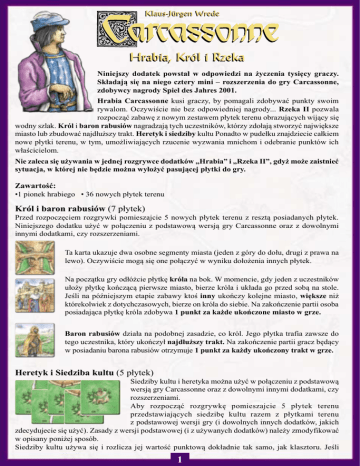 Klaus-Jürgen Wrede Hrabia, Król i Rzeka Niniejszy dodatek powstał w odpowiedzi na życzenia tysięcy graczy. Składają się na niego cztery mini – rozszerzenia do gry Carcassonne, zdobywcy nagrody Spiel des Jahres 2001. Hrabia Carcassonne kusi graczy, by pomagali zdobywać punkty swoim rywalom. Oczywiście nie bez odpowiedniej nagrody... Rzeka II pozwala rozpocząć zabawę z nowym zestawem płytek terenu obrazujących wijący się wodny szlak. Król i baron rabusiów nagradzają tych uczestników, którzy zdołają stworzyć największe miasto lub zbudować najdłuższy trakt. Heretyk i siedziby kultu Ponadto w pudełku znajdziecie całkiem nowe płytki terenu, w tym, umożliwiających rzucenie wyzwania mnichom i odebranie punktów ich właścicielom. Nie zaleca się używania w jednej rozgrywce dodatków „Hrabia” i „Rzeka II”, gdyż może zaistnieć sytuacja, w której nie będzie można wyłożyć pasującej płytki do gry. Zawartość: •1 pionek hrabiego • 36 nowych płytek terenu Król i baron rabusiów (7 płytek) Przed rozpoczęciem rozgrywki pomieszajcie 5 nowych płytek terenu z resztą posiadanych płytek. Niniejszego dodatku użyć w połączeniu z podstawową wersją gry Carcassonne oraz z dowolnymi innymi dodatkami, czy rozszerzeniami. Ta karta ukazuje dwa osobne segmenty miasta (jeden z góry do dołu, drugi z prawa na lewo). Oczywiście mogą się one połączyć w wyniku dołożenia innych płytek. Na początku gry odłóżcie płytkę króla na bok. W momencie, gdy jeden z uczestników ułoży płytkę kończącą pierwsze miasto, bierze króla i układa go przed sobą na stole. Jeśli na późniejszym etapie zabawy ktoś inny ukończy kolejne miasto, większe niż którekolwiek z dotychczasowych, bierze on króla do siebie. Na zakończenie partii osoba posiadająca płytkę króla zdobywa 1 punkt za każde ukończone miasto w grze. Baron rabusiów działa na podobnej zasadzie, co król. Jego płytka trafia zawsze do tego uczestnika, który ukończył najdłuższy trakt. Na zakończenie partii gracz będący w posiadaniu barona rabusiów otrzymuje 1 punkt za każdy ukończony trakt w grze. Heretyk i Siedziba kultu (5 płytek) Siedziby kultu i heretyka można użyć w połączeniu z podstawową wersją gry Carcassonne oraz z dowolnymi innymi dodatkami, czy rozszerzeniami. Aby rozpocząć rozgrywkę pomieszajcie 5 płytek terenu przedstawiających siedzibę kultu razem z płytkami terenu z podstawowej wersji gry (i dowolnych innych dodatków, jakich zdecydujecie się użyć). Zasady z wersji podstawowej (i z używanych dodatków) należy zmodyfikować w opisany poniżej sposób. Siedziby kultu używa się i rozlicza jej wartość punktową dokładnie tak samo, jak klasztoru. Jeśli 1 gracz postawi pionek swojego podwładnego bezpośrednio na siedzibie kultu, ten pionek staje się heretykiem. Układanie siedziby kultu: Gdy gracz układa siedzibę kultu w bezpośrednim sąsiedztwie (poziomo, pionowo lub na ukos) klasztoru zajmowanego przez mnicha innego uczestnika i stawia na niej heretyka, heretyk musi się zmierzyć z mnichem. Podobnie dzieje się, gdy gracz układa klasztor z mnichem bezpośrednio obok (poziomo, pionowo lub na ukos) siedziby kultu z heretykiem innego gracza – mnich musi wyzwać heretyka. Gracz nie może ułożyć siedziby kultu obok kilku klasztorów. Nie można także ułożyć klasztoru obok kilku siedzib kultu. Wyzwanie Po rzuceniu wyzwania ten z dwóch rywali (właścicieli mnicha i heretyka uczestniczących w wyzwaniu), który jako pierwszy ukończy siedzibę kultu lub klasztor, zdobywa jak zwykle 9 punktów. Przeciwnik nie zyskuje niczego. Oba pionki wracają do właścicieli. Jeśli wyzwanie nie zostanie rozstrzygnięte do końca gry, obaj uczestnicy otrzymują standardową liczbę punktów zgodnie z opisem w podstawowych zasadach, dotyczących liczenia punktów za klasztory na końcu gry. Kiedy gracz układa płytkę z siedzibą kultu, nie musi stawiać swojego pionka na samej siedzibie. Może go ustawić na polu, mieście lub trakcie – o ile znajdują się na płytce. Może również całkowicie zrezygnować z ustawienia pionka. Hrabia Carcassonne (12płytek) 1 4 2 3 Przed rozpoczęciem gry należy umieścić 12 płytek miasta Carcassonne obok siebie na środku stołu, tak, jak to przedstawiono na ilustracji. Miasto staje się miejscem, od którego zaczyna się grę. Standardową płytkę startową należy usunąć – nie będzie potrzebna. Drewniany pionek hrabiego Carcassonne należy ustawić w dzielnicy pałacowej, a potem przygotować i rozpocząć zabawę w normalny sposób. Gdy gracz umieści na stole płytkę tak, że przyniesie ona co najmniej 1 punkt jednemu z przeciwników, 2 a jemu samemu żadnych punktów, na zakończenie swojej tury może ustawić jednego swojego podwładnego na wybranej dzielnicy miasta. Ten ruch jest dodatkowy w stosunku do ustawienia pionka według standardowych reguł gry. Należy pamiętać, że graczowi wolno umieścić w Carcassonne tylko jeden dodatkowy pionek za każdą ułożoną płytkę bez względu na to, ile szans na zdobycie punktów stworzyło ułożenie płytki. Na późniejszym etapie gry, kiedy obliczane są punkty za miasto, trakt, klasztor lub gospodarstwo, wszyscy uczestnicy dysponujący podwładnymi z odpowiedniej dzielnicy Carcassonne (patrz niżej) mogą przestawić ich pionki na punktowany fragment planszy przed ustaleniem przewagi na tym fragmencie (przed sprawdzeniem, kto posiada więcej pionków i komu należą się punkty). Obecność hrabiego w dzielnicy miasta uniemożliwia przestawienie znajdujących się w niej pionków. Podwładnych przestawia się w następujący sposób: • z pałacu na punktowane miasto • z kuźni na punktowany trakt • z katedry na punktowany klasztor • z targu na punktowane gospodarstwo W jaki sposób przestawia się pionki podwładnych z Carcassonne? Zaczynając od osoby po lewej od tej, która ułożyła płytkę (a zarazem spowod