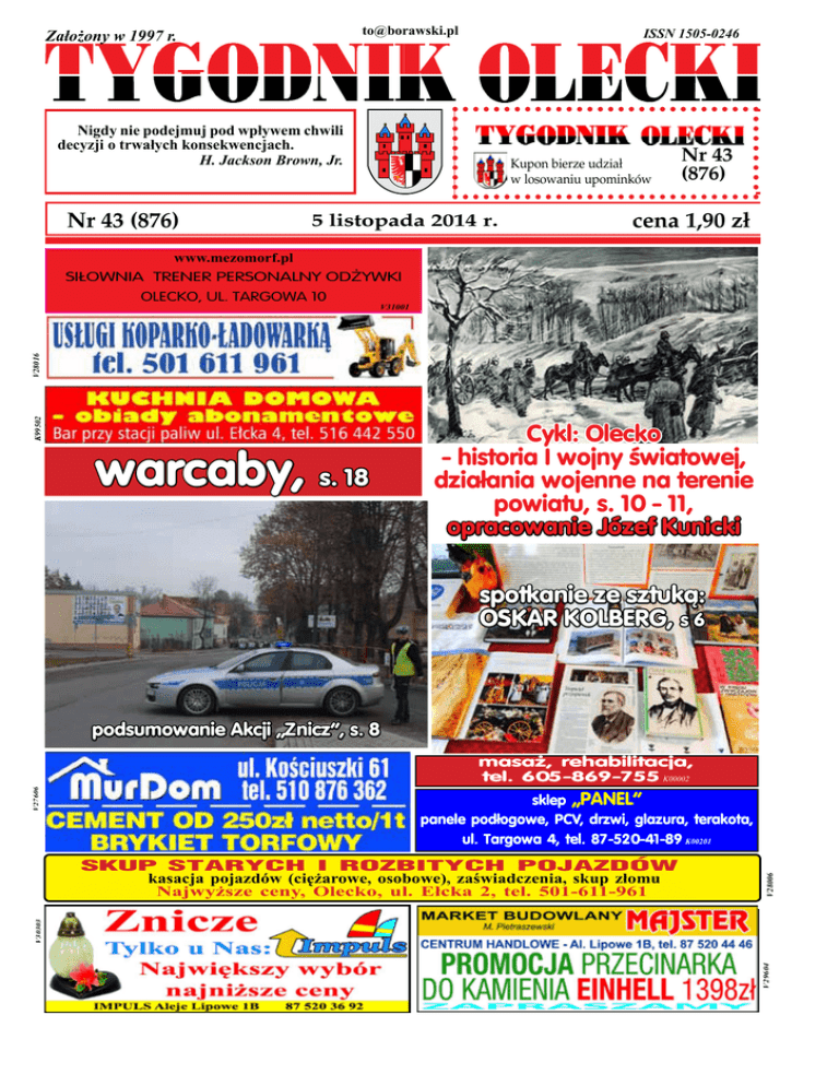 [email protected] Założony w 1997 r. ISSN 1505-0246 Nigdy nie podejmuj pod wpływem chwili decyzji o trwałych konsekwencjach. H. Jackson Brown, Jr. Nr 43 (876) Kupon bierze udział w losowaniu upominków 5 listopada 2014 r. Nr 43 (876) cena 1,90 zł www.mezomorf.pl SIŁOWNIA TRENER PERSONALNY ODŻYWKI OLECKO, UL. TARGOWA 10 K99502 V28016 V31001 warcaby, s. 18 Cykl: Olecko - historia I wojny światowej, działania wojenne na terenie powiatu, s. 10 - 11, opracowanie Józef Kunicki spotkanie ze sztuką: OSKAR KOLBERG, s 6 podsumowanie Akcji „Znicz”, s. 8 sklep „PANEL” panele podłogowe, PCV, drzwi, glazura, terakota, ul. Targowa 4, tel. 87-520-41-89 K00201 V29604 V30303 SKUP STARYCH I ROZBITYCH POJAZDÓW kasacja pojazdów (ciężarowe, osobowe), zaświadczenia, skup złomu Najwyższe ceny, Olecko, ul. Ełcka 2, tel. 501-611-961 V28006 V27606 masaż, rehabilitacja, tel. 605-869-755 K00002 [email protected] Maria Wanda Dzienisiewicz Urodziłam się w Olecku i z tym miastem – sercem, troską i doświadczeniem - związane jest całe moje życie. Kandyduję do Rady Miejskiej w Olecku, w okręgu 8. Nie jestem osobą nową w samorządzie, byłam wicestarostą powiatu oleckiego (2006-2010) i radną powiatową. Obecnie pracuję na stanowisku kierowniczki w Środowiskowym Domu Samopomocy we Wronkach. Jestem absolwentką studiów pedagogicznych oraz podyplomowych studiów menedżerskich. Dodatkowo ukończyłam wiele kursów i szkoleń niezbędnych w pracy samorządowej. Pełnię funkcję prezeski Lokalnej Organizacji Turystycznej Ziemi Oleckiej oraz Stowarzyszenia Kulturalnego „Przypisani Północy”. Za działania społeczne zyskałam spore uznanie, szczególnie cenię wyróżnienia: Srebrny Krzyż za Zasługi dla Związku Harcerstwa Polskiego (2005 r.), Mazurską Niezapominajkę za działania na rzecz ochrony drzew, między innymi kasztanowców w powiecie oleckim (2009 r.), a także odznaczenie Prezydenta Rzeczypospolitej Polskiej (2013 r.) - Srebrny Krzyż za działalność na rzecz rozwoju turystyki. Jestem także członkinią Rady Kongresu Kobiet. W swoich działaniach i planach koncentruję się na rozwoju przedsiębiorczości i oświaty. Jestem osobą otwartą na innych, skuteczną w działaniach i pracowitą. Dziękuje za każdy głos oddany na moją kandydaturę! TWOJA RADNA! RADA MIEJSKA W OLECKU - OKRĘG NR 8 Ulice 1 Maja, Cisowa, Grunwaldzka, Jagiellońska, Młynowa, Partyzantów, Stroma, Wąska, Zamkowa, Plac Zamkowy, Aleje Lipowe Warmińsko - Mazurski Oddział NFZ na terenie powiatu realizuje Populacyjny Program Profilaktyki Raka Szyjki Macicy. Obejmuje on badaniem cytologicznym kobiety w wieku od 25 do 59 lat, z możliwością jego powtarzania co 3 lata. Zapraszamy mieszkanki naszego powiatu do zgłaszania się na badanie profilaktyczne w ramach tego programu do Poradni Ginekologiczno – Położniczej w szpitalu w Olecku. Zainteresowane proszone są o wcześniejszą rejestrację. Cytologia może uratować życie! Proces nowotworowy postępuje powoli, zatem regularne badanie daje szansę na wykrycie raka we wczesnym stadium rozwoju, kiedy jeszcze można całkowicie wyleczyć pacjentkę! Pacjentka, która wykona cytologię bierze udział w losowaniu nagród. Każdego miesiąca nagrodzonych zostaje 5, otrzymują one zestawy kosmetyków oraz zaproszenie rodzinne na pływalnię LEGA w Olecku. Sponsorzy nagród w 2014 r.: Więcej informacji o profilaktyce raka szyjki macicy na stronie www.zdrowie.powiat.olecko.pl H. Kasicka www.powiat.olecko.pl sponsorzy akcji: Ziaja, Oceanic, Soraya, Lega Hasło promujące wolontariat na Warmii i Mazurach Regionalne Centrum Wolontariatu w Elblągu zaprasza do udziału w konkursie na hasło promujące wolontariat na Warmii i Mazurach. Hasło powinno oddawać specyfikę oraz uwzględniać walory społeczne i obywatelskie wolontariatu. Będzie ono używane przez mieszkańców Warmii i Mazur w celach promocyjnych i popularyzatorskich publikacjach promujących, stronach internetowych, telebimach, podczas festynów, itp. Konkurs trwa do 17 listopada 2014 r. i jest skierowany do mieszkańców, instytucji i organizacji pozarządowych z obszaru Warmii i Mazur. Kapituła konkursu złożona z 5 osób nagrodzi 3 najbardziej kreatywne hasła promujące wolontariat. Na najciekawsze hasła czekają nagrody, tj. za zajęcie: • I miejsca – 500,- zł w formie bonu towarowego; • II miejsca – 300,- zł w formie bonu towarowego; • III miejsca – 200,- zł w formie bonu towarowego. Regulamin z kartą zgłoszeniową w załączeniu. Zachęcam do wzięcia udziału w konkursie. informacja: Anna Turowska www.powiat.olecko.pl V24710 Proszę o Twój głos w wyborach 16 listopada Miejsce Twego głosowania: Regionalny Ośrodek Kultury w Olecku, plac Wolności 22 Badanie profilaktyczne może uratować życie! V29304 K98705 sfinansowano za środków KWW Dobro Wspólne Otwartość Aktywność Współpraca Archiwum „Tygodnika oleckiego” znajdziesz GRÜNLAND Centrum Roślin Ozdobnych najnowsza kolekcja bylin Olecko, ul. Produkcyjna 11, tel. (87) 523-90-09 V27706 2 Tygodnik olecki 43/876 - r. 2014 na stronie internetowej www.olecko.info (w pliku *.pdf) KRONIKA PO¯ARNICZA 19 października od 14.35 jeden zastęp JRG PSP i jeden OSP Kowale Oleckie otwierały zamknięte drzwi mieszkania, w którym zasłabła kobieta. informacji udzielił aspirant sztabowy Mariusz Domin 21 października od 9.44 dwa zastępy JRG PSP usuwają drzewo pochylone nad jezdnią alei Wojska Polskiego. 21 października od 14.14 jeden zastęp JRG PSP gasi przy ulicy 11 Listopada pożar śmieci w śmietniku kontenerowym. 22 października od 9.37 dwa zastępy JRG PSP usuwają drzewo pochylone nad jezdnią ulicy Moniuszki. 23 października od 10.09 jeden OSP Świętajno usuwa zapach dymu z łazienki szkolnej. 25 października od 7.58 jeden JRG PSP i jeden OSP Świętajno gaszą pożar sadzy w kominie budynku mieszkalnego w Wężewie. 26 października od 2.10 jeden JRG PSP i jeden OSP Wieliczki usu