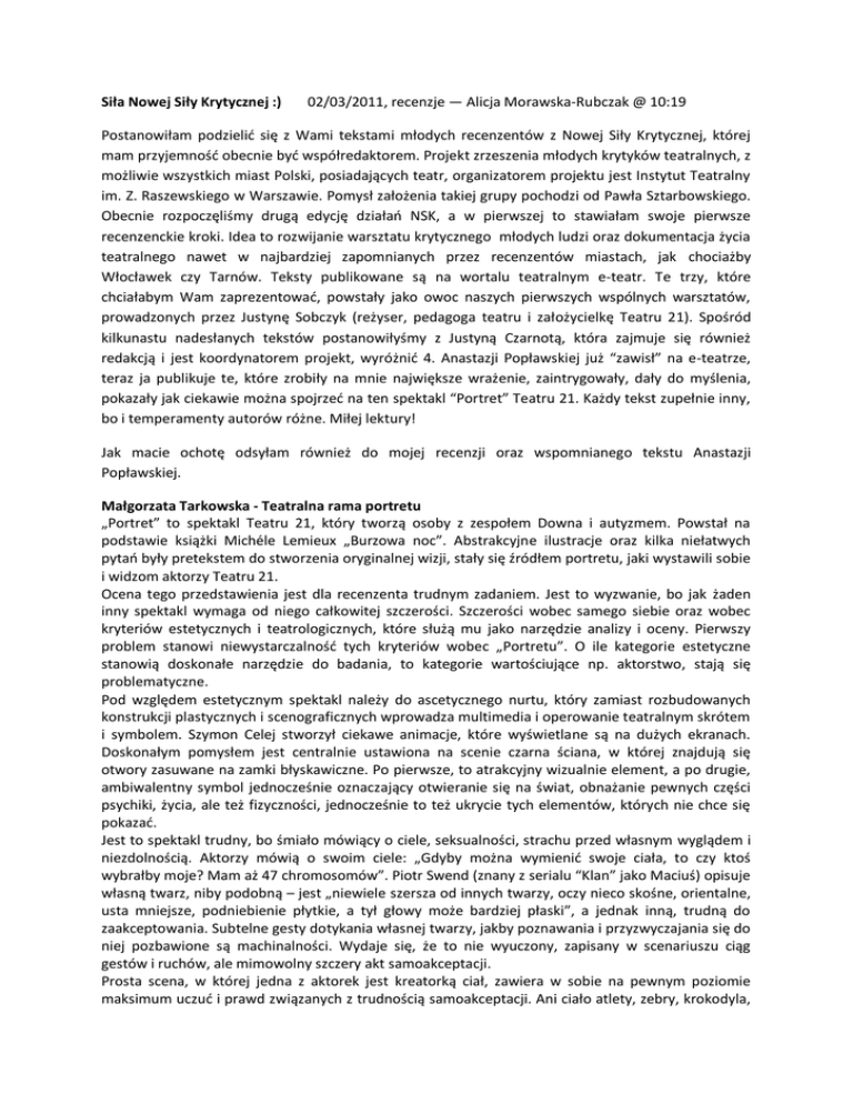 Siła Nowej Siły Krytycznej :) 02/03/2011, recenzje — Alicja Morawska-Rubczak @ 10:19 Postanowiłam podzielić się z Wami tekstami młodych recenzentów z Nowej Siły Krytycznej, której mam przyjemność obecnie być współredaktorem. Projekt zrzeszenia młodych krytyków teatralnych, z możliwie wszystkich miast Polski, posiadających teatr, organizatorem projektu jest Instytut Teatralny im. Z. Raszewskiego w Warszawie. Pomysł założenia takiej grupy pochodzi od Pawła Sztarbowskiego. Obecnie rozpoczęliśmy drugą edycję działań NSK, a w pierwszej to stawiałam swoje pierwsze recenzenckie kroki. Idea to rozwijanie warsztatu krytycznego młodych ludzi oraz dokumentacja życia teatralnego nawet w najbardziej zapomnianych przez recenzentów miastach, jak chociażby Włocławek czy Tarnów. Teksty publikowane są na wortalu teatralnym e-teatr. Te trzy, które chciałabym Wam zaprezentować, powstały jako owoc naszych pierwszych wspólnych warsztatów, prowadzonych przez Justynę Sobczyk (reżyser, pedagoga teatru i założycielkę Teatru 21). Spośród kilkunastu nadesłanych tekstów postanowiłyśmy z Justyną Czarnotą, która zajmuje się również redakcją i jest koordynatorem projekt, wyróżnić 4. Anastazji Popławskiej już “zawisł” na e-teatrze, teraz ja publikuje te, które zrobiły na mnie największe wrażenie, zaintrygowały, dały do myślenia, pokazały jak ciekawie można spojrzeć na ten spektakl “Portret” Teatru 21. Każdy tekst zupełnie inny, bo i temperamenty autorów różne. Miłej lektury! Jak macie ochotę odsyłam również do mojej recenzji oraz wspomnianego tekstu Anastazji Popławskiej. Małgorzata Tarkowska - Teatralna rama portretu „Portret” to spektakl Teatru 21, który tworzą osoby z zespołem Downa i autyzmem. Powstał na podstawie książki Michéle Lemieux „Burzowa noc”. Abstrakcyjne ilustracje oraz kilka niełatwych pytań były pretekstem do stworzenia oryginalnej wizji, stały się źródłem portretu, jaki wystawili sobie i widzom aktorzy Teatru 21. Ocena tego przedstawienia jest dla recenzenta trudnym zadaniem. Jest to wyzwanie, bo jak żaden inny spektakl wymaga od niego całkowitej szczerości. Szczerości wobec samego siebie oraz wobec kryteriów estetycznych i teatrologicznych, które służą mu jako narzędzie analizy i oceny. Pierwszy problem stanowi niewystarczalność tych kryteriów wobec „Portretu”. O ile kategorie estetyczne stanowią doskonałe narzędzie do badania, to kategorie wartościujące np. aktorstwo, stają się problematyczne. Pod względem estetycznym spektakl należy do ascetycznego nurtu, który zamiast rozbudowanych konstrukcji plastycznych i scenograficznych wprowadza multimedia i operowanie teatralnym skrótem i symbolem. Szymon Celej stworzył ciekawe animacje, które wyświetlane są na dużych ekranach. Doskonałym pomysłem jest centralnie ustawiona na scenie czarna ściana, w której znajdują się otwory zasuwane na zamki błyskawiczne. Po pierwsze, to atrakcyjny wizualnie element, a po drugie, ambiwalentny symbol jednocześnie oznaczający otwieranie się na świat, obnażanie pewnych części psychiki, życia, ale też fizyczności, jednocześnie to też ukrycie tych elementów, których nie chce się pokazać. Jest to spektakl trudny, bo śmiało mówiący o ciele, seksualności, strachu przed własnym wyglądem i niezdolnością. Aktorzy mówią o swoim ciele: „Gdyby można wymienić swoje ciała, to czy ktoś wybrałby moje? Mam aż 47 chromosomów”. Piotr Swend (znany z serialu “Klan” jako Maciuś) opisuje własną twarz, niby podobną – jest „niewiele szersza od innych twarzy, oczy nieco skośne, orientalne, usta mniejsze, podniebienie płytkie, a tył głowy może bardziej płaski”, a jednak inną, trudną do zaakceptowania. Subtelne gesty dotykania własnej twarzy, jakby poznawania i przyzwyczajania się do niej pozbawione są machinalności. Wydaje się, że to nie wyuczony, zapisany w scenariuszu ciąg gestów i ruchów, ale mimowolny szczery akt samoakceptacji. Prosta scena, w której jedna z aktorek jest kreatorką ciał, zawiera w sobie na pewnym poziomie maksimum uczuć i prawd związanych z trudnością samoakceptacji. Ani ciało atlety, zebry, krokodyla, pięknej kobiety nie jest właściwe, bo jest obce. Pozostaje zaakceptowanie własnej fizyczności, zakończone ironicznym, gorzkim i nie pozbawionym melancholii i smutku pytaniem: Czy ktoś chciałyby moje ciało? Doskonałym pomysłem reżyserki spektaklu – Justyny Sobczyk, okazało się przeniesienie obrazów z książki na znaki sceniczne. Spirale, które były częścią jednej z ilustracji zostały odwzorowane na scenie dosłownie oraz metaforycznie. Każdy z aktorów kręci własną spiralą, która jest ciekawa wizualnie, ale oddaje również stan zagubienia, błądzenia w labiryncie pytań i odpowiedzi: „Co znajduje się w głowie? Jaki portret siebie noszę? Jaki portret mojej osoby tworzą inni? „ „Chcę wejść do środka mojej głowy!!!”- to jedno ze zdań z książki. Staje się ono pretekstem do dosłownego poszukiwania myśli, pomysłów, gestów, grzechów, snów i marzeń, które kryją się we wnętrzu. Śledząc zachowania aktorów, ich gesty wskazujące drogę do własnego umysłu, odniosłam wrażenie, że czasami również porządkujemy swoje myśli niczym w szufladach czy na półkach. Może ta metafora ma więcej wspólnego z naszą psychiką niż mogłoby się wydawać? Bardzo realistycznie i przekonująco brzmią zdania: „Grzechy pochowane w pamięci. Przekleństwa pochowane z tyłu głowy obok planów na przyszłość. Głowa mi puchnie. Potrzebuję pomocy! Potrzebuję pomocy…”. Spektakl wydaje się rzeczywistym portretem, na którym malują się lęki, wspomnienia, fantazje aktorów. Najmocniejszym punktem jest ostania scena. Przyciemnione światło, punktowy reflektor i monologi aktorów. Każdy przemawia własnym głosem, zmaga się ze wstydem i ograni
