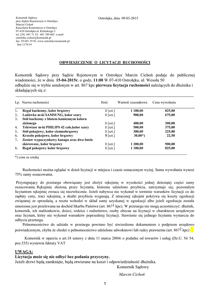 Komornik Sądowy przy Sądzie Rejonowym w Ostrołęce Marcin Cichoń Kancelaria Komornicza w Ostrołęce 07-410 Ostrołęka ul. Kilińskiego 5 tel. (29) 691 71 55, 601 789 602 e-mail: [email protected] fax: 29 691 19 92, www.ostroleka-komornik.pl Km 1174/14 Ostrołęka, dnia 09-03-2015 OBWIESZCZENIE O LICYTACJI RUCHOMOŚCI Komornik Sądowy przy Sądzie Rejonowym w Ostrołęce Marcin Cichoń podaje do publicznej wiadomości, że w dniu 15-04-2015r. o godz. 11:00 W 07-410 Ostrołęka, ul. Wesoła 50 odbędzie się w trybie ustalonym w art. 867 kpc pierwsza licytacja ruchomości należących do dłużnika i składających się z: ____________________________________________________________________________________________________ Lp. Nazwa ruchomości Ilość Wartość szacunkowa Cena wywołania _____________________________________________________________________________________________________ 1. Regał kuchenny, kolor brązowy 1 [szt.] 1 100,00 825,00 2. Lodówka m-ki SAMSUNG, kolor szary 1 [szt.] 900,00 675,00 3. Stół kuchenny z blatem kamiennym koloru zielonego 1 [szt.] 400,00 300,00 4. Telewizor m-ki PHILIPS 42 cale,kolor szary 1 [szt.] 500,00 375,00 5. Stół pokojowy, kolor ciemnobrązowy 1 [szt.] 300,00 225,00 6. Krzesło pokojowe, kolor brązowy 5 [szt.] 30,00*) 22,50 7. Zestaw wypoczynkowy kanapa oraz dwa fotele skórowane, kolor brązowy 1 [szt.] 1 200,00 900,00 8. Regał pokojowy kolor brązowy 1 [szt.] 1 100,00 825,00 _______________________________________________________________________________________________________________________ *) cena za sztukę Ruchomości można oglądać w dzień licytacji w miejscu i czasie oznaczonym wyżej. Suma wywołania wynosi 75% sumy oszacowania. Przystępujący do przetargu obowiązany jest złożyć rękojmię w wysokości jednej dziesiątej części sumy oszacowania. Rękojmię złożoną przez licytanta, któremu udzielono przybicia, zatrzymuje się; pozostałym licytantom rękojmię zwraca się niezwłocznie. Jeżeli nabywca nie wykonał w terminie warunków licytacji co do zapłaty ceny, traci rękojmię, a skutki przybicia wygasają. Z utraconej rękojmi pokrywa się koszty egzekucji związanej ze sprzedażą, a reszta wchodzi w skład sumy uzyskanej w egzekucji albo jeżeli egzekucja została umorzona jest przelewana na dochód Skarbu Państwa (art. 8671 kpc). W przetargu nie mogą uczestniczyć: dłużnik, komornik, ich małżonkowie, dzieci, rodzice i rodzeństwo, osoby obecne na licytacji w charakterze urzędowym oraz licytant, który nie wykonał warunków poprzedniej licytacji. Stawienie się jednego licytanta wystarcza do odbycia przetargu. Pełnomocnictwo do udziału w przetargu powinno być stwierdzone dokumentem z podpisem urzędowo poświadczonym, chyba że chodzi o pełnomocnictwo udzielone adwokatowi lub radcy prawnemu (art. 8672 kpc) Komornik w oparciu o art.18 ustawy z dnia 11 marca 2004r o podatku od towarów i usług (Dz.U. Nr 54, poz.535) wystawia faktury VAT UWAGA: Licytacja może się nie odbyć bez podania przyczyny. Jeżeli drzwi będą zamknięte, będą otwierane na koszt i odpowiedzialność dłużnika. Komornik Sądowy Marcin Cichoń 1 2