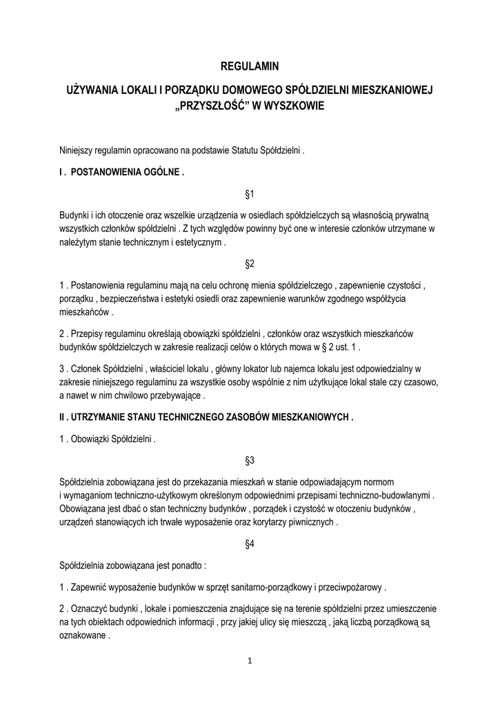 REGULAMIN UŻYWANIA LOKALI I PORZĄDKU DOMOWEGO SPÓŁDZIELNI MIESZKANIOWEJ „PRZYSZŁOŚĆ” W WYSZKOWIE Niniejszy regulamin opracowano na podstawie Statutu Spółdzielni . I . POSTANOWIENIA OGÓLNE . §1 Budynki i ich otoczenie oraz wszelkie urządzenia w osiedlach spółdzielczych są własnością prywatną wszystkich członków spółdzielni . Z tych względów powinny być one w interesie członków utrzymane w należytym stanie technicznym i estetycznym . §2 1 . Postanowienia regulaminu mają na celu ochronę mienia spółdzielczego , zapewnienie czystości , porządku , bezpieczeństwa i estetyki osiedli oraz zapewnienie warunków zgodnego współżycia mieszkańców . 2 . Przepisy regulaminu określają obowiązki spółdzielni , członków oraz wszystkich mieszkańców budynków spółdzielczych w zakresie realizacji celów o których mowa w § 2 ust. 1 . 3 . Członek Spółdzielni , właściciel lokalu , główny lokator lub najemca lokalu jest odpowiedzialny w zakresie niniejszego regulaminu za wszystkie osoby wspólnie z nim użytkujące lokal stale czy czasowo, a nawet w nim chwilowo przebywające . II . UTRZYMANIE STANU TECHNICZNEGO ZASOBÓW MIESZKANIOWYCH . 1 . Obowiązki Spółdzielni . §3 Spółdzielnia zobowiązana jest do przekazania mieszkań w stanie odpowiadającym normom i wymaganiom techniczno-użytkowym określonym odpowiednimi przepisami techniczno-budowlanymi . Obowiązana jest dbać o stan techniczny budynków , porządek i czystość w otoczeniu budynków , urządzeń stanowiących ich trwałe wyposażenie oraz korytarzy piwnicznych . §4 Spółdzielnia zobowiązana jest ponadto : 1 . Zapewnić wyposażenie budynków w sprzęt sanitarno-porządkowy i przeciwpożarowy . 2 . Oznaczyć budynki , lokale i pomieszczenia znajdujące się na terenie spółdzielni przez umieszczenie na tych obiektach odpowiednich informacji , przy jakiej ulicy się mieszczą , jaką liczbą porządkową są oznakowane . 1 3 . Zapewnić należyty stan techniczny ciągów komunikacyjnych , gwarantując mieszkańcom dogodne i bezpieczne przejście . 4 . Zapewnić oświetlenie klatek schodowych , korytarzy , pomieszczeń wspólnego użytku oraz terenów Spółdzielni . §5 Do obowiązków spółdzielni należy również w budynkach z centralnym ogrzewaniem i centralnie dostarczaną ciepłą wodą : 1 . Utrzymanie temperatury w pomieszczeniach mieszkalnych i dodatkowych zgodnie z obowiązującymi w tym zakresie przepisami państwowymi . 2 . Zapewnienie mieszkańcom dostaw ciepłej wody . §6 W przypadku niedogrzania mieszkań lub braku ciepłej wody , Spółdzielnia zobowiązana jest udzielić bonifikaty według zasad j.n.: 1 . Za niedogrzanie mieszkań , jeżeli temperatura w lokalu w okresie grzewczym wynosi : 1) +15°C lub mniej- w wysokości 1/15 części opłaty miesięcznej , 2) poniżej +18°C , ale jest wyższa niż określona pod punktem „1)”- w wysokości 1/30 części opłaty miesięcznej , licząc za każdy dzień niedogrzania mieszkania. III. OBOWIĄZKI UŻYTKOWNIKÓW LOKALI MIESZKALNYCH . §7 1 . Osoba posiadająca tytuł prawny do lokalu może używać lokal wyłącznie na cele mieszkalne . §8 Wszelkie przeróbki w lokalu oraz wykonanie ponadnormatywnego wyposażenia zwiększającego wartość użytkowa mieszkania , mogą być wykonane z zachowaniem następujących warunków : 1 . Uzyskania pisemnej zgody Spółdzielni w przypadku wykonywania następujących robót : 1) naruszających konstrukcję budynku , 2) zmieniających funkcję lokalu , 3) przebudowy balkonów , logi , 4) przeróbek , modernizacji wewnętrznych instalacji : a) centralnego ogrzewania , b) ciepłej wody , c) wodno-kanalizacyjnej , d) gazowej , e) elektrycznej , f) telewizyjnej . 2 5) montażu urządzeń pomiarowych na instalacjach wyszczególnionych pod punktem „4)”, 6) instalowania na budynku anten radiowo-telewizyjnych , telekomunikacyjnych i innych , 7) umieszczania na budynkach i ich otoczeniu szyldów i tablic reklamowych , 8) okratowania okien i balkonów , 9) przegrodzenia lub odgrodzenia korytarzy , 10) wymiany okien , 11) wymiany drzwi wejściowych do lokalu . 2 . Wykonywania zabudowy instalacji i urządzeń / wymienionych w punkcie „4)” / w sposób umożliwiający swobodny dostęp służb konserwatorskich w przypadku usuwania zaistniałych awarii lub ich wymiany . 3 . Wykonania przeróbek i modernizacji na koszt i ryzyko osoby posiadającej tytuł prawny do lokalu – użytkownika lokalu z zachowaniem pełnej odpowiedzialności za ewentualne szkody powstałe w wyniku lub następstwie tych prac . §9 Wszelkie konserwacje finansowo- prawne wynikające z niezachowania się do postanowień określonych w §8 niniejszego regulaminu obciążają osobę posiadająca tytuł prawny do lokalu – użytkownika mieszkania . §10 Koszty usunięcia szkód wyrządzonych w budynku z winy użytkownika lokalu lub jego domowników obciążają osobę posiadająca tytuł prawny do lokalu – użytkownika lokalu . §11 W przypadku zauważenia awarii i uszkodzeń instalacji urządzeń znajdujących się w budynku lub jego otoczeniu użytkownik lokalu – osoba posiadająca tytuł prawny do lokalu , zobowiązana jest do niezwłocznego powiadomienia Spółdzielni lub służb właściwego pogotowia technicznego . §12 1 . Osoba posiadająca tytuł prawny do lokalu – użytkownik lokalu , obowiązany jest do udostępnienia bez zbędnej zwłoki w dniach i godzinach wcześniej z nim uzgodnionych , wejścia do mieszkania pracownikom posiadającym upoważnienie spółdzielni w celu : 1) skontrolowania stanu urządzeń technicznych , ogólnego stanu mieszkania , 2) przeprowadzenia remontów do których zobowiązana jest Spółdzielnia , 3) dokonywania odczytów urządzeń pomiarowych , 4) montażu i wymian urządzeń pomiarowych do rozliczeń indywidualnych , 5) usuwania bieżących awarii lub jej skutków – bez konieczności wcześniejszego uzgodnienia terminu . 3 IV . UTRZYMANIE CZYSTOŚCI , PORZĄDKU