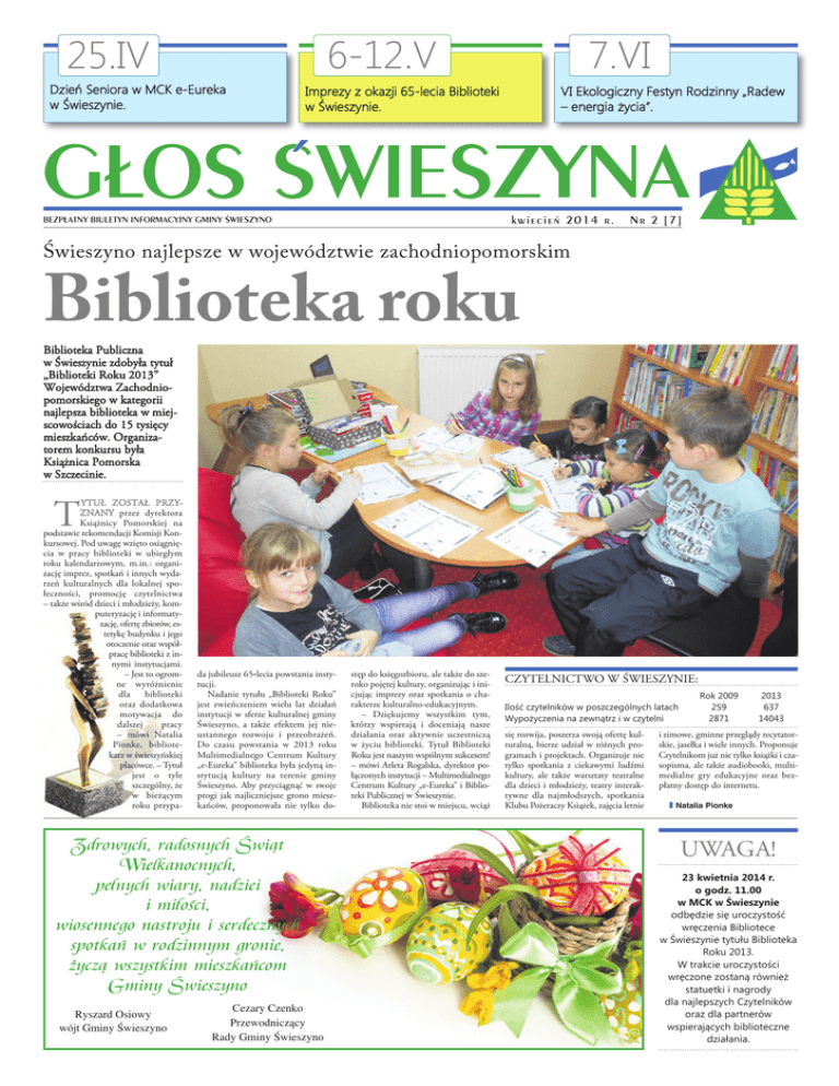' + ! % % ,% "'& $! ! '& ' % ,% "'& ' # ( ! kwiecień 2014 r. BEZPŁATNY BIULETYN INFORMACYJNY GMINY ŚWIESZYNO ' & "#& -& ) ' &* % Nr 2 [7] Świeszyno najlepsze w województwie zachodniopomorskim Biblioteka roku Biblioteka Publiczna w Świeszynie zdobyła tytuł „Biblioteki Roku 2013” Województwa Zachodniopomorskiego w kategorii najlepsza biblioteka w miejscowościach do 15 tysięcy mieszkańców. Organizatorem konkursu była Książnica Pomorska w Szczecinie. Y T U Ł Z O S T A Ł P RZ Y Z NANY przez dyrektora Książnicy Pomorskiej na podstawie rekomendacji Komisji Konkursowej. Pod uwagę wzięto osiągnięcia w pracy biblioteki w ubiegłym roku kalendarzowym, m.in.: organizację imprez, spotkań i innych wydarzeń kulturalnych dla lokalnej społeczności, promocję czytelnictwa – także wśród dzieci i młodzieży, komputeryzację i informatyzację, ofertę zbiorów, estetykę budynku i jego otoczenie oraz współpracę biblioteki z innymi instytucjami. – Jest to ogromne wyróżnienie dla biblioteki oraz dodatkowa motywacja do dalszej pracy – mówi Natalia Pionke, bibliotekarz w świeszyńskiej placówce. – Tytuł jest o tyle szczególny, że w bieżącym roku przypa- T da jubileusz 65 lecia powstania instytucji. Nadanie tytułu „Biblioteki Roku” jest zwieńczeniem wielu lat działań instytucji w sferze kulturalnej gminy Świeszyno, a także efektem jej nieustannego rozwoju i przeobrażeń. Do czasu powstania w 2013 roku Multimedialnego Centrum Kultury „e-Eureka” biblioteka była jedyną instytucją kultury na terenie gminy Świeszyno. Aby przyciągnąć w swoje progi jak najliczniejsze grono mieszkańców, proponowała nie tylko do- Zdrowych, radosnych Świąt Wielkanocnych, pełnych wiary, nadziei i miłości, wiosennego nastroju i serdecznych spotkań w rodzinnym gronie, życzą wszystkim mieszkańcom Gminy Świeszyno Ryszard Osiowy wójt Gminy Świeszyno Cezary Czenko Przewodniczący Rady Gminy Świeszyno stęp do księgozbioru, ale także do szeroko pojętej kultury, organizując i inicjując imprezy oraz spotkania o charakterze kulturalno-edukacyjnym. – Dziękujemy wszystkim tym, którzy wspierają i doceniają nasze działania oraz aktywnie uczestniczą w życiu biblioteki. Tytuł Biblioteki Roku jest naszym wspólnym sukcesem! – mówi Arleta Rogalska, dyrektor połączonych instytucji – Multimedialnego Centrum Kultury „e-Eureka” i Biblioteki Publicznej w Świeszynie. Biblioteka nie stoi w miejscu, wciąż CZYTELNICTWO W ŚWIESZYNIE: ,( %$! $ -$ % &# # % % & $ % # )! % # %$! się rozwija, poszerza swoją ofertę kulturalną, bierze udział w różnych programach i projektach. Organizuje nie tylko spotkania z ciekawymi ludźmi kultury, ale także warsztaty teatralne dla dzieci i młodzieży, teatry interaktywne dla najmłodszych, spotkania Klubu Pożeraczy Książek, zajęcia letnie ! i zimowe, gminne przeglądy recytatorskie, jasełka i wiele innych. Proponuje Czytelnikom już nie tylko książki i czasopisma, ale także audiobooki, multimedialne gry edukacyjne oraz bezpłatny dostęp do internetu. ❚ Natalia Pionke UWAGA! * % #* % # +# %$ *" %$ ! ,( ! !$!"'" ! " ! " %$ ! , #* % % ! ) &# ! !" ! $ %$ %$! &# % ! &# # ) $ ! % % ' 2 Z ŻYCIA GMINY kwiecień 2014 r. Nr 2 [7] www.swieszyno.pl OKIEM GOSPODARZA Krytyka, ale nie krytykanctwo! W LUTYM we wszystkich sołectwach odbyły się zebrania wiejskie. W trakcie spotkań sołtysi (z jednym wyjątkiem) przedstawili sprawozdania z działalności swojej i Rad Sołeckich w 2013 roku. Dzięki pracy tych zespołów, przy zaangażowaniu lokalnych społeczności oraz właściwym wykorzystaniu funduszu sołeckiego, wspartego dodatkowymi pieniędzmi z budżetu gminy, zrealizowano szereg przedsięwzięć poprawiających infrastrukturę i wygląd miejscowości. Wymienię kilka z nich: budowa chodników, przebudowa przystanku, budowa schodów, urządzenie parkingu przy świetlicy, modernizacja kotłowni świetlicy wiejskiej, zakup kosiarek, odbudowa prze- pustu drogowego, wykonanie termomodernizacji i elewacji budynku świetlicy. Ponadto zakupiono materiały konstrukcyjne do zabudowy placu rekreacyjnego. Podczas spotkań zapoznałem mieszkańców z wykonaniem budżetu 2013 roku pod kątem wykorzystania środków finansowych na zadania własne gminy oraz inwestycje wykonane w tym okresie. W minionym roku zrealizowaliśmy na terenie gminy 24 przedsięwzięcia inwestycyjno-remontowe na kwotę 5 278 072,82 zł, jednocześnie udział środków finansowych pozyskanych z różnych źródeł (w tym środków unijnych) to 2 508 091,00 zł. W trakcie spotkań przedstawiłem budżet na bieżący rok, a także rozpoczęte i planowane inwestycje. Mieszkańcy mieli możliwość uczestniczyć w tych spotkaniach i wziąć udział w dyskusji. Ze spotkań tych wynika kilka wniosków. Jednym z nich jest ten, iż uczestnicy akceptują działania Rady Gminy i Wójta w zakresie realizacji zadań ustawowych i procesów inwestycyjnych. Zauważają zmiany na terenie gminy, aprobują i mają przychylny stosunek do nich. Są także mieszkańcy, którzy krytycznie odnoszą się do sposobu zarządzania gminą, do procedur uchwałodawczych, do roli, jaką odgrywa Rada Gminy jako organ stanowiący i Wójt jako organ wykonawczy. W naszej rzeczywistości panuje pogląd – zresztą słuszny – że władza samorządowa pełni służebną rolę wobec mieszkańców. Niektórzy uczestnicy spotkań sądzą, iż potrafią robić to lepiej i skuteczniej. Problem w tym, iż te osoby, udowadniają swoim dotychczasowym zachowaniem, że mając do tego pełne prawo, chociażby poprzez udział w konsultacjach społecznych, nie skorzystali z tej możliwości, m.in. przy tworzeniu strategii rozwoju Gminy Świeszyno. Potrafię zrozumieć wiele rzeczy, gotów jestem przyjąć każdą krytykę, jednak nie przyjmuję do wiadomości i nie akceptuję zachowań irracjonalnych, agresywnych, powodowanych prywatną wendettą i własną frustracją na forum publiczny