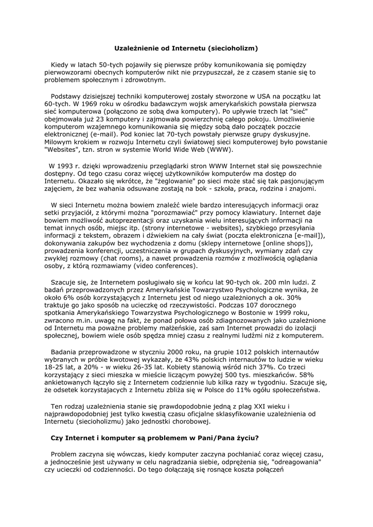 Uzależnienie od Internetu (siecioholizm) Kiedy w latach 50-tych pojawiły się pierwsze próby komunikowania się pomiędzy pierwowzorami obecnych komputerów nikt nie przypuszczał, że z czasem stanie się to problemem społecznym i zdrowotnym. Podstawy dzisiejszej techniki komputerowej zostały stworzone w USA na początku lat 60-tych. W 1969 roku w ośrodku badawczym wojsk amerykańskich powstała pierwsza sieć komputerowa (połączono ze sobą dwa komputery). Po upływie trzech lat "sieć" obejmowała już 23 komputery i zajmowała powierzchnię całego pokoju. Umożliwienie komputerom wzajemnego komunikowania się między sobą dało początek poczcie elektronicznej (e-mail). Pod koniec lat 70-tych powstały pierwsze grupy dyskusyjne. Milowym krokiem w rozwoju Internetu czyli światowej sieci komputerowej było powstanie "Websites", tzn. stron w systemie World Wide Web (WWW). W 1993 r. dzięki wprowadzeniu przeglądarki stron WWW Internet stał się powszechnie dostępny. Od tego czasu coraz więcej użytkowników komputerów ma dostęp do Internetu. Okazało się wkrótce, że "żeglowanie" po sieci może stać się tak pasjonującym zajęciem, że bez wahania odsuwane zostają na bok - szkoła, praca, rodzina i znajomi. W sieci Internetu można bowiem znaleźć wiele bardzo interesujących informacji oraz setki przyjaciół, z którymi można "porozmawiać" przy pomocy klawiatury. Internet daje bowiem możliwość autoprezentacji oraz uzyskania wielu interesujących informacji na temat innych osób, miejsc itp. (strony internetowe - websites), szybkiego przesyłania informacji z tekstem, obrazem i dźwiekiem na cały świat (poczta elektroniczna [e-mail]), dokonywania zakupów bez wychodzenia z domu (sklepy internetowe [online shops]), prowadzenia konferencji, uczestniczenia w grupach dyskusyjnych, wymiany zdań czy zwykłej rozmowy (chat rooms), a nawet prowadzenia rozmów z możliwością oglądania osoby, z którą rozmawiamy (video conferences). Szacuje się, że Internetem posługiwało się w końcu lat 90-tych ok. 200 mln ludzi. Z badań przeprowadzonych przez Amerykańskie Towarzystwo Psychologiczne wynika, że około 6% osób korzystających z Internetu jest od niego uzależnionych a ok. 30% traktuje go jako sposób na ucieczkę od rzeczywistości. Podczas 107 dorocznego spotkania Amerykańskiego Towarzystwa Psychologicznego w Bostonie w 1999 roku, zwracono m.in. uwagę na fakt, że ponad połowa osób zdiagnozowanych jako uzależnione od Internetu ma poważne problemy małżeńskie, zaś sam Internet prowadzi do izolacji społecznej, bowiem wiele osób spędza mniej czasu z realnymi ludźmi niż z komputerem. Badania przeprowadzone w styczniu 2000 roku, na grupie 1012 polskich internautów wybranych w próbie kwotowej wykazały, że 43% polskich internautów to ludzie w wieku 18-25 lat, a 20% - w wieku 26-35 lat. Kobiety stanowią wśród nich 37%. Co trzeci korzystający z sieci mieszka w mieście liczącym powyżej 500 tys. mieszkańców. 58% ankietowanych łączyło się z Internetem codziennie lub kilka razy w tygodniu. Szacuje się, że odsetek korzystajacych z Internetu zbliża się w Polsce do 11% ogółu społeczeństwa. Ten rodzaj uzależnienia stanie się prawdopodobnie jedną z plag XXI wieku i najprawdopodobniej jest tylko kwestią czasu oficjalne sklasyfikowanie uzależnienia od Internetu (siecioholizmu) jako jednostki chorobowej. Czy Internet i komputer są problemem w Pani/Pana życiu? Problem zaczyna się wówczas, kiedy komputer zaczyna pochłaniać coraz więcej czasu, a jednocześnie jest używany w celu nagradzania siebie, odprężenia się, "odreagowania" czy ucieczki od codzienności. Do tego dołączają się rosnące koszta połączeń internetowych oraz związane z nimi kłopoty finansowe a także współistniejące problemy rodzinne, zawodowe i inne. Jeżeli chcielibyśmy spojrzeć na ten problem podobnie jak na inne uzależnienia wówczas do objawów przemawiających za uzależnieniem od komputera należałoby zaliczyć: spędzanie przy komputerze coraz większej ilości czasu kosztem innych dotychczasowych zainteresowań; zaniedbywanie obowiązków rodzinnych czy zwodowych (szkolnych) w związku z komputerem; pojawianie się konfliktów rodzinnych w związku z komputerem; kłamanie odnośnie ilości czasu spędzonego przy komputerze; podejmowanie prób kontrolowania czasu spędzanego przy komputerze; przeznaczanie coraz większej ilości pieniędzy na zakup sprzętu komputerowego, oprogramowania, akcesoriów czy książek i czasopism o tematyce komputerowej; reagowanie rozdrażnieniem czy nawet agresją w sytuacjach, kiedy korzystanie z komputera jest utrudnione bądź niemożliwe. Kimberly Young, psycholog z University of Pittsbourgh (USA) przedstawiła propozycję pytań ułatwiających postawienie diagnozy uzależnienia od Internetu (Internet Addiction Disorder). Zdaniem autorki, udzielenie twierdzącej odpowiedzi na pięć spośród ośmiu pytań przemawia za istnieniem patologicznego uzależnienia od Internetu. Oto pytania: 1. Czy czuje się Pan/i zaabsorbowana/y Internetem do tego stopnia, że ciągle 2. 3. 4. 5. 6. 7. 8. rozmyśla o odbytych sesjach internetowych i/lub nie może doczekać się kolejnych sesji)? Czy odczuwa Pan/i potrzebę zwiększenia ilości czasu spędzanego w Internecie, aby uzyskać większe zadowolenie (mieć więcej satysfakcji)? Czy podejmował/a Pan/i wielokrotnie, nieudane próby kontrolowania, ograniczania lub zaprzestania korzystania z Internetu? Czy odczuwał Pan/i wewnętrzny niepokój, miał/a nastrój depresyjny albo był/a rozdrażniona/y wówczas, kiedy próbował Pan/i ograniczać lub przerwać korzystanie z Internetu? Czy zdarza się Pani/Panu spędzać w Internecie więcej czasu niż pierwotnie było zaplanowane? Czy kiedykolwiek ryzykował/a Pan/i utratą bliskiej osoby, ważnych relacji z innymi ludźmi, pracy, nauki albo kariery zawodowej w związku z ze spędzaniem zbyt dużej ilosci czasu w I