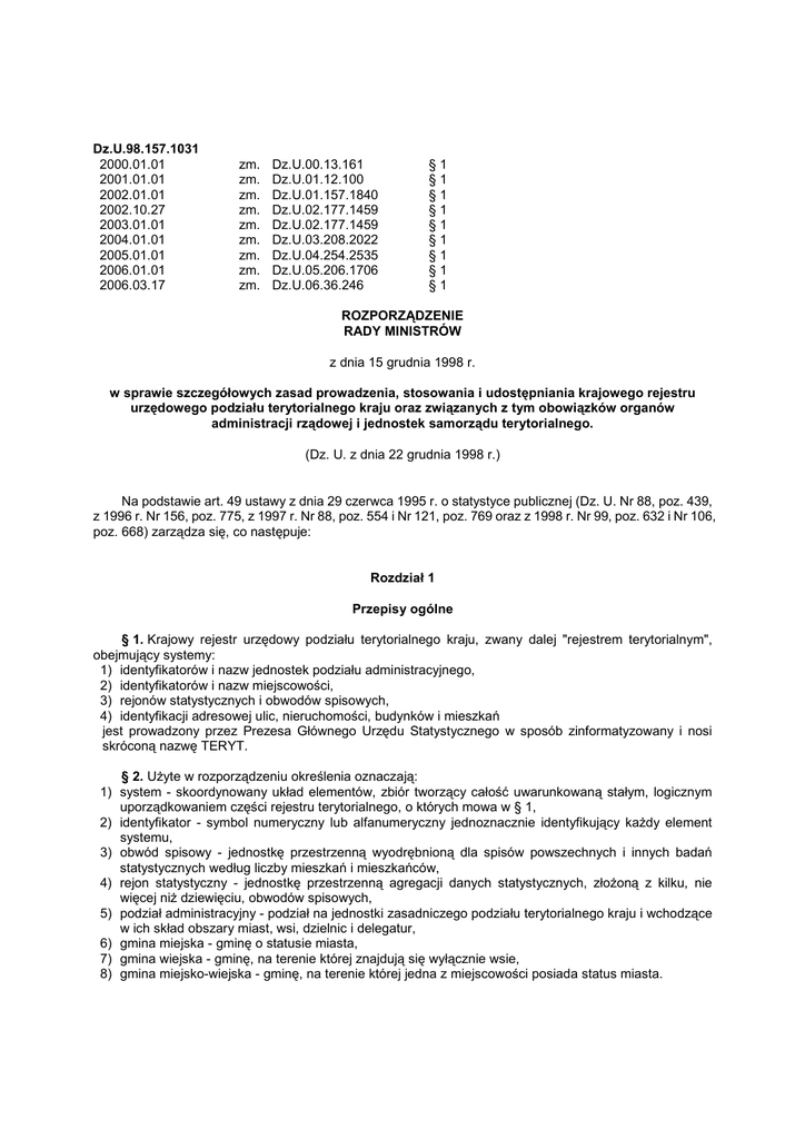 Dz.U.98.157.1031 2000.01.01 2001.01.01 2002.01.01 2002.10.27 2003.01.01 2004.01.01 2005.01.01 2006.01.01 2006.03.17 zm. zm. zm. zm. zm. zm. zm. zm. zm. Dz.U.00.13.161 Dz.U.01.12.100 Dz.U.01.157.1840 Dz.U.02.177.1459 Dz.U.02.177.1459 Dz.U.03.208.2022 Dz.U.04.254.2535 Dz.U.05.206.1706 Dz.U.06.36.246 §1 §1 §1 §1 §1 §1 §1 §1 §1 ROZPORZĄDZENIE RADY MINISTRÓW z dnia 15 grudnia 1998 r. w sprawie szczegółowych zasad prowadzenia, stosowania i udostępniania krajowego rejestru urzędowego podziału terytorialnego kraju oraz związanych z tym obowiązków organów administracji rządowej i jednostek samorządu terytorialnego. (Dz. U. z dnia 22 grudnia 1998 r.) Na podstawie art. 49 ustawy z dnia 29 czerwca 1995 r. o statystyce publicznej (Dz. U. Nr 88, poz. 439, z 1996 r. Nr 156, poz. 775, z 1997 r. Nr 88, poz. 554 i Nr 121, poz. 769 oraz z 1998 r. Nr 99, poz. 632 i Nr 106, poz. 668) zarządza się, co następuje: Rozdział 1 Przepisy ogólne § 1. Krajowy rejestr urzędowy podziału terytorialnego kraju, zwany dalej "rejestrem terytorialnym", obejmujący systemy: 1) identyfikatorów i nazw jednostek podziału administracyjnego, 2) identyfikatorów i nazw miejscowości, 3) rejonów statystycznych i obwodów spisowych, 4) identyfikacji adresowej ulic, nieruchomości, budynków i mieszkań jest prowadzony przez Prezesa Głównego Urzędu Statystycznego w sposób zinformatyzowany i nosi skróconą nazwę TERYT. § 2. UŜyte w rozporządzeniu określenia oznaczają: 1) system - skoordynowany układ elementów, zbiór tworzący całość uwarunkowaną stałym, logicznym uporządkowaniem części rejestru terytorialnego, o których mowa w § 1, 2) identyfikator - symbol numeryczny lub alfanumeryczny jednoznacznie identyfikujący kaŜdy element systemu, 3) obwód spisowy - jednostkę przestrzenną wyodrębnioną dla spisów powszechnych i innych badań statystycznych według liczby mieszkań i mieszkańców, 4) rejon statystyczny - jednostkę przestrzenną agregacji danych statystycznych, złoŜoną z kilku, nie więcej niŜ dziewięciu, obwodów spisowych, 5) podział administracyjny - podział na jednostki zasadniczego podziału terytorialnego kraju i wchodzące w ich skład obszary miast, wsi, dzielnic i delegatur, 6) gmina miejska - gminę o statusie miasta, 7) gmina wiejska - gminę, na terenie której znajdują się wyłącznie wsie, 8) gmina miejsko-wiejska - gminę, na terenie której jedna z miejscowości posiada status miasta. Rozdział 2 Szczegółowe zasady prowadzenia rejestru terytorialnego § 3. 1. System identyfikatorów i nazw jednostek podziału administracyjnego obejmuje kody i nazwy zasadniczego trójstopniowego podziału terytorialnego kraju i jest zbudowany według hierarchicznej numeracji nadanej województwom, powiatom i gminom, z zastrzeŜeniem ust. 2. 2. Odrębne identyfikatory nadawane są miastom na prawach powiatu; w przypadku gmin odrębnymi identyfikatorami wyróŜnia się gminy miejskie, gminy wiejskie, gminy miejsko-wiejskie, a takŜe miasta i obszary wiejskie w gminach miejsko-wiejskich oraz dzielnice i delegatury w gminach miejskich. 3. Identyfikator jednostek podziału terytorialnego jest trzyczłonowy. Poszczególne człony identyfikatora są symbolami numerycznymi i oznaczają: 1) pierwszy człon - dwucyfrowy symbol województwa nadany województwom ułoŜonym w kolejności alfabetycznej z liczb parzystych w przedziale liczb 02-98, 2) drugi człon - dwucyfrowy symbol powiatu nadany powiatom danego województwa ułoŜonym w kolejności alfabetycznej, a następnie miastom na prawach powiatu odpowiednio: a) z liczb 01-60 - symbol powiatu, b) z liczb 61-99 - symbol miasta na prawach powiatu, 3) trzeci człon - trzycyfrowy symbol gminy, w którym: a) dwie pierwsze cyfry stanowią kolejne liczby w przedziale liczb 01-99, nadane gminom (dzielnicom, delegaturom) po ich ułoŜeniu w kolejności alfabetycznej w powiatach, począwszy od gmin miejskich (dzielnic, delegatur w kolejności alfabetycznej po gminie miejskiej, do której naleŜą), po nich w kolejności gminy wiejskie i gminy miejsko-wiejskie, b) trzecia cyfra stanowi symbol rodzaju jednostki i oznacza: 1 - gmina miejska, 2 - gmina wiejska, 3 - gmina miejsko-wiejska, 4 - miasto w gminie miejsko-wiejskiej, 5 - obszar wiejski w gminie miejsko-wiejskiej, (1) 8dzielnice m.st. Warszawy, 9 - delegatury i dzielnice innych gmin miejskich. § 4. 1. Jednostkom zasadniczego trójstopniowego podziału terytorialnego państwa, wprowadzonego ustawą z dnia 24 lipca 1998 r. o wprowadzeniu zasadniczego trójstopniowego podziału terytorialnego państwa (Dz. U. Nr 96, poz. 603 i Nr 104, poz. 656) oraz rozporządzeniem Rady Ministrów z dnia 7 sierpnia 1998 r. w sprawie utworzenia powiatów (Dz. U. Nr 103, poz. 652), z dniem 1 stycznia 1999 r. ustala się identyfikatory określone w załączniku nr 1 do rozporządzenia. 2. System identyfikatorów i nazw jednostek podziału administracyjnego jest aktualizowany po kaŜdej zmianie w podziale terytorialnym według następujących zasad: 1) nowo utworzonym jednostkom podziału terytorialnego nadaje się symbol w kolejności po ostatnim w ramach liczb przewidzianych dla danego szczebla podziału i rodzaju jednostki, 2) identyfikatory jednostek likwidowanych wyłącza się z systemu identyfikatorów i nazw jednostek podziału administracyjnego i nie mogą być one powtórnie uŜyte, 3) zmiana nazwy i granic jednostki podziału terytorialnego nie powoduje zmiany identyfikatora, 4) przeniesienie miasta lub gminy do innego powiatu oraz przeniesienie powiatu lub miasta na prawach powiatu do innego województwa wymaga zmiany identyfikatora, 5) zmiana rodzaju gminy powoduje zmianę identyfikatora w ostatniej cyfrze trzeciego członu. § 5. 1. System identyfikatorów i nazw miejscowości obejmuje: urzędową nazwę miejscowości, identyfikator miejscowości nadany zgodnie z ust. 2, rodzaj miejscowości, województwo, powiat i gminę, na terenie których jest połoŜona miejscowość. 2. I