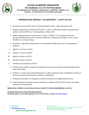 STADO OGIERÓW SIERAKÓW Ul. Stadnina 14, 64-410 Sieraków Przedsiębiorstwo Rolniczo-Hodowlane „GAŁOPOL” Spółka z o.o. Gałowo, ul. Wierzbowa 10, 64-500 Szamotuły PREMIOWANIE ŹREBIĄT –SO SIERAKÓW - 5 LIPCA 2015R. 1. Początek wystawy 05.07.2015r. (niedziela) godz. 10:00 – płyta dziedziniec SO. 2. Stajnie przygotowane od dnia 04.07.2015r. – godz. 17:00 (liczba boksów ograniczona) opłata za boks 20,00zł. za 1 konia (płatne w biurze SO) 3. Opłata organizacyjna za wystawienie 1 konia – 50,00zł. ( w tej opłacie mieści się poczęstunek dla wystawców). Istnieje możliwość zamówienia noclegów w SO w cenie 55,00zł. za 1 osobę/1 dobę/. 4. Oceniane i nagradzane będą konie ras szlachetnych (wlkp, młp, sp.) w następujących grupach: I. Ogierki 1-roczne ur.2014r. II. Klaczki 1 roczne ur.2014r. III. Ogierki 2-letnie ur.2013r. IV. Klaczki 2-letnie ur.2013r. V. Źrebięta przy matkach ur.2015r. 5. Źrebięta przy matkach mogą być pokazywane luzem, przywiązane przy popręgach lub w ręku obok matki. 6. Źrebięta 1-roczne muszą być pokazywane w ręku na kantarze lub z wędzidłem, źrebięta 2letnie muszą być pokazywane w uzdach z wędzidłami. 7. Źrebięta pozostałych ras mogą być oceniane bez prawa do nagród finansowych. 8. Tytuł Czempiona wystawy otrzyma źrebię z roczników 2013 lub 2014, które otrzymało najwyższą ocenę komisji. Zgłoszenia źrebiąt na wystawę prosimy wysyłać do dnia 01.07.2015r. na adres: Związek Hodowców Koni Wielkopolskich: ul. Kłeckoska 14, 62-200 Gniezno, tel. 61 8471452, e-mail: [email protected] tel.: (061) 29 52 511 fax. (61)2952543 mail: [email protected] www.stadoogierow.eu PR-H Gałopol Sp. z o.o. Sąd Rejonowy VIII Wydział Gospodarczy Krajowego Rejestru Sądowego KRS 0000195461, Kapitał zakładowy – 6.246.000,00; NIP: 787-10-08-534, REGON 630352837 Regulamin Premiowania Źrebiąt: 1. Oceny koni dokonuje komisja powołana przez organizatorów w składzie 3-5 osobowym. Po zakończeniu oceny Komisja sporządza protokół i podaje wyniki do publicznej wiadomości. Wyniki oceny są ostateczne, nie przewiduje się odwołań. 2. Konie oceniane są indywidualnie, (można zastosować metodę na początku wstępnej oceny całej grupy wiekowej na kole), a sędziowie stosują skalę ocen od 1 do 10 pkt. za cechy: typ pokrój stęp kłus kondycję ,pielęgnację i prezentację konia – – – – – Skala ocen: 10 pkt. - doskonała 5 pkt. - mierna 9 pkt. - bardzo dobra 4 pkt. - niedostateczna 8 pkt. - dobra 3 pkt. - prawie zła 7 pkt. - zadawalająca 2 pkt. - zła 6 pkt. - dostateczna 1 pkt. - bardzo zła W przypadku źrebiąt pod matkami (rocznik 2015) ocenie podlegają, cztery cechy w skali 20-punktowej: Typ do 5 pkt Pokrój do5 pkt Ruch do 5 pkt Zdrowie i rozwój do 5 pkt W przypadku jednakowej liczby punktów o pierwszym miejscu zdecyduje najwyższa liczba punktów przyznanych za typ. O ile ocena za typ będzie się również pokrywała u wszystkich sędziów, o przyznaniu pierwszego miejsca zdecyduje wyższa ocena za ruch. Jeśli i te oceny będą jednakowe o miejscu decyduje przewodniczący komisji oceny. 3. Do Premiowania kwalifikują się źrebięta z rocznika 2015, 2014 i 2013 mające prawo wpisu do ksiąg hodowlanych (ogierki do Księgi Głównej, klaczki do Księgi Głównej lub Wstępnej). tel.: (061) 29 52 511 fax. (61)2952543 mail: [email protected] www.stadoogierow.eu PR-H Gałopol Sp. z o.o. Sąd Rejonowy VIII Wydział Gospodarczy Krajowego Rejestru Sądowego KRS 0000195461, Kapitał zakładowy – 6.246.000,00; NIP: 787-10-08-534, REGON 630352837