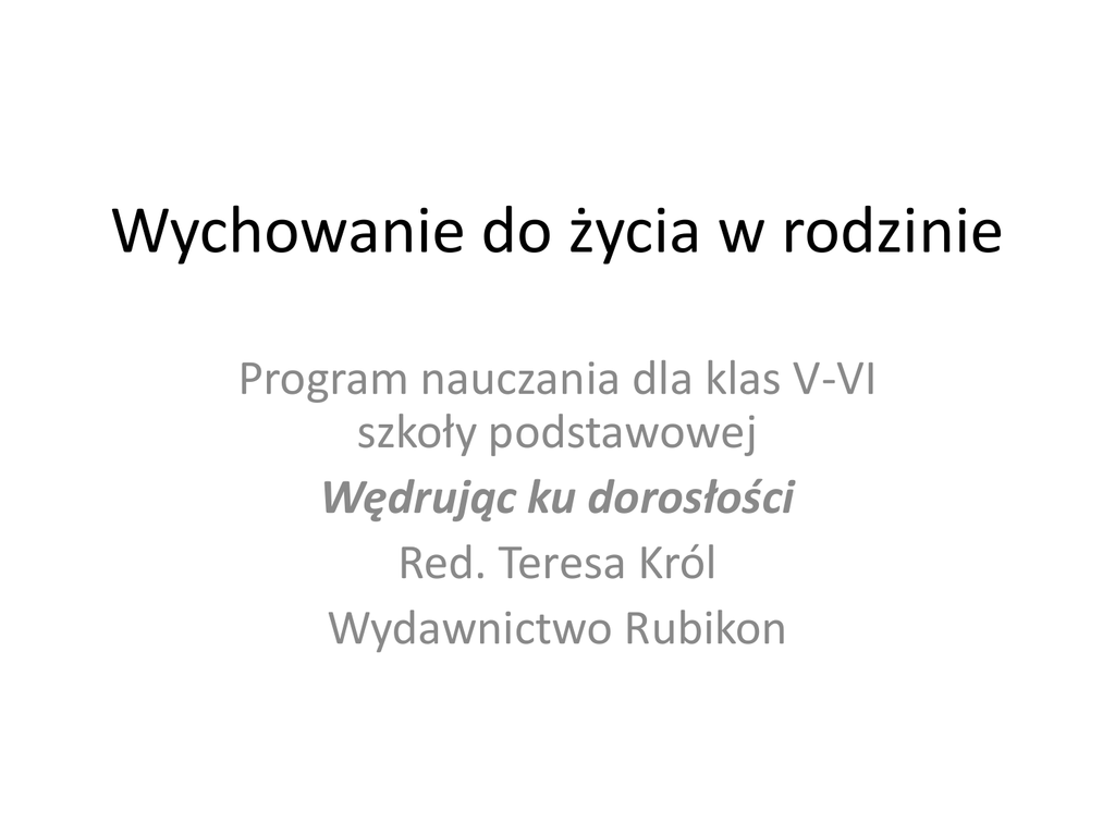 Wychowanie do życia w rodzinie Program nauczania dla klas V-VI szkoły podstawowej Wędrując ku dorosłości Red. Teresa Król Wydawnictwo Rubikon Jak zapisać dziecko? Jeżeli rodzic nie podpisze u wychowawcy klasy rezygnacji z zajęć WDŻR, uczeń automatycznie jest zobowiązany do uczęszczania na lekcje wychowania do życia w rodzinie. Cele „Wychowania do życia w rodzinie” POZNANIE: • Zagadnień związanych z rozwojem fizycznym, psychicznym i społecznym człowieka. • Dróg rozwoju emocjonalnego i uczuciowego. • Funkcji i organizacji życia rodzinnego. Cele „Wychowania do życia w rodzinie” KSZTAŁCENIE: • Refleksyjnego stosunku do siebie. • Przekonania o konieczności kierowania swoim rozwojem. • Wrażliwości na potrzeby innych. • Uwzględniania potrzeb innych ludzi i służenia im. Cele „Wychowania do życia w rodzinie” WYCHOWANIE: • Bogacenie życia wewnętrznego i potrzeb uczuciowych. • Wyzwolenie potrzeb wyższych, jako warunek samorozwoju. Metody i techniki nauczania • Podział na grupy (dziewczęta i chłopcy) po wcześniejszym poinformowaniu uczniów Na lekcji: • Praca w małych grupach (4-6 osób) • Drama- symulacja ról • Technika pracy w parach • Pogadanka- rozmowa nauczyciela z uczniem • Wykład- jednokierunkowy przekaz informacji • Dyskusja- zbiorowe roztrząsanie problemu Metody i techniki nauczania cd. • Metoda „Burzy mózgów”- stosowana do znajdowania rozwiązań • Technika zdań niedokończonych • Metoda sytuacyjna- analiza przypadków • Fotoekspresja • Metoda „Karo” • Metoda „Śniegowej kuli” Tematyka poruszana podczas zajęć: RODZINA 1. Rodzina- to my! 2. Potrzeby bytowe. 3. Wspólnota duch, serca i myśli. 4. Rodzina- Akademią Dobra. 5. Wspólnie tworzymy nasze domy. BYĆ W RODZINIE BYĆ W RODZINIE 1. 2. 3. 4. Czas wolny- wróg czy sprzymierzeniec? Umiejętność świętowania. Trudna sztuka rozmawiania. Jak rozwiązywać konflikty? DOJRZEWANIE DOJRZEWANIE 1. 2. 3. 4. 5. Człowiek- istota płciowa. U progu dorosłości. Okres wielkiego niepokoju. Gra hormonów. Mydło, szczotka i twoje zdrowie. O SZTUCE WYBIERANIA O SZTUCE WYBIERANIA 1. 2. 3. 4. Wśród koleżanek i kolegów. Mieć przyjaciela w szkolnej ławie… Czasopisma. Forsa… forsa…. INTYMNOŚĆ INTYMNOŚĆ 1. 2. 3. 4. Sfery bliskości. Pojęcie intymności. Szacunek dla ciała. Obrona własnej intymności. PRZEKAZYWANIE ŻYCIA PRZEKAZYWANIE ŻYCIA 1. 2. 3. 4. 5. 6. Macierzyństwo i ojcostwo. Układ rozrodczy człowieka. Funkcjonowanie układu płciowego. O co pytacie? Rozwój dziecka w łonie matki. Przyjęcie dziecka do rodziny. DZIĘKUJĘ