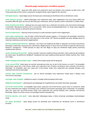 Słownik pojęć związanych z handlem opcjami At-the money (ATM) – opcja jest ATM, kiedy cena wykonania opcji oraz bieżąca cena rynkowa są takie same. Jeśli Twoja opcja była at-the-money a wykonanie nastąpiło dzisiaj, opcja wygaśnie bez wartości. Call (opcja kupna) – opcja dająca prawo do kupna pary walutowej po określonej cenie w określonym czasie. Chain (łańcuch opcyjny) – tabela pokazująca ceny wykonania opcji, daty wygaśnięcia oraz ceny kupna (ASK) oraz sprzedaży (BID) dla opcji call oraz put dla danej pary walutowej. Łańcuch opcyjny możesz wyświetlać w Tablicy Opcji. Delta (współczynnik Delta) - pokazuje jak cena opcji zmieni się w zależności od zmiany ceny instrumentu bazowego o jednostkę. Najczęściej wyrażona jest w procentach. Delta ocenia prawdopodobieństwo, że Twoja opcja wygaśnie in-the-money, bazując na aktualnej sytuacji rynkowej. Exercise (wykonanie) – operacja otwarcia pozycji na rynku bazowym (spot) w dniu wygaśnięcia. Expiry (data wygaśnięcia) – jest do data w której kontrakt opcyjny wygasa, a Ty kupujesz lub sprzedajesz określoną parę walutową po określonej cenie, jeśli opcja jest in-the-money. GFT oferuje europejski typ opcji, dlatego opcja nie może być wykonana przed swoim wygaśnięciem. Gamma (współczynnik Gamma) - pokazuje, o ile zmieni się współczynnik Delta w zależności od zmiany instrumentu bazowego o jednostkę. Zazwyczaj przy zajmowaniu długiej pozycji na opcji call oraz krótkiej na opcji put Gamma jest dodatnia. Analogicznie – krótka pozycja na opcji call oraz długa na opcji put skutkować będą ujemną wartością współczynnika Gamma. Greeks (współczynniki greckie) - zestaw narzędzi nazywany współczynnikami greckimi, które pokazują jak kształtuje się ryzyko opcji. Na platformie DealBook® dostępnych jest pięć współczynników greckich (Delta, Gamma, Rho, Theta oraz Vega). Holder (kupujący lub posiadacz opcji) – osoba, która kupuje opcję call lub opcję put. In-the-money (ITM) - kiedy opcja ma wartość wewnętrzną mówi się, że jest in-the-money („w cenie”). W przypadku opcji kupna, opcja jest in-the-money, kiedy cena wykonania jest mniejsza od bieżącej ceny rynkowej instrumentu bazowego. W przypadku opcji put, opcja jest in-the-money, kiedy cena wykonania jest powyżej bieżącej ceny rynkowej instrumentu bazowego. Intrinsic value (wartość wewnętrzna) - jest to różnica pomiędzy ceną wykonania Twojej opcji a bieżącą ceną instrumentu bazowego. Leg (noga, etap strategii) – pojedyncza opcja w strategii wykorzystującej wiele opcji. Obligation (obowiązek) – zobowiązanie sprzedającego do respektowania warunków kontraktu opcyjnego. Out-of-the-money (OTM) - w przypadku opcji kupna, opcja jest out-of-the-money („poza ceną”) w momencie, kiedy jej cena wykonania jest większa od bieżącej ceny rynkowej instrumentu bazowego (pary walutowej). W przypadku opcji put, opcja jest out-of-the-money, kiedy cena wykonania jest poniżej bieżącej ceny rynkowej instrumentu bazowego. Opcje out-of-the-money nie posiadają wartości wewnętrznej. Premium (premia, cena opcji) – cena, jaką płaci nabywający opcję, a którą otrzymuje sprzedający (wystawiający) opcję. Put (opcja sprzedaży) – opcja dająca prawo do sprzedaży pary walutowej po określonej cenie w określonym terminie. EFIX DM | OPCJE FOREX NA PLATFORMIE DEALBOOK®360 Rho (współczynnik Rho) - pokazuje, jak zmieni się wartość opcji, w zależności od zmiany stopy procentowej. Risk reversal (korytarz, odwrócenie ryzyka) – strategia ta służy najczęściej do ochrony długiej lub krótkiej pozycji zajętej na parze walutowej, jednakże może być również wykorzystywana do spekulacji odnośnie kształtowania się zmienności rynkowej. Strategia ta polega na sprzedaży (kupnie) opcji kupna (call), która jest out-of-the-money oraz kupnie (sprzedaży) opcji sprzedaży (put) również out-of-the-money na tej samej parze walutowej. Opcje te mają taką samą wartość współczynnika Delta oraz taki sam termin wygaśnięcia. Podczas, gdy nie ma ograniczeń co do możliwego do uzyskania zysku, możliwa do poniesienia strata jest również nieograniczona. Straddle (stelaż) – strategia opcyjna, w której jednocześnie otwierasz pozycję na opcji kupna oraz sprzedaży na tej samej parze walutowej. Jeśli kupujesz obie opcje mówi się o kupnie stelaża, a kiedy sprzedajesz obie opcje mówi się o wystawieniu stelaża. Obie opcje muszą mieć takie same ceny wykonania oraz daty wygaśnięcia. Strangle (pętla) – strategia ta jest podobna do strategii stelaża: otwierasz jednocześnie (kupujesz lub sprzedajesz) opcję call oraz put na tej samej parze walutowej z tą samą datą wygaśnięcia. Różnica polega na tym, że w przypadku strategii strangle, cena wykonania opcji put jest niższa niż cena wykonania opcji call. Strike price (cena wykonania) – określona cena, po której zostanie otwarta pozycja na rynku bazowym, w momencie wygaśnięcia opcji in-the-money. Theta (współczynnik Theta) - pokazuje zmianę wartości opcji w zależności od upływu czasu o jednostkę (efekt upływu czasu do terminu wygaśnięcia). Time value (wartość czasowa) - jest zdefiniowana jako różnica między premią opcyjną a wartością wewnętrzną opcji. Time decay (efekt upływu czasu do terminu wygaśnięcia) – zjawisko, które polega na tym, że w miarę zbliżania się życia opcji do jej wygaśnięcia, jej wartość czasowa spada. Underlying (instrument bazowy) – instrument finansowy, na którym bazuje kontrakt opcyjny. W przypadku opcji walutowych, instrumentem bazowym jest para walutowa. Vanilla (opcja waniliowa) – standardowa opcja call lub put. Vega (współczynnik Vega) - mierzy, jak zmienność rynkowa wpływa na premię opcyjną. Vertical (spread pionowy) – strategia polega na otwarciu długiej i krótkiej pozycji na opcjach call lub put na tej samej parze walutowej. Każ