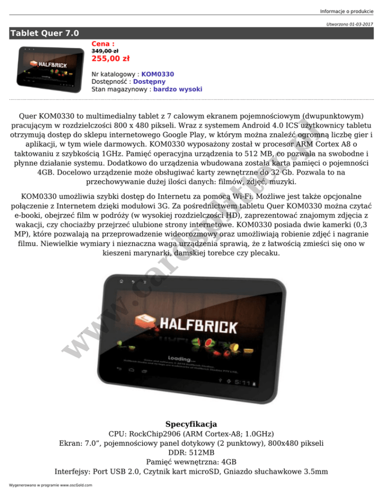 Informacje o produkcie Utworzono 01-03-2017 Tablet Quer 7.0 Cena : 349,00 zł 255,00 zł Nr katalogowy : KOM0330 Dostępność : Dostępny Stan magazynowy : bardzo wysoki sp lit te r .p l Quer KOM0330 to multimedialny tablet z 7 calowym ekranem pojemnościowym (dwupunktowym) pracującym w rozdzielczości 800 x 480 pikseli. Wraz z systemem Android 4.0 ICS użytkownicy tabletu otrzymują dostęp do sklepu internetowego Google Play, w którym można znaleźć ogromną liczbę gier i aplikacji, w tym wiele darmowych. KOM0330 wyposażony został w procesor ARM Cortex A8 o taktowaniu z szybkością 1GHz. Pamięć operacyjna urządzenia to 512 MB, co pozwala na swobodne i płynne działanie systemu. Dodatkowo do urządzenia wbudowana została karta pamięci o pojemności 4GB. Docelowo urządzenie może obsługiwać karty zewnętrzne do 32 Gb. Pozwala to na przechowywanie dużej ilości danych: filmów, zdjęć, muzyki. w w w .c ar d KOM0330 umożliwia szybki dostęp do Internetu za pomocą Wi-Fi. Możliwe jest także opcjonalne połączenie z Internetem dzięki modułowi 3G. Za pośrednictwem tabletu Quer KOM0330 można czytać e-booki, obejrzeć film w podróży (w wysokiej rozdzielczości HD), zaprezentować znajomym zdjęcia z wakacji, czy chociażby przejrzeć ulubione strony internetowe. KOM0330 posiada dwie kamerki (0,3 MP), które pozwalają na przeprowadzenie wideorozmowy oraz umożliwiają robienie zdjęć i nagranie filmu. Niewielkie wymiary i nieznaczna waga urządzenia sprawią, że z łatwością zmieści się ono w kieszeni marynarki, damskiej torebce czy plecaku. Specyfikacja CPU: RockChip2906 (ARM Cortex-A8; 1.0GHz) Ekran: 7.0”, pojemnościowy panel dotykowy (2 punktowy), 800x480 pikseli DDR: 512MB Pamięć wewnętrzna: 4GB Interfejsy: Port USB 2.0, Czytnik kart microSD, Gniazdo słuchawkowe 3.5mm Wygenerowano w programie www.oscGold.com w w w .c Gwarancja 24 miesiące ar d sp lit te r .p l Połączenia: WiFi (802.11 b/g/n) 3G: Możliwość podłączenia USB 3G Dongle Kamera: 0.3MP+0.3MP G sensor: G-SENSOR System operacyjny: Android OS 4.0 lub nowszy Zasilanie: Akumulator litowy 3.7V@2800mAH; Zasilacz AC: 110-240V~50/60Hz, Wyjście DC: 5V/1.5A Audio: MP3 / WMA / APE / FLAC / AAC / OGG / AC3 / WAV Video: MKV / AVI / RM / RMVB / MP4V / VOB / DAT / FLV / 3GP / VP8 / RV / WMV / AVS / H.263 / flash player 10.1