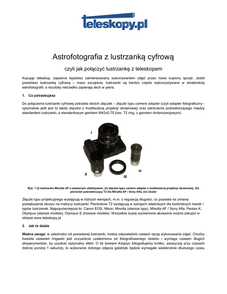 Astrofotografia z lustrzanką cyfrową czyli jak połączyć lustrzankę z teleskopem Kupując teleskop, zapewne będziesz zainteresowany wykonywaniem zdjęć przez nowo kupiony sprzęt. Jeżeli posiadasz lustrzankę cyfrową – masz szczęście, lustrzanki są bardzo często wykorzystywane w amatorskiej astrofotografii, a rezultaty nierzadko zapierają dech w piersi. 1. Co potrzebujesz Do połączenia lustrzanki cyfrowej potrzeba dwóch złączek – złączki typu camera adapter (czyli adapter fotograficzny optymalnie jeśli jest to także złączka z możliwością projekcji okularowej) oraz pierścienia pośredniczącego między standardem lustrzanki, a standardowym gwintem M42x0,75 (tzw. T2 ring, z gwintem drobnozwojowym). Rys. 1 (i) lustrzanka Minolta AF z założonym obiektywem, (ii) złączka typu camera adapter z możliwością projekcji okularowej, (iii) pierścień pośredniczący T2 dla Minolta AF / Sony Alfa, (iv) okular Złączki typu projekcyjnego występują w różnych wersjach, m.in. z regulacją długości, co pozwala na zmianę powiększenia obrazu na matrycy lustrzanki. Pierścienie T2 występują w wersjach właściwych dla konkretnych marek / typów lustrzanek. Najpopularniejsze to: Canon EOS, Nikon, Minolta (starsze typy), Minolta AF / Sony Alfa, Pentax K, Olympus (starsze modele), Olympus E (nowsze modele). Wszystkie wyżej wymienione akcesoria można zakupić w sklepie www.teleskopy.pl 2. Jak to działa Ważna uwaga: w zależności od posiadanej lustrzanki, trzeba odpowiednio ustawić opcję wykonywania zdjęć. Choćby kwestia ustawień migawki jest oczywiście uzależniona od fotografowanego obiektu i wymaga czasem długich eksperymentów, by uzyskać optymalny efekt. O ile bowiem Księżyc fotografujemy krótko, zazwyczaj przy czasach dobrze poniżej 1 sekundy, to wykonanie dobrego zdjęcia galaktyki będzie wymagało wielokrotnie dłuższego czasu ekspozycji i odpowiedniego podążania teleskopem za obrotem sfery niebieskiej. Ponadto istnieją niuanse odnoszące się do konkretnych lustrzanek. Przykładowo lustrzanka Sony Alfa będzie zgłaszać problem braku obiektywu – wtedy należy przejść na tryb manualny, gdy obecność obiektywu nie jest przez elektronikę lustrzanki sprawdzana. Rys. 2 Odkręcamy obiektyw lustrzanki Rys. 3 Wkręcamy pierścień pośredniczący T2 do korpusu lustrzanki Rysunek 2 pokazuje korpus lustrzanki ze zdjętym obiektywem. Ta elementarna czynność zależna jest od modelu lustrzanki – więcej informacji można zaleźć w instrukcji konkretnego modelu aparatu. Na rysunku 3 widać korpus lustrzanki z założonym pierścieniem pośredniczącym T2, właściwym dla danego modelu aparatu. W przypadku aparatu na zdjęciu, odpowiedni jest pierścień do Minolta AF (7000). Rys. 4 Złączka projekcyjna rozkręcona - po prawej 1,25’’ / T2 (stosowana do fotografowania w ognisku), po lewej tuleja projekcyjna Na rysunku 4 pokazana jest typowa złączka projekcyjna. Jak widać, jest ona dwuczęściowa, skręcana. Część lewa to typowy adapter fotograficzny do teleskopów z wyciągiem 1,25 cala. Tuleja dolna ma właśnie tę średnicę – wsuwamy ja zamiast okularu w wyciąg teleskopu i blokujemy śrubą, dokładnie tak, jak ma to miejsce w przypadku okularu przy obserwacjach wizualnych. Na szerszej części adapteru znajduje się gwint T2, czyli M42x0,75. Tę złączkę w połączeniu z pierścieniem pośredniczącym stosujemy wtedy, gdy planujemy wykonywanie zdjęć w ognisku zwierciadła / obiektywu. Fotografia w ognisku odznacza się stosunkowo małym powiększeniem i sporym polem widzenia, uzależnionymi od ogniskowej teleskopu. Tę metodę astrofotograficzną stosujemy, gdy chcemy portretować względnie duże obszary nieba (np. niektóre gromady otwarte, bliskie koniunkcje). Tak przygotowany zestaw - adapter fotograficzny + pierścień + lustrzanka - przedstawia rysunek 5, zaś rysunek 6 przedstawia lustrzankę zamocowaną to wyciągu okularowego teleskopu. Rys. 5 Lustrzanka z wkręconym adapterem fotograficznym przygotowana do fotografowania w ognisku zwierciadła Rys. 6 Lustrzanka zamocowana do wyciągu okularowego w miejscu okularu przygotowana do wykonywania zdjęć w ognisku zwierciadła Złączka projekcyjna pozwala także na wykonywanie zdjęć z aparatem podłączonym za okularem. Zazwyczaj tuleje pozwalają na stosowanie okularów o ogniskowych około 10mm i krótszych. Okular wkładamy do tulei projekcyjnej i blokujemy śrubą - tak jak pokazano na rysunku 7. Tak przygotowaną złączkę z wybranym przez nas okularem łączymy z lustrzanką, jak na rysunku 8 i łączymy z teleskopem jak na rysunku 9. Rys. 7 Złączka projekcyjna z włożonym krótkoogniskowym okularem Projekcja okularowa służy do portretowania obiektów zwartych przy dużych powiększeniach – przede wszystkim Księżyca, planet i jaśniejszych gromad kulistych. Salon Firmowy: Solec 34B, 00-394 Warszawa S Salony firmowe: Warszawa, ul. Solec 34B, Kraków, ul.Siemiradzkiego 17•• e-mail:[email protected] www.teleskopy.pl TEL WAW: 22-374 31 40 TEL KRK: 12 445 63 93 FAX 22 205 04 52 (AUTOMATYCZNY) Rys. 8 Lustrzanka z wkręconym adapterem fotograficznym przygotowana do fotografowania w projekcji okularowej Często zapominanym i niedocenianym sposobem wykonywania zdjęć nieba jest zamocowanie aparatu z obiektywem „na barana” (ang. piggy back) na tubie optycznej teleskopu równolegle do jego osi optycznej. Aparat ustawiamy na opcję B (długoczasowa ekspozycja) i prowadzimy za ruchem obrotowym sfery niebieskiej za pomocą teleskopu z dużym powiększeniem, na bieżąco korygując położenie obiektu śrubami mikroruchów. Ważne, aby wcześniej odpowiednio ustawić montaż paralaktyczny na biegun niebieski, aby wyeliminować tzw. rotację pola. (O ustawieniu montażu paralaktycznego można przeczytać w osobnym opracowaniu na www.teleskopy.pl/porady) Rys. 9 Lustrzanka zamocowana do wyciągu okularowego w miejscu okularu przygotowana do wykonywan