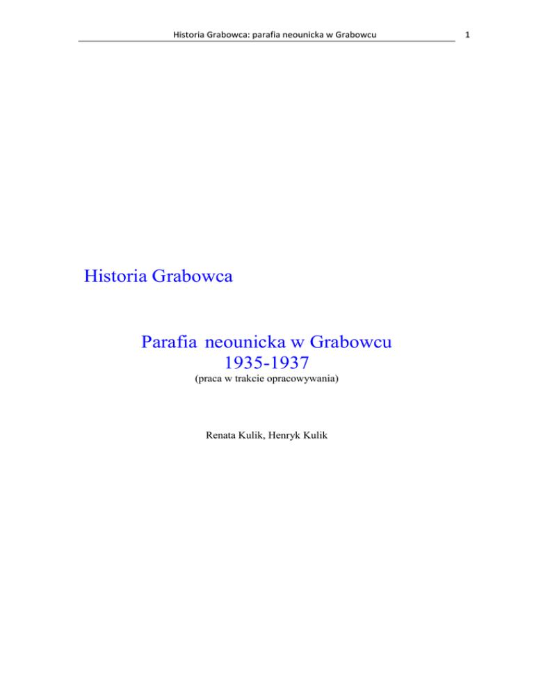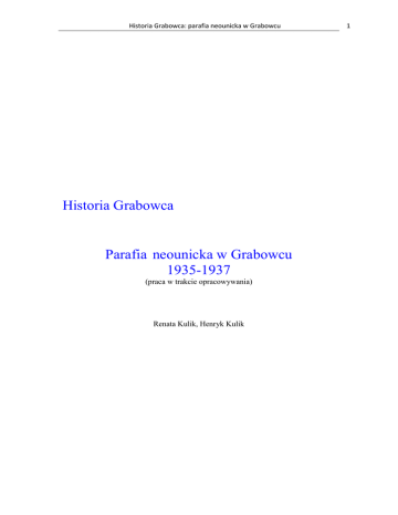 Historia Grabowca: parafia neounicka w Grabowcu Historia Grabowca Parafia neounicka w Grabowcu 1935-1937 (praca w trakcie opracowywania) Renata Kulik, Henryk Kulik 1 2 Historia Grabowca: parafia neounicka w Grabowcu 1. Wstęp 1.1. Krótko w jednym zdaniu Parafia neounicka jest jedną z kilku parafii działających na terenie Grabowca wyróżniającą się od pozostałych bardzo krótkim okresem funkcjonowania. 1.2. Obrządki w ramach Kościoła katolickiego Rozróżniamy obrządki (ryty) w ramach Kościoła katolickiego, którego głową był papież: zachodni – łaciński (Kościół rzymskokatolicki) wschodnie – greckokatolicki (cerkiew greckokatolicka), ormiański, bizantyjsko-słowiański (który pojawił się w latach dwudziestych XX wieku). Obrządek neounicki był traktowany jako nowa unia między Kościołem katolickim a Cerkwią prawosławną1. Obrządek neounicki był skierowany do wyznawców prawosławia zamieszkujących tereny wschodnie Polski2. Parafie neounickie były erygowane w celu pozyskiwania wiernych dla Kościoła łacińskiego3. Parafie powstawały z inicjatywy biskupów łacińskich4. 1.3. Nazewnictwo Obrządek nazywano różnie5: bizantyjsko-słowiański, neounia, grecko-słowiański, wschodnio-słowiański, katolicka cerkiew prawosławna Obrządek neounicki nie miał własnych struktur organizacyjnych6. 9 listopada 1926 roku na zjeździe biskupów diecezji łacińskich z byłego zaboru rosyjskiego ustalono urzędową nazwę dla opisywanego kościoła: Kościół Katolicki Obrządku Wschodniosłowiańskiego7. 1 Wójciuk Michał, „Specyfikacja organizacji i zarys charakteru Cerkwi katolickiej obrządku bizantyjskosłowiańskiego o liturgicznej tradycji synodalnej na wschodnich ziemiach II Rzeczypospolitej w latach 19241939” – Koło Historii, Nr 7, Lublin 2003, s.125. 2 Wójciuk Michał, „Specyfikacja organizacji i zarys charakteru Cerkwi katolickiej obrządku bizantyjskosłowiańskiego o liturgicznej tradycji synodalnej na wschodnich ziemiach II Rzeczypospolitej w latach 19241939” – Koło Historii, Nr 7, Lublin 2003, s.127. 3 Pelica Grzegorz Jacek, „Kościół prawosławny w województwie lubelskim (1918-1939), Lublin, 2007, s. 143. 4 Wójciuk Michał, „Specyfikacja organizacji i zarys charakteru Cerkwi katolickiej obrządku bizantyjskosłowiańskiego o liturgicznej tradycji synodalnej na wschodnich ziemiach II Rzeczypospolitej w latach 19241939” – Koło Historii, Nr 7, Lublin 2003, s.129. 5 Wójciuk Michał, „Specyfikacja organizacji i zarys charakteru Cerkwi katolickiej obrządku bizantyjskosłowiańskiego o liturgicznej tradycji synodalnej na wschodnich ziemiach II Rzeczypospolitej w latach 19241939” – Koło Historii, Nr 7, Lublin 2003, s. 121-124. 6 Wójciuk Michał, „Specyfikacja organizacji i zarys charakteru Cerkwi katolickiej obrządku bizantyjskosłowiańskiego o liturgicznej tradycji synodalnej na wschodnich ziemiach II Rzeczypospolitej w latach 19241939” – Koło Historii, Nr 7, Lublin 2003, s. 124. 7 Wójciuk Michał, „Specyfikacja organizacji i zarys charakteru Cerkwi katolickiej obrządku bizantyjskosłowiańskiego o liturgicznej tradycji synodalnej na wschodnich ziemiach II Rzeczypospolitej w latach 1924- Historia Grabowca: parafia neounicka w Grabowcu 3 2. Historia parafii 2.1. Tworzenie obrządku 4 kwietnia 1924 roku Stolica Apostolska wydała m.in. biskupowi lubelskiemu Marianowi Fulmanowi pełnomocnictwa dotyczące powołania na ziemiach polskich nowego katolickiego obrządku wschodniego8. Do prac misyjnych byli kierowani księża wyświęceni w nowym obrządku oraz zakonnicy. Biskup lubelski sprowadził zakon bazylianów, którzy osiedlili się na ziemi chełmskiej w 1936 roku9. W neounii pozostawiono całą obrzędowość prawosławną. Główną zmianą było wprowadzenie zwierzchności papieża. Do ektenii wprowadzono imię papieża jak i imiona diecezjalnych biskupów łacińskich. Ponadto pozwolono wyznawcom nie uznawać w wyznaniu wiary tego, że Duch Święty pochodzi także od Syna10. Do obrządku wprowadzono kult: Najświętszego Serca Jezusowego, Najświętszego Sakramentu oraz dogmat Niepokalanego Poczęcia Najświętszej Maryi Panny a także święta: Bożego Ciała, Niepokalanego Poczęcia Najświętszej Maryi Panny, św. Jozafata Kuncewicza11. Chrzty miały odbywać się tylko w kościele a nie w domach prywatnych (jak często bywało u wyznawców prawosławia)12. Szaty duchowieństwa były podobne do prawosławnych (co czasami dezinformowało wiernych czy są na mszy prawosławnej czy na neounickiej). Ponadto w kościołach pojawiły się tablice informacyjne o rozkładzie nabożeństw, krzyże z wyrzeźbionym ciałem Chrystusa (w przeciwieństwie do namalowanych w prawosławiu), woda święcona w przedsionkach13. 2.2. Tworzenie parafii Parafia neounicka powstała w Grabowcu w 1935 roku14. Na terenie diecezji lubelskiej istniały jeszcze trzy takie parafie w Hołubie (1938), Horodle (1932) i w Pawłowie (1938)15. 2.3. Statystyka 1939” – Koło Historii, Nr 7, Lublin 2003, s. 123. 8 Wójciuk Michał, „Specyfikacja organizacji i zarys charakteru Cerkwi katolickiej obrządku bizantyjskosłowiańskiego o liturgicznej tradycji synodalnej na wschodnich ziemiach II Rzeczypospolitej w latach 19241939” – Koło Historii, Nr 7, Lublin 2003, s. 138-139. 9 Wójciuk Michał, „Specyfikacja organizacji i zarys charakteru Cerkwi katolickiej obrządku bizantyjskosłowiańskiego o liturgicznej tradycji synodalnej na wschodnich ziemiach II Rzeczypospolitej w latach 19241939” – Koło Historii, Nr 7, Lublin 2003, s. 142. 10 Wójciuk Michał, „Specyfikacja organizacji i zarys charakteru Cerkwi katolickiej obrządku bizantyjskosłowiańskiego o liturgicznej tradycji synodalnej na wschodnich ziemiach II Rzeczypospolitej w latach 19241939” – Koło Historii, Nr 7, Lublin 2003, s. 145-146. 11 Wójciuk Michał, „Specyfikacja organizacji i zarys charakteru Cerkwi katolickiej obrządku bizantyjskosłow
