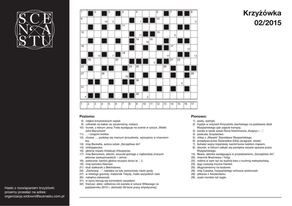 1 2 3 9 14 4 5 6 3 7 8 10 1 9 11 12 13 11 14 16 6 15 16 17 15 18 7 19 28 13 21 5 24 27 12 17 20 23 Krzyżówka 02/2015 25 22 26 29 10 30 8 31 32 4 1 2 3 Poziomo: Hasło z rozwiązaniem krzyżówki prosimy przesłać na adres: [email protected] 4 5 6 7 8 9 2 10 11 12 13 4) odgłos krzyżowanych szpad. 9) człowiek na bakier ze szczerością; matacz. 10) trunek, z którym Jerzy Trela występuje na scenie w sztuce „Wielki John Barrymore”. 11) ... i znajomi królika. 12) chcesz ..., podobaj się mamuni (przysłowie, wpisujemy w mianowniku). 13) imię Becketta, autora sztuki „Szczęśliwe dni” 14) ichtiojajeczka. 16) główne miasto Andaluzji (Hiszpania). 17) imię Barrymore, aktorki, wnuczki jednego z najbardziej znanych aktorów szekspirowskich – Johna. 18) potocznie: bardzo głośna muzyka (ścisz te ...!). 19) imię kanclerz Niemiec. 21) klub siatkarski z Bełchatowa. 24) „Zachowaj ...”, naklejka na tyle samochodu nauki jazdy. 27) w mitologii greckiej: małżonek Tetydy, matki wszystkich rzek. 30) natrętna ciekawość. 31) w życiu kierują się wzniosłymi zasadami. 32) Dariusz, aktor, odtwórca roli wariata w sztuce Witkacego (w październiku 2015 r. obchodzi 30-lecie pracy artystycznej). 14 15 16 17 Pionowo: 1) psoty, wybryki. 2) tryptyk w reżyserii Krzysztofa Jasińskiego na podstawie dzieł Wyspiańskiego (jak zajęcie trampa). 3) kwiaty w tytule sztuki Rona Hutchinsona „Księżyc i ...”. 4) paskuda, brzydactwo. 5) chłop z „Wesela” Stanisława Wyspiańskiego. 6) przepływa przez Świeradów-Zdrój (anagram: siwak). 7) bohater wojny trojańskiej, karmił konie ludzkim mięsem. 8) dworek, w którym odbyło się pamiętne wesele opisane przez Wyspiańskiego. 15) Beata, aktorka występująca w przedstawieniu „Szczęśliwe dni”. 20) imiennik Breżniewa i Teligi. 22) roślina w sam raz na wystrój baru z kuchnią meksykańską. 23) jego czaszkę trzyma Hamlet. 25) długoramienny na budowie. 26) imię Casalsa, hiszpańskiego wirtuoza wiolonczeli. 28) piłkarze z Amsterdamu. 29) ssaki morskie lub żagle.