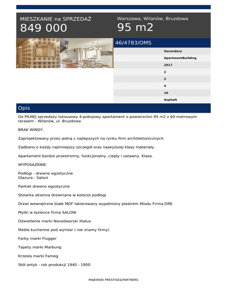 MIESZKANIE na SPRZEDAŻ 849 000 Warszawa, Wilanów, Bruzdowa 95 m2 46/4783/OMS Secondary ApartmentBuilding 2017 2 2 4 10 Asphalt Opis Do PILNEJ sprzedaży luksusowy 4-pokojowy apartament o powierzchni 95 m2 z 60-metrowym tarasem - Wilanów, ul. Bruzdowa BRAK WINDY. Zaprojektowany przez jedną z najlepszych na rynku firm architektonicznych. Zadbano o każdy najmniejszy szczegół oraz najwyższej klasy materiały. Apartament bardzo przestronny, funkcjonalny, ciepły i ustawny. Klasa. WYPOSAŻENIE: Podłogi - drewno egzotyczne Glazura - Saloni Parkiet drewno egzotyczne Stolarka okienna drewniana w kolorze podłogi Drzwi wewnętrzne białe MDF lakierowany wypełniony plastrem Miodu Firma DRE Płytki w łazience firma SALONI Oświetlenie marki Novodworski iItalux Meble kuchenne pod wymiar ( nie znamy firmy) Farby marki Flugger Tapety marki Marbung Krzesła marki Fameg Stół antyk - rok produkcji 1940 - 1950 MAJEWSKI PRESTIGE&PARTNERS Cegła na kominku firma ELKAMINO Łóżko tapicerowane na zamówienie Sofa Ikea AGD - zmywarka bosch , lodówka samsung , mikrofaka electroluz , piekarnik whirpool , płyta ceramiczna whirpool , okap AKPO blaty granitowe Zlew Franke wanna firma KOŁO armatura Franke i Deante Po kompleksowym remoncie w styczniu 2017. Zupełnie nowe świeże wnętrze. Składa się z - 3 sypialni ( 10 m2 , 13 m2 , 15 m2) , - duży hol , - dwie łazienki ( jedna z dużą 190 cm wanną oraz prysznicem z deszczownicą) ( druga mniejsza dla gości ze specjalnie wydzielonym oddzielnie miejscem na pralnię). - duży salon z prawdziwym kominkiem. - adalnia mieszcząca stół na 12 osób. - owoczesna kuchnia z granitowymi blatami. - oddzielne pomieszczenie stanowiące garderobę. Apartament ma wyjście na własny duży ok.60m2 taras na dachu. Idealne miejsce na grilla i przyjęcia. Taras bardzo intymny dający wiele komfortu i dyskrecji. Osiedle zamknięte z okien piękny widok na zieleń. Cisza i spokój. Czynsz administracyjny - 950 zł ze wszystkimi zaliczkami na media. DODATKOWO Przynależy miejsce garażowe w hali podziemnej oraz komórka lokatorska (w cenie). Wolne od zaraz. Gotowe do wprowadzenia. Cena - 849000 tyś zł. NA ŻYCZENIE dysponujemy dużą ilością zdjęć oraz planami. Polecamy i zapraszamy na prezentację, Marlena Okonkowska +48 570 58 59 58, e-mail: [email protected] Artur Majewski +48 792 929 235 e-mail: [email protected] Artur Sebastian Majewski tel. 792929235 tel. 501585958 MAJEWSKI PRESTIGE&PARTNERS email: [email protected] MAJEWSKI PRESTIGE&PARTNERS Powered by TCPDF (www.tcpdf.org)