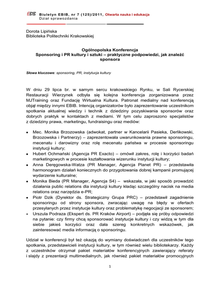 Biu le t yn EB IB , nr 7 ( 12 5) /2 0 11 , Otwarta nauka i edukacja D zi a ł s pr a wo zd a n i a Dorota Lipińska Biblioteka Politechniki Krakowskiej Ogólnopolska Konferencja Sponsoring i PR kultury i sztuki – praktyczne podpowiedzi, jak znaleźć sponsora Słowa kluczowe: sponsoring, PR, instytucja kultury W dniu 29 lipca br. w samym sercu krakowskiego Rynku, w Sali Rycerskiej Restauracji Wierzynek odbyła się kolejna konferencja zorganizowana przez MJTraining oraz Fundację Wirtualna Kultura. Patronat medialny nad konferencją objął między innymi EBIB. Intencją organizatorów było zaprezentowanie uczestnikom spotkania aktualnej wiedzy i technik z dziedziny pozyskiwania sponsorów oraz dobrych praktyk w kontaktach z mediami. W tym celu zaproszono specjalistów z dziedziny prawa, marketingu, fundraisingu oraz mediów: Mec. Monika Brzozowska (adwokat, partner w Kancelarii Pasieka, Derlikowski, Brzozowska i Partnerzy) – zaprezentowała uwarunkowania prawne sponsoringu, mecenatu i darowizny oraz rolę mecenatu państwa w procesie sponsoringu instytucji kultury; Hubert Ochmański (Agencja PR Exacto) – omówił zakres, rolę i korzyści badań marketingowych w procesie kształtowania wizerunku instytucji kultury; Anna Deręgowska-Watza (PR Manager, Agencja Planet PR) – przedstawiła harmonogram działań koniecznych do przygotowania dobrej kampanii promującej wydarzenie kulturalne; Monika Bieda (PR Manager, Agencja S4) – wskazała, w jaki sposób prowadzić działania public relations dla instytucji kultury kładąc szczególny nacisk na media relations oraz narzędzia e-PR; Piotr Dzik (Dyrektor ds. Strategiczny Grupa PRC) – przedstawił zagadnienie sponsoringu od strony sponsora, zwracając uwagę na błędy w ofertach przesyłanych przez instytucje kultury oraz problematykę negocjacji ze sponsorem; Urszula Podraza (Ekspert ds. PR Kraków Airport) – podjęła się próby odpowiedzi na pytanie: czy firmy chcą sponsorować instytucje kultury i czy widzą w tym dla siebie jakieś korzyści oraz dała szereg konkretnych wskazówek, jak zainteresować media informacją o sponsoringu. Udział w konferencji był też okazją do wymiany doświadczeń dla uczestników tego spotkania, przedstawicieli instytucji kultury, w tym również wielu bibliotekarzy. Każdy z uczestników otrzymał pakiet materiałów konferencyjnych zawierający referaty i slajdy z prezentacji multimedialnych, jak również pakiet materiałów promocyjnych 1 Biu le t yn EB IB , nr 7 ( 12 5) /2 0 11 , Otwarta nauka i edukacja D zi a ł s pr a wo zd a n i a związanych z poruszanymi tematami. Zaangażowanie prelegentów, ich otwartość oraz bieżące reagowanie na pytania i kwestie poruszane przez uczestników konferencji wraz z zapewnieniem przez organizatorów bardzo dobrych warunków organizacyjnych zagwarantowało wysoki poziom merytoryczny obrad. Informacje o kolejnych konferencjach z cyklu Wirtu@lna Kultura można znaleźć na stronie: http://www.wirtualnakultura.pl/konferencje.html. Lipińska, D. Ogólnopolska Konferencja Sponsoring i PR kultury i sztuki – praktyczne podpowiedzi, jak znaleźć sponsora. W: Biuletyn EBIB [online] 2011, nr 7 (125), Otwarta nauka i edukacja [Dostep: 15.10.2011] Dostępny w World Wide Web: http://www.nowyebib.info/images/stories/numery/125/125_lipinska.pdf. ISSN 1507-7187. 2