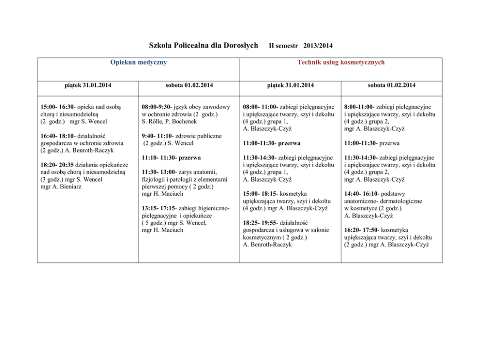 Szkoła Policealna dla Dorosłych Opiekun medyczny piątek 31.01.2014 sobota 01.02.2014 15:00- 16:30- opieka nad osobą chorą i niesamodzielną (2 godz.) mgr S. Wencel 08:00-9:30- język obcy zawodowy w ochronie zdrowia (2 godz.) S. Rölle, P. Bochenek 16:40- 18:10- działalność gospodarcza w ochronie zdrowia (2 godz.) A. Benroth-Raczyk 9:40- 11:10- zdrowie publiczne (2 godz.) S. Wencel 11:10- 11:30- przerwa 18:20- 20:35 działania opiekuńcze nad osobą chorą i niesamodzielną (3 godz.) mgr S. Wencel mgr A. Bieniarz 11:30- 13:00- zarys anatomii, fizjologii i patologii z elementami pierwszej pomocy ( 2 godz.) mgr H. Maciuch 13:15- 17:15- zabiegi higienicznopielęgnacyjne i opiekuńcze ( 5 godz.) mgr S. Wencel, mgr H. Maciuch II semestr 2013/2014 Technik usług kosmetycznych piątek 31.01.2014 sobota 01.02.2014 08:00- 11:00- zabiegi pielęgnacyjne i upiększające twarzy, szyi i dekoltu (4 godz.) grupa 1, A. Blaszczyk-Czyż 8:00-11:00- zabiegi pielęgnacyjne i upiększające twarzy, szyi i dekoltu (4 godz.) grupa 2, mgr A. Blaszczyk-Czyż 11:00-11:30- przerwa 11:00-11:30- przerwa 11:30-14:30- zabiegi pielęgnacyjne i upiększające twarzy, szyi i dekoltu (4 godz.) grupa 1, A. Blaszczyk-Czyż 11:30-14:30- zabiegi pielęgnacyjne i upiększające twarzy, szyi i dekoltu (4 godz.) grupa 2, mgr A. Blaszczyk-Czyż 15:00- 18:15- kosmetyka upiększająca twarzy, szyi i dekoltu (4 godz.) mgr A. Blaszczyk-Czyż 14:40- 16:10- podstawy anatomiczno- dermatologiczne w kosmetyce (2 godz.) A. Blaszczyk-Czyż 18:25- 19:55- działalność gospodarcza i usługowa w salonie kosmetycznym ( 2 godz.) A. Benroth-Raczyk 16:20- 17:50- kosmetyka upiększająca twarzy, szyi i dekoltu (2 godz.) mgr A. Blaszczyk-Czyż